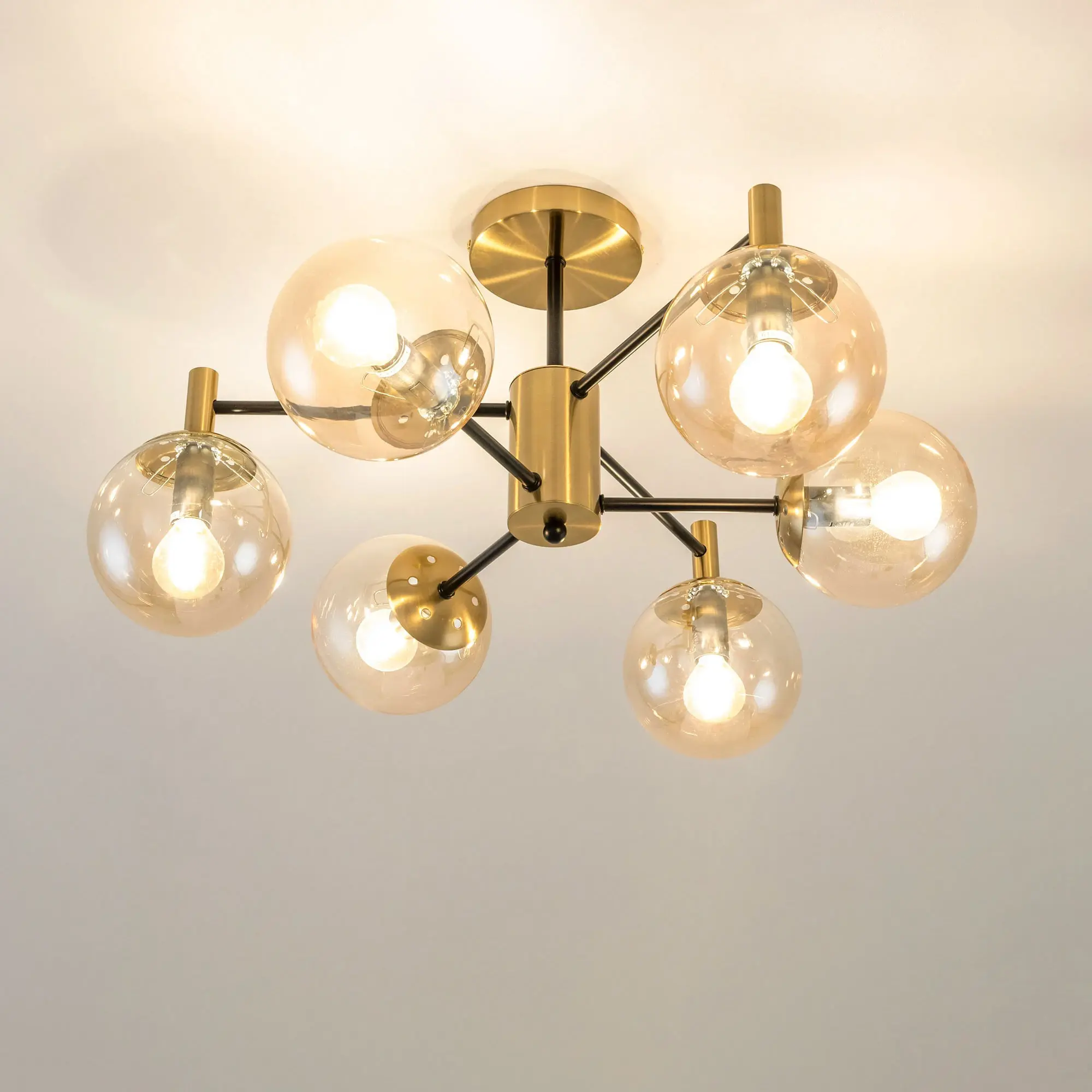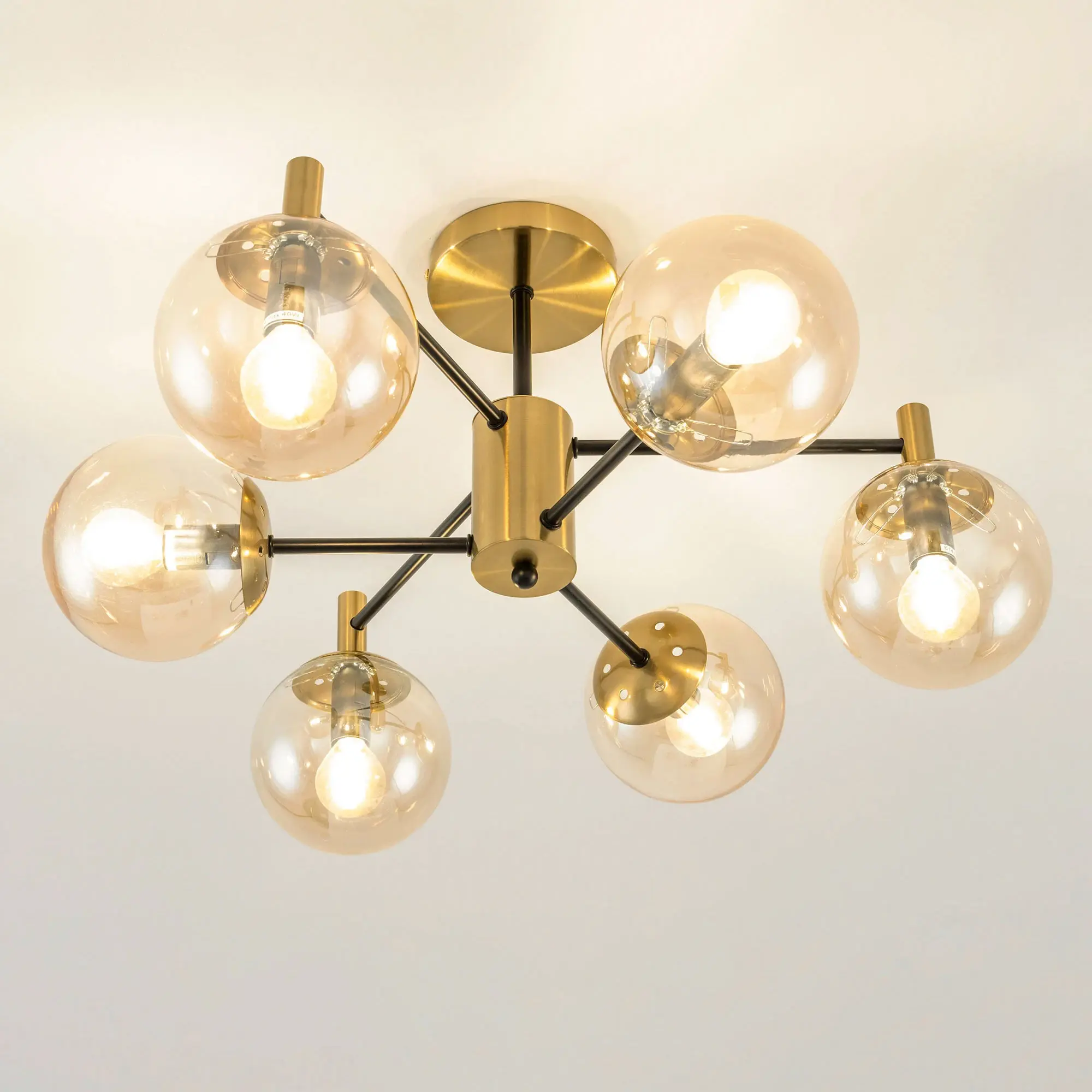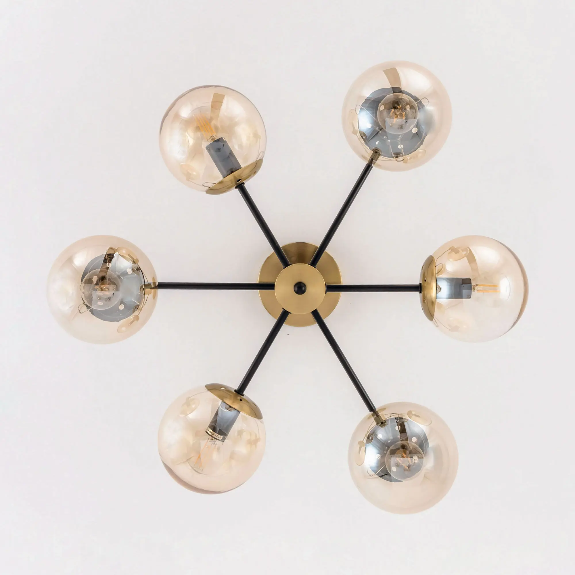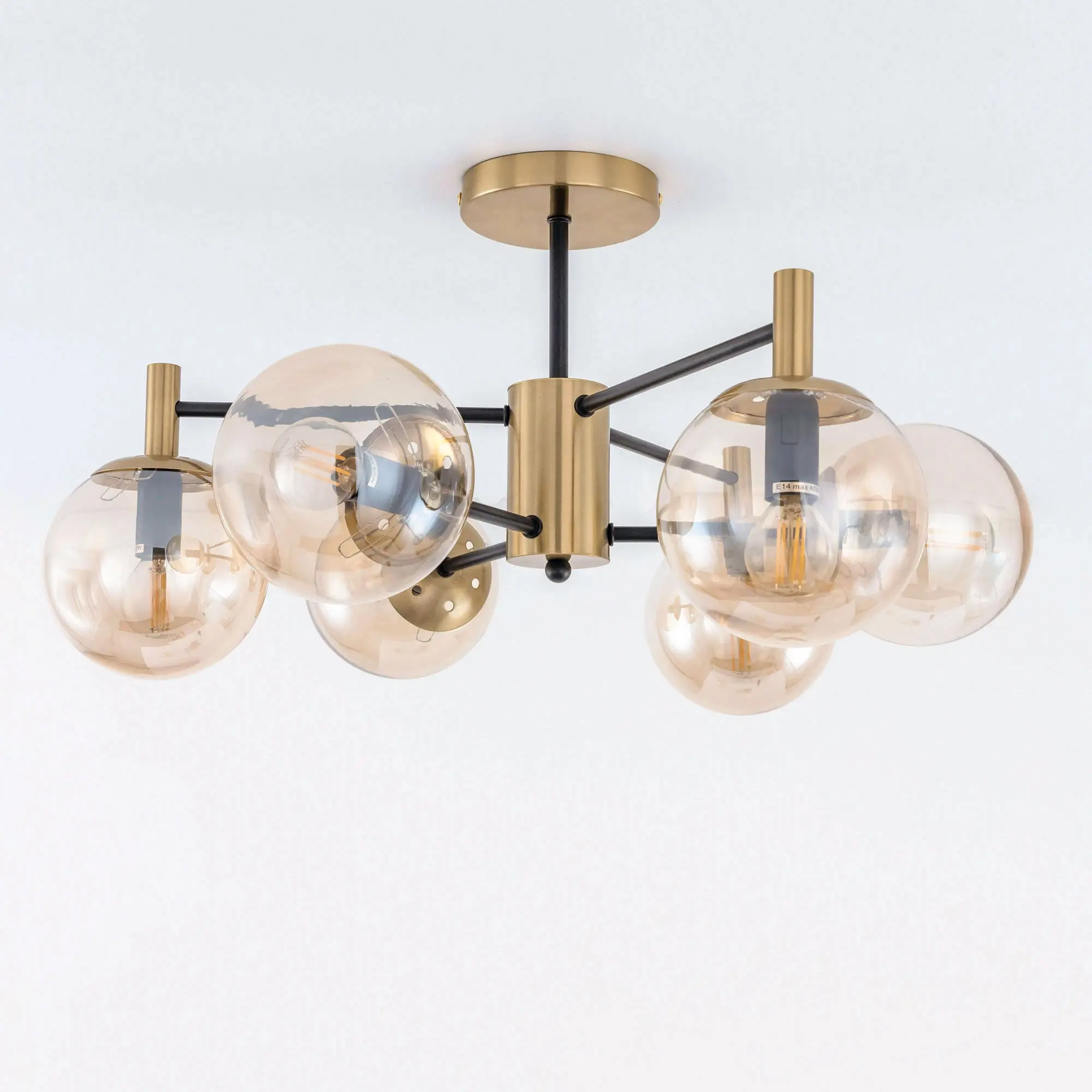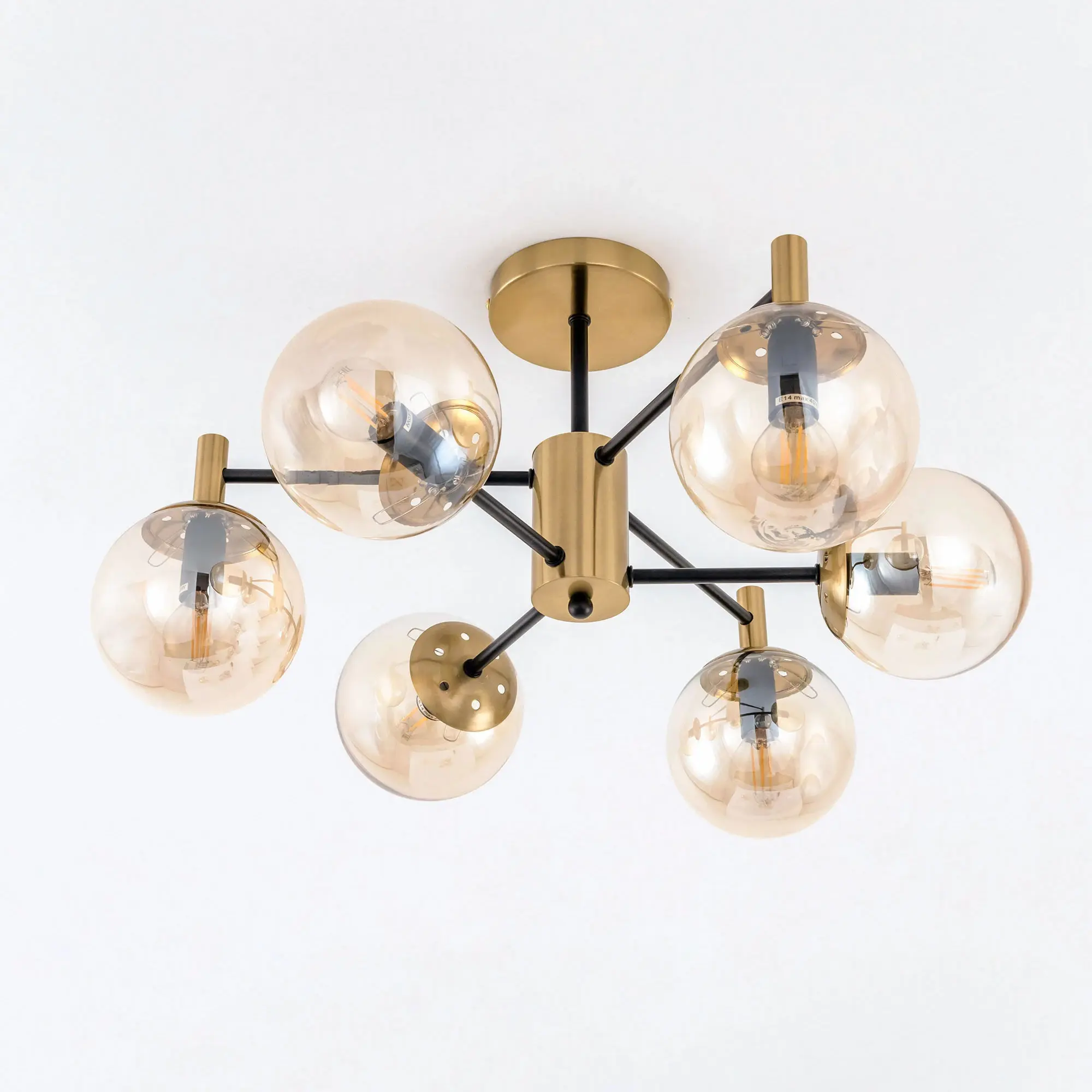 Стильная потолочная люстра Citilux Шарлиз CL143163 для модных интерьеров. Корпус светильника металлический, бронзового цвета, с декоративными чёрными элементами. Основание круглое, рожки-штанги расположены параллельно потолку. Плафоны в форме шара изготовлены из прозрачного стекла светло-янтарного оттенка. В изделии используются лампы с цоколем Е14, максимальной мощностью для ламп накаливания 40Вт. Светодиодные лампы можно устанавливать более яркие. Подходит для всех типов потолков, в том числе натяжных, тип крепления – планка. Шестирожковая люстра Citilux Шарлиз CL143163 ярко осветит площадь около 16м².