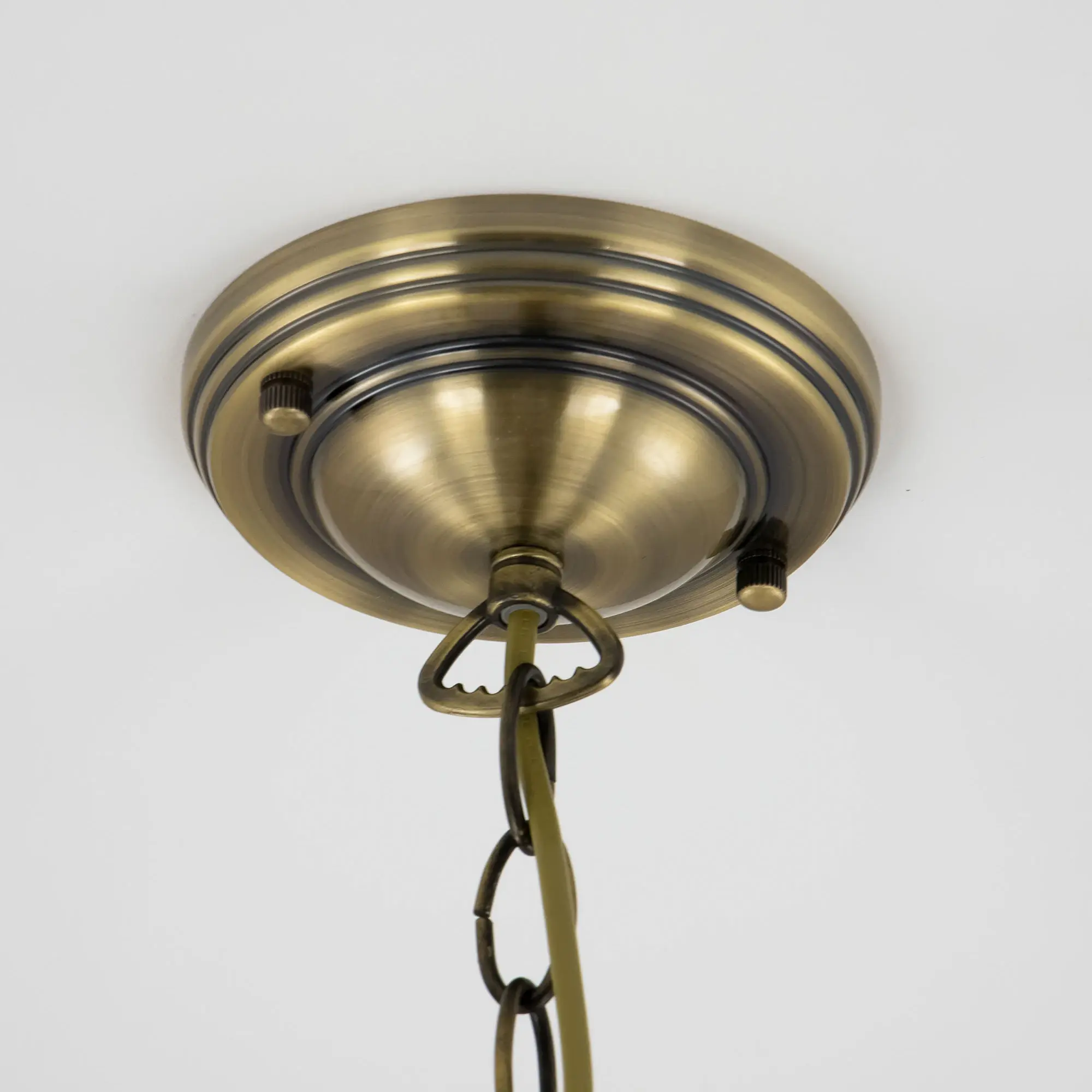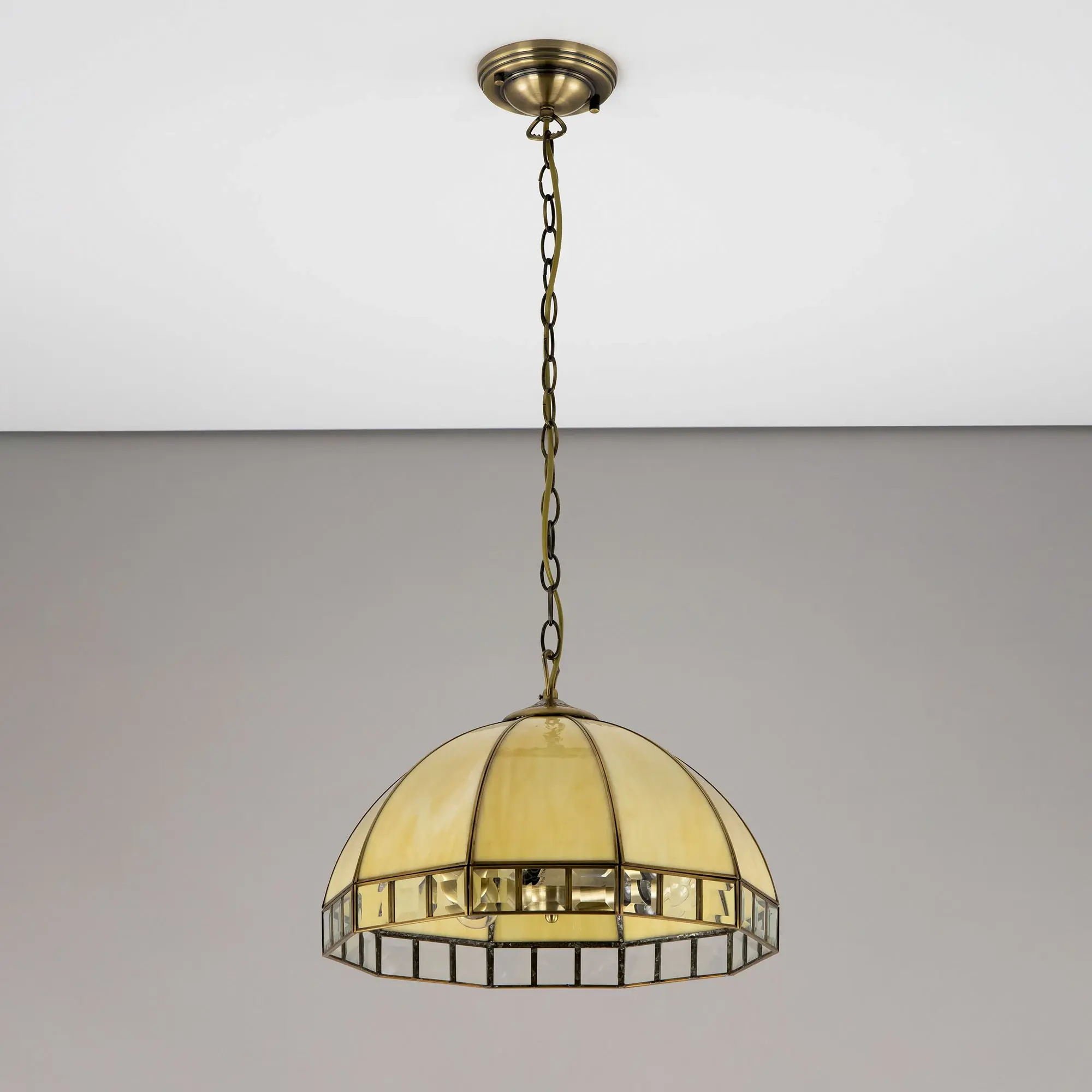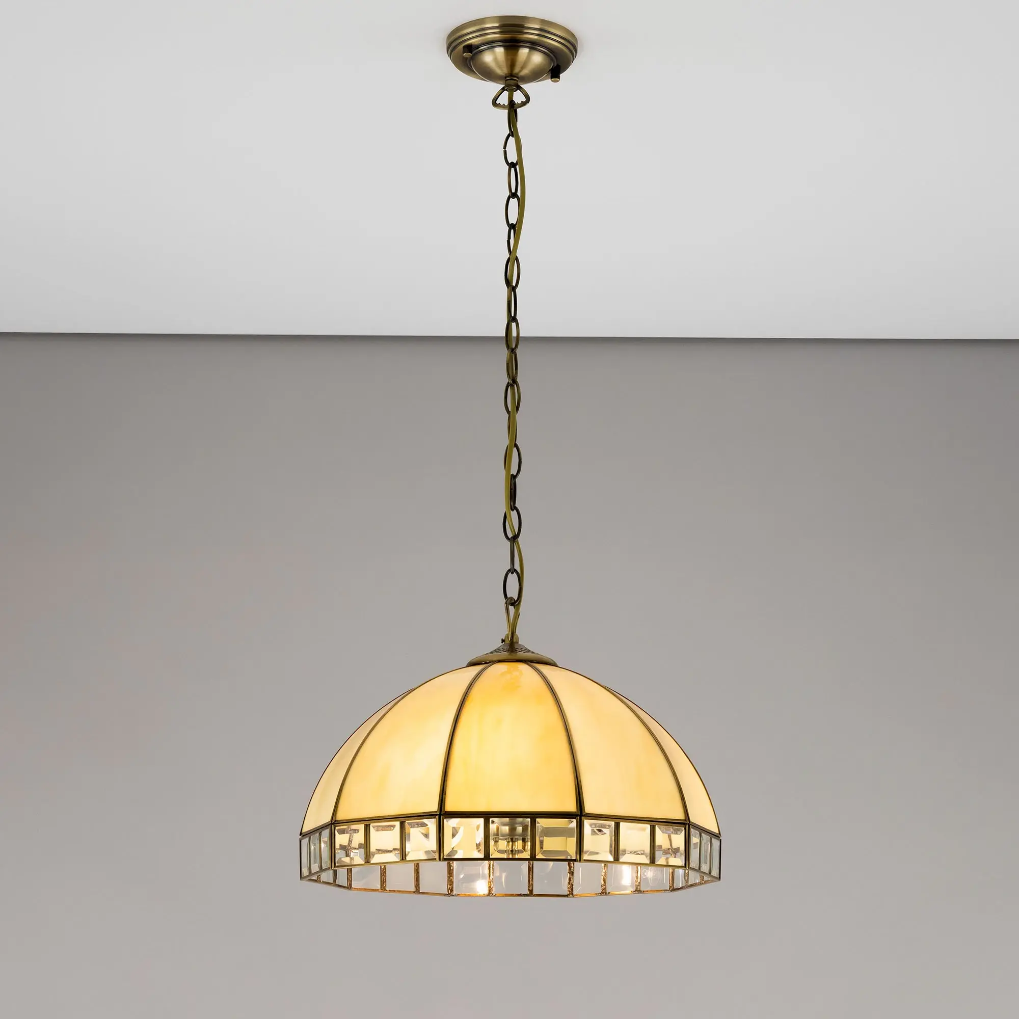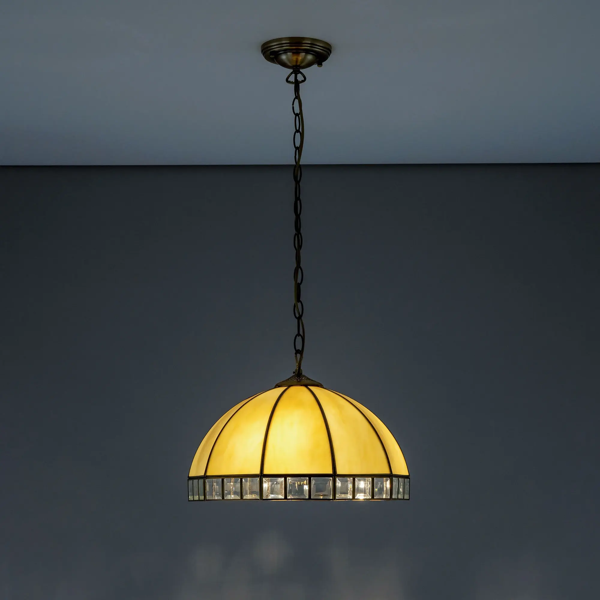 Каркас люстры металлический, оттенка старая бронза. Плафон изготовлен вручную из витражного стекла бежевого цвета, по краю украшен рядом прозрачных элементов.