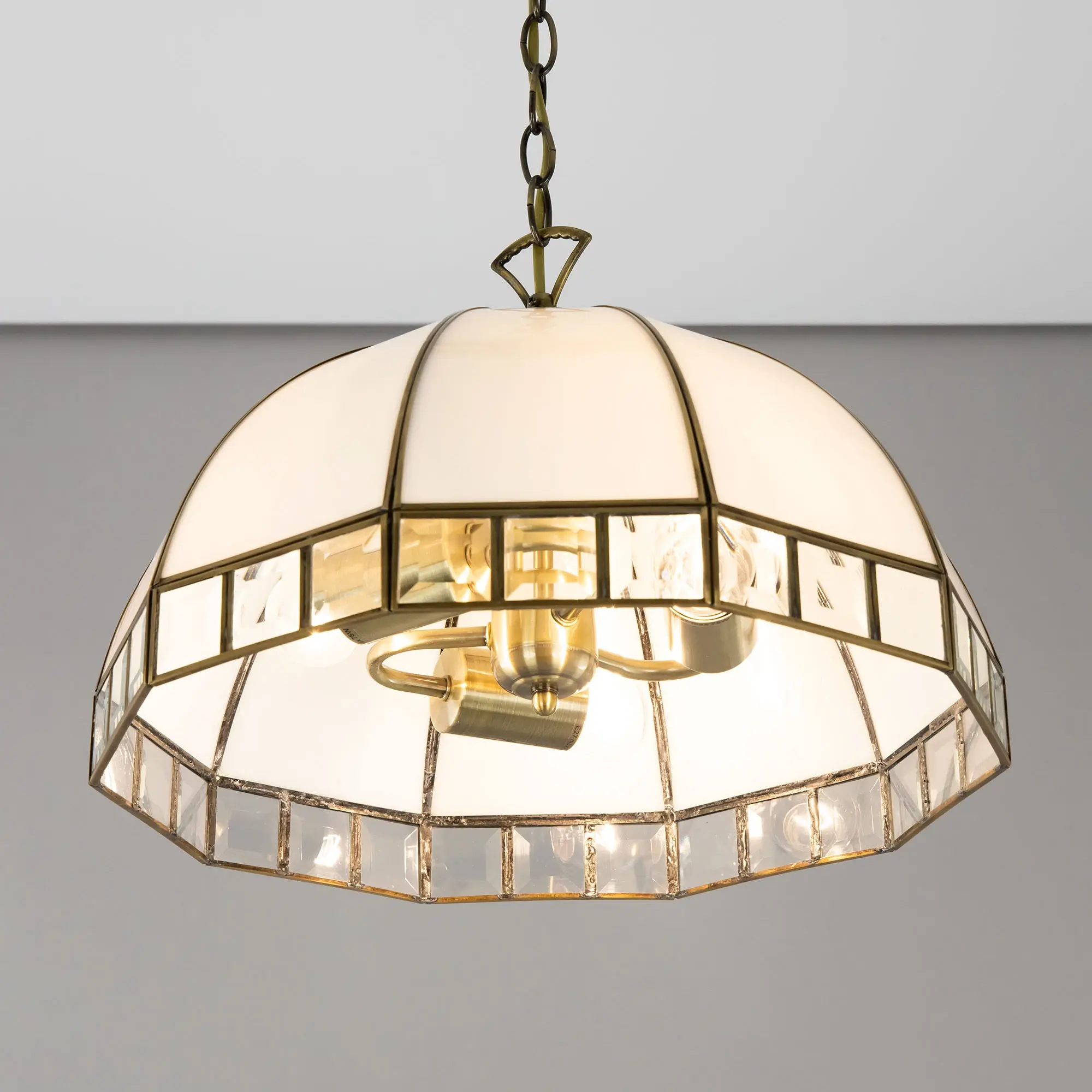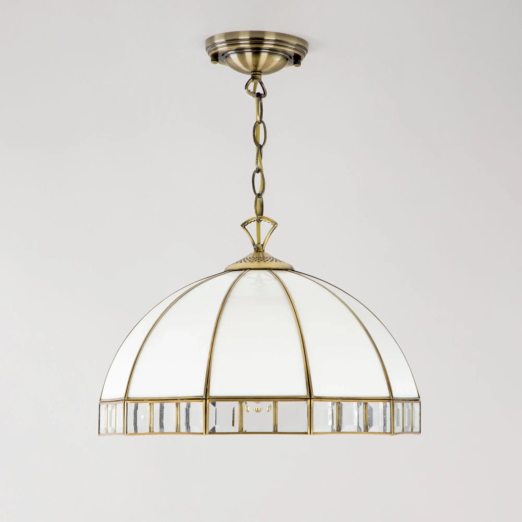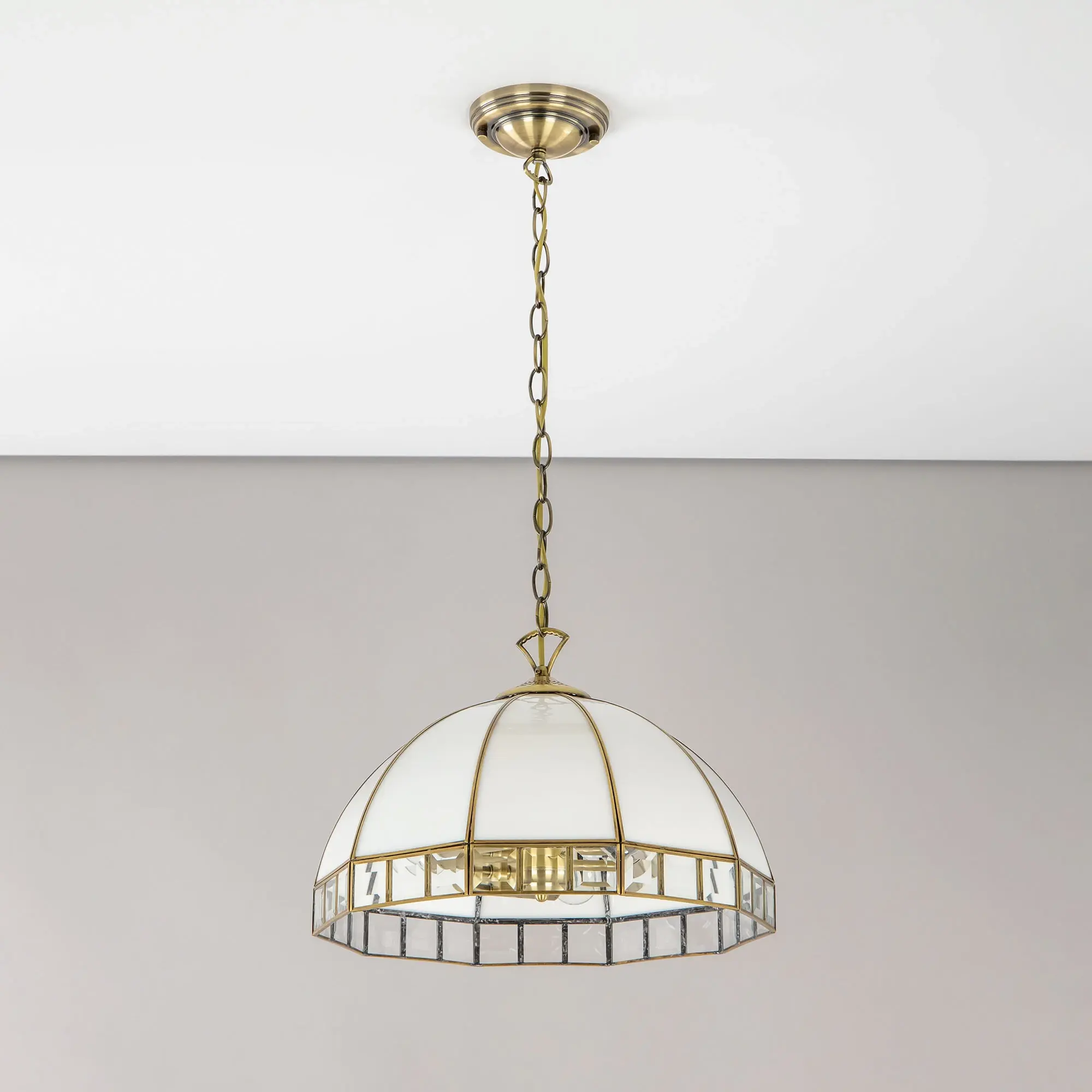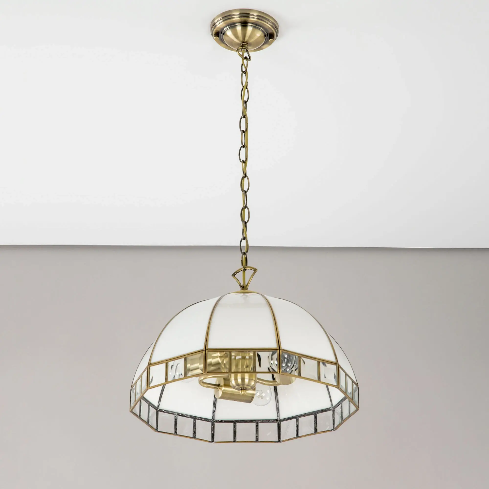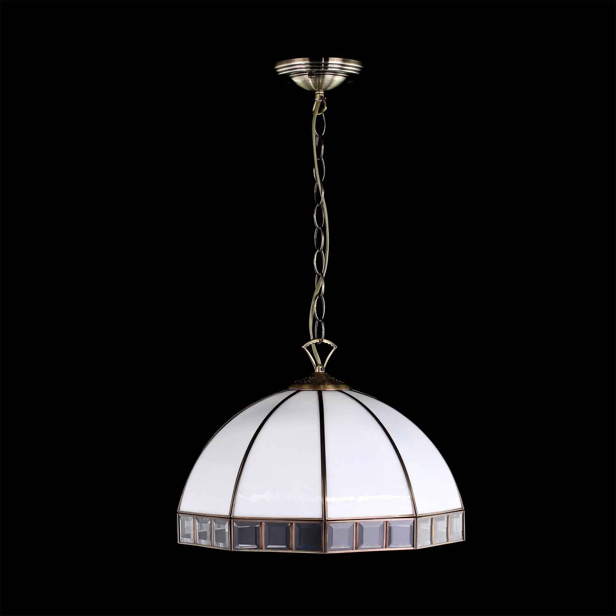 Подвесная люстра Citilux Шербург-1 CL440132 в стиле Тиффани. Основание металлическое, цвет бронза. Плафон ручной работы, изготовлен из витражного стекла белого цвета с декоративными прозрачными элементами. В изделии 3 лампы Е27 мощностью 75Вт. Высота светильника регулируется при установке, в диапазоне от 36,5см до 1,1м, диаметр 40см, осветит около 11м². Тип крепления – планка,