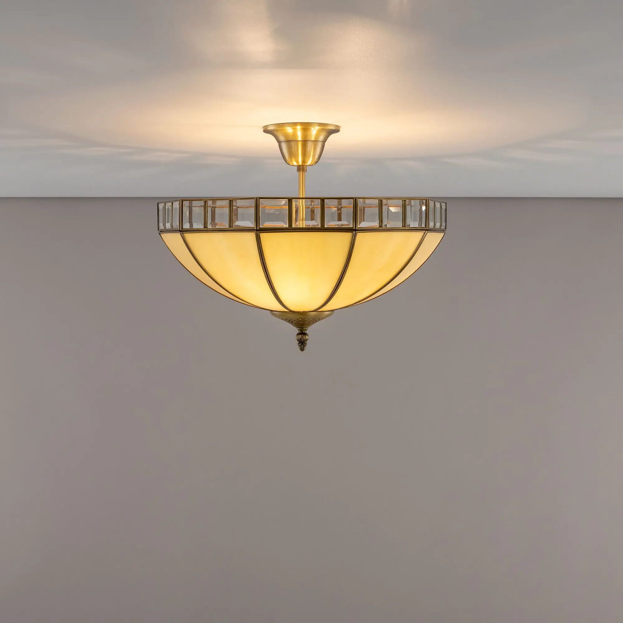 Потолочный светильник на небольшой штанге Citilux Шербург-1 CL440141 в стиле Тиффани. Основание металлическое, цвет бронза. Плафон изготовлен из витражного стекла бежевого цвета с декоративными прозрачными элементами. В изделии 3 лампы с цоколем Е27, максимальной мощностью для ламп накаливания 75Вт. Светодиодные лампы можно использовать более яркие. Высота изделия 33см, диаметр 41см, осветит около 11м². Тип крепления – на крючок. Люстра Citilux Шербург-1 CL440141 подойдет практически для любого интерьера, от классики до модерна,
