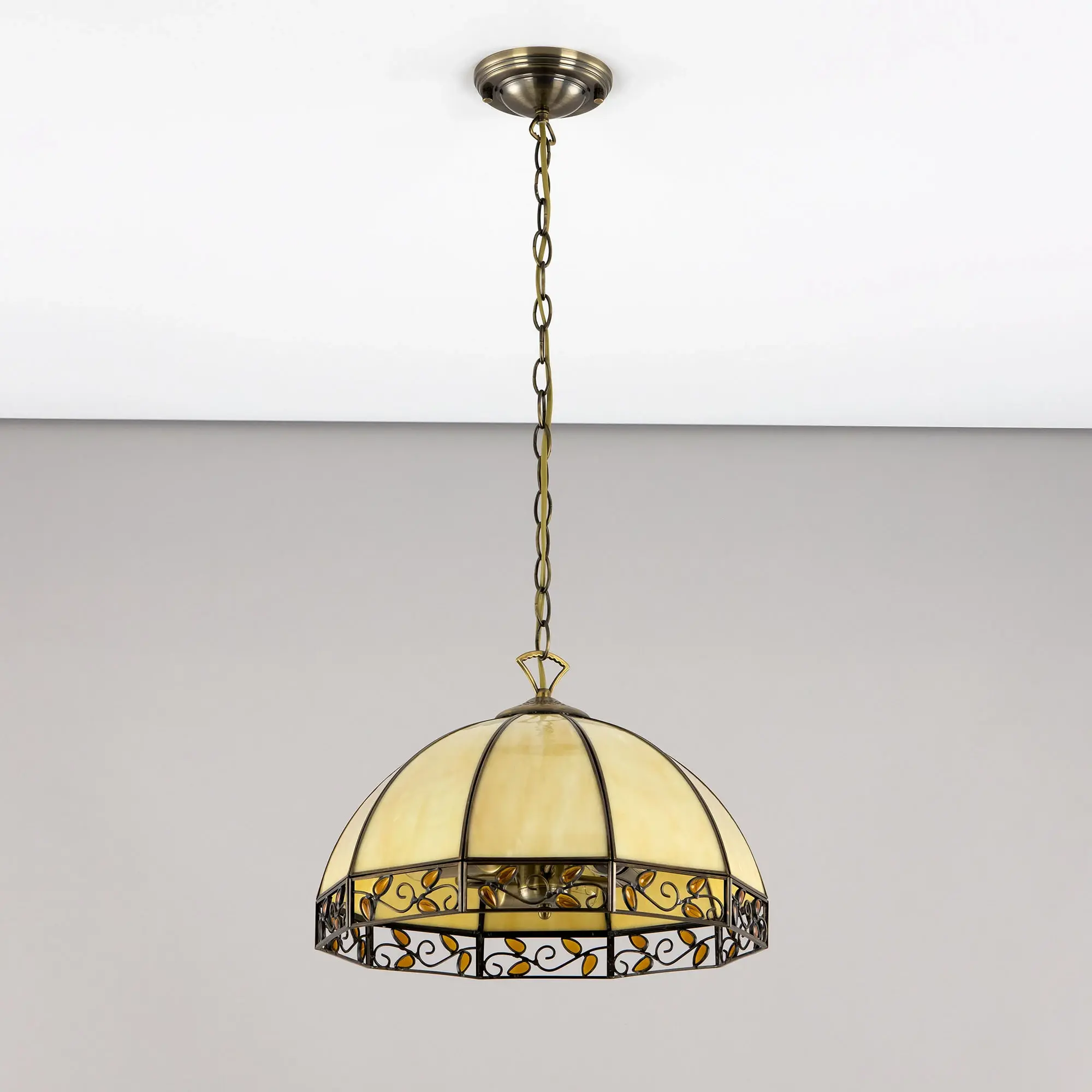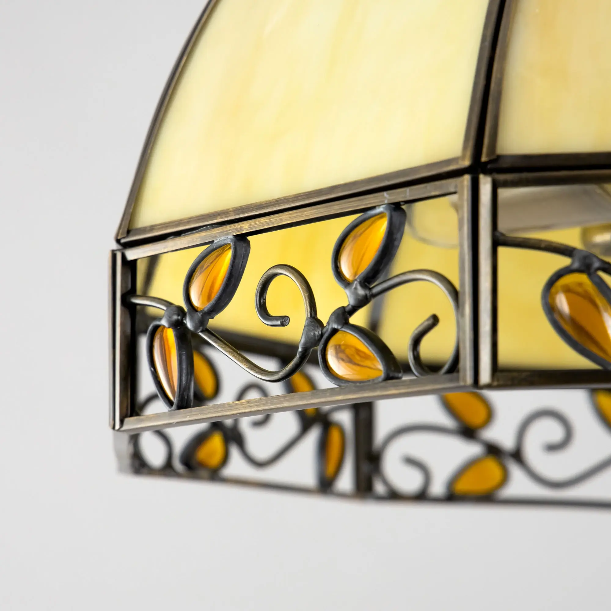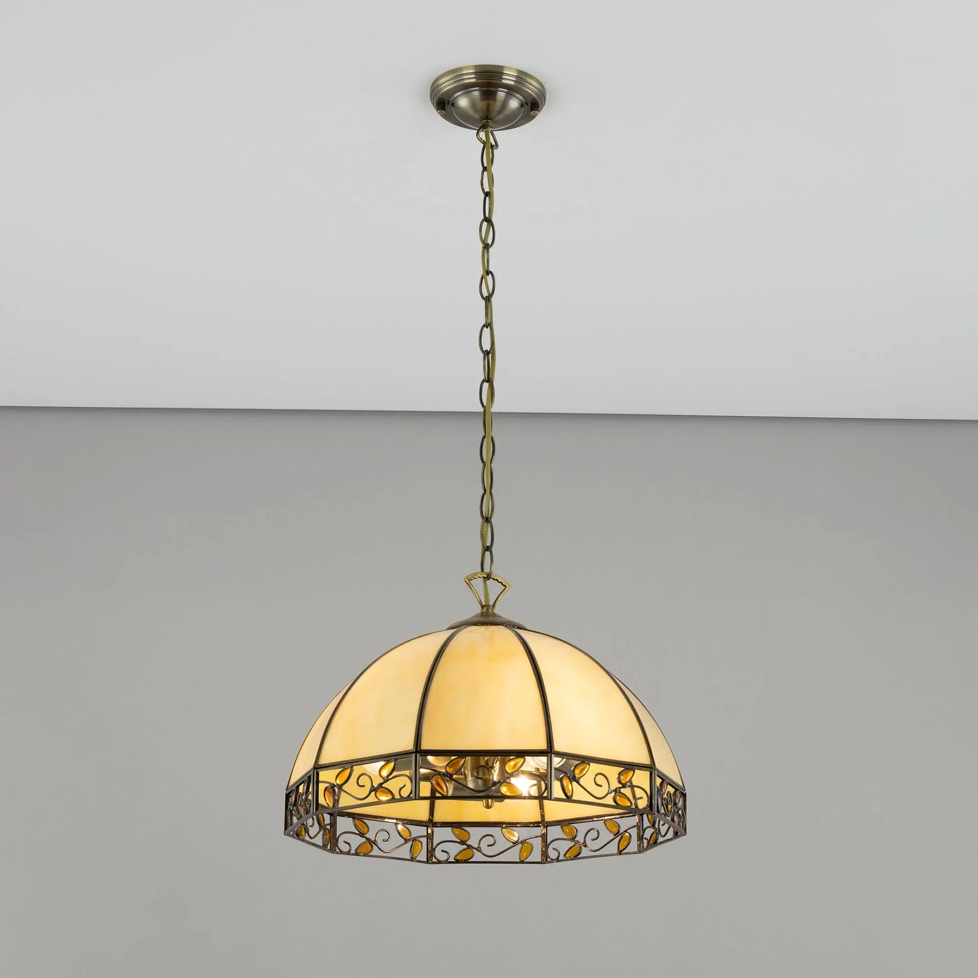 Подвесная люстра Citilux Шербург-2 CL440231 в стиле Тиффани. Основание металлическое, цвет бронза. Плафон ручной работы, изготовлен из витражного стекла бежевого цвета с декоративными янтарными элементами. В изделии 3 лампы Е27 мощностью 75Вт. Светодиодные лампы можно использовать более яркие. Высота светильника регулируется при установке в диапазоне от 36,5см до 1,1м, диаметр 40см, осветит около 11м². Тип крепления – планка,