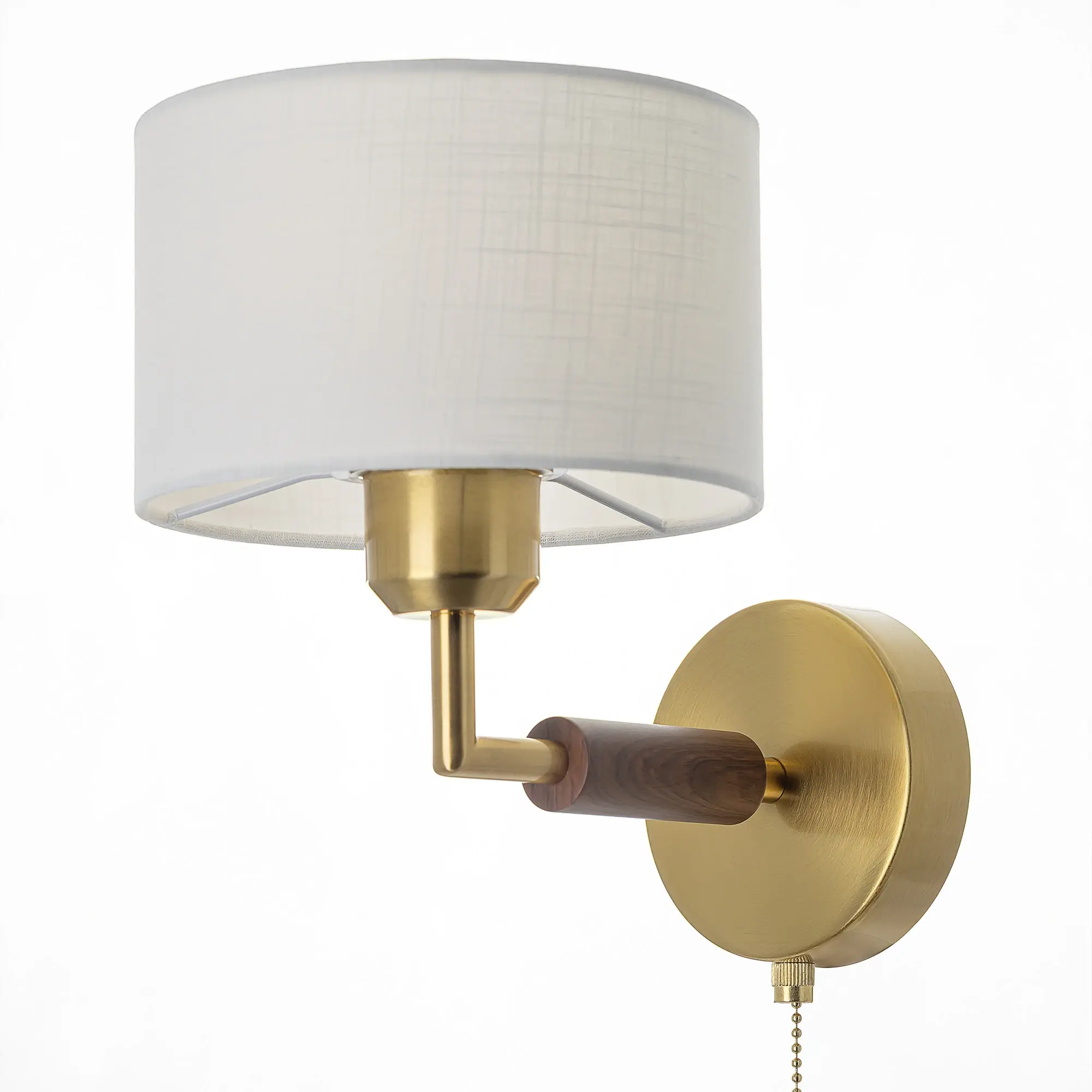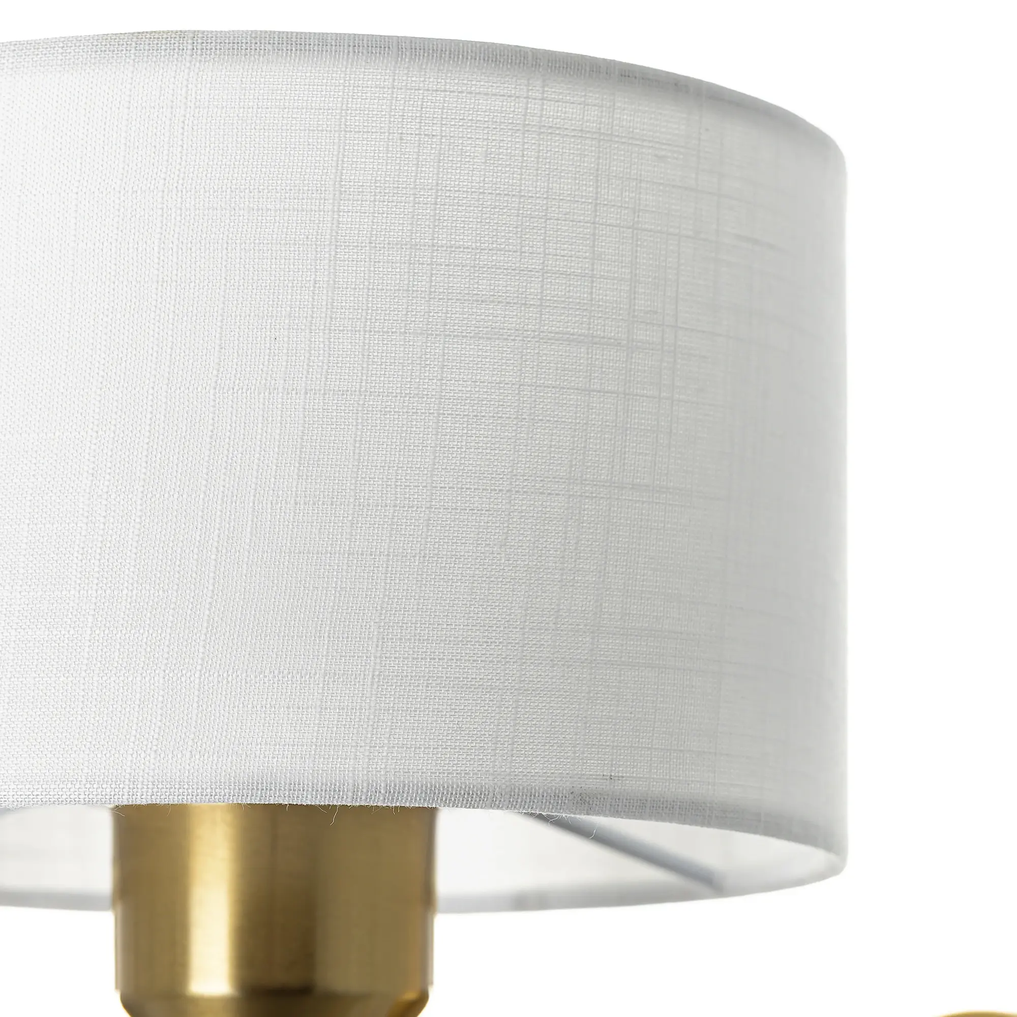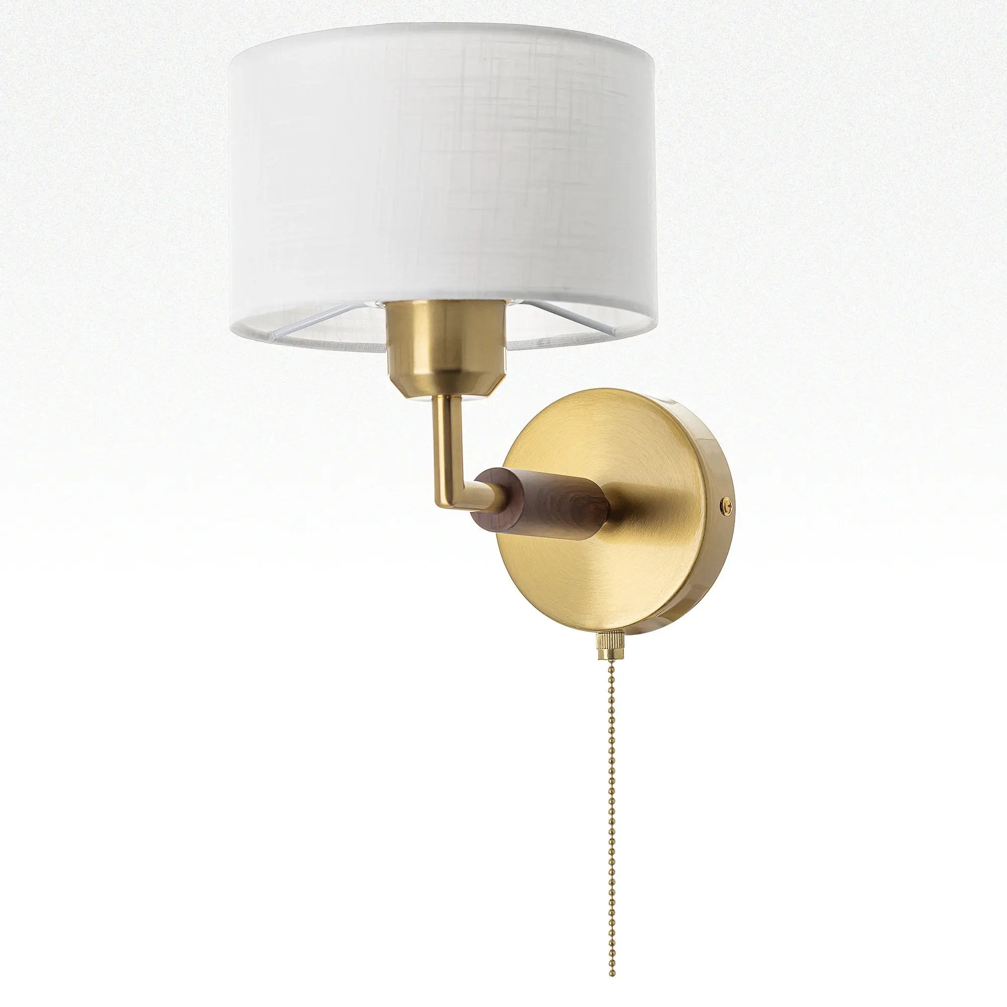 Бронзовый металлический каркас с декоративными элементами с текстурой под дерево. Один рожок с абажуром в форме цилиндра, изготовленного из молочно-белой ткани с чуть шероховатой текстурой.