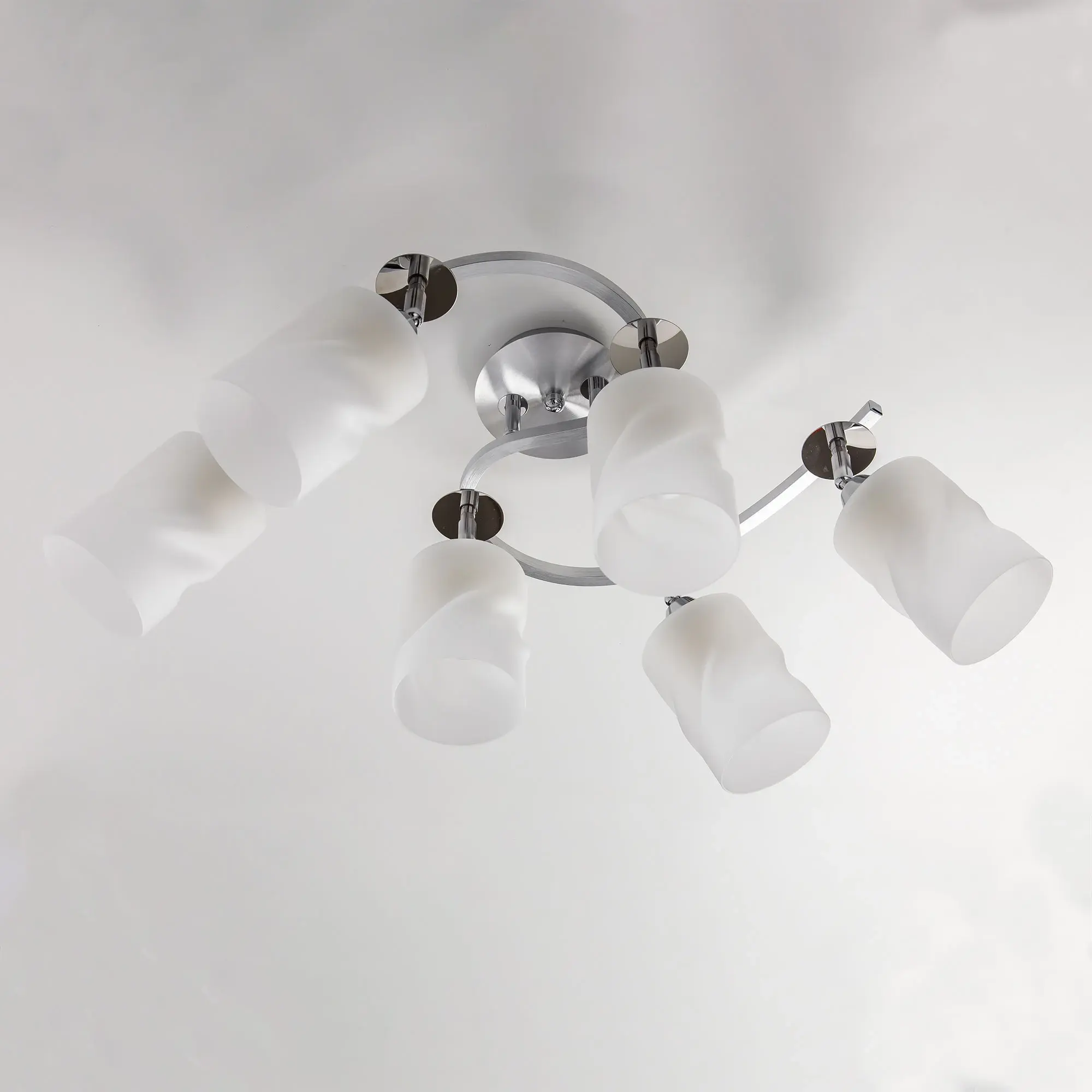 Потолочная шестирожковая люстра Сиерра CL119260 изогнутой формы. Корпус светильника с круглым основанием металлический, цвет алюминий с декоративными элементами цвета хром. Плафоны стеклянные белые матовые цилиндрической формы. Конструкция светильника позволяет поворачивать плафоны в разные стороны, направлять их вниз или в бок. Люстра подойдет для всех типов потолков, в том числе натяжных. Тип крепления – планка. В модели используются 6 ламп с цоколем Е27 и максимальной мощностью для ламп накаливания 75Вт. Светильник рассчитан на работу как с одноклавишным, так и с двухклавишным выключателями. Площадь освещения около 19 кв. метров. Люстра отлично подходит для освещения пространств, оформленных в современном стиле.