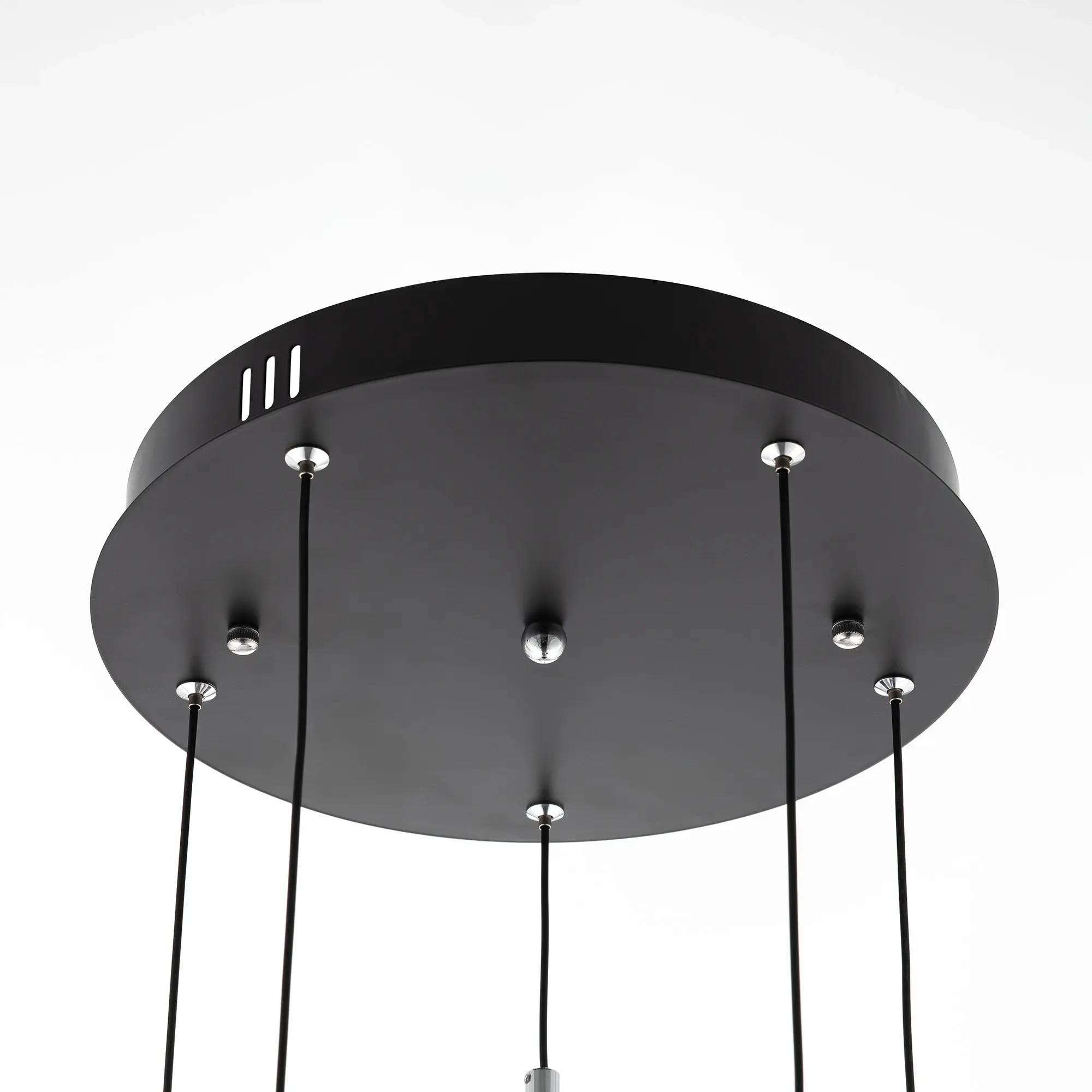 Корпус изделия из металлического сплава, матового черного цвета. Пять закрытых плафонов овальной формы, из дымчатого стекла. Источником света служат встроенные светодиоды с цветовой температурой 3000К, общая мощность светильника составляет 25Вт. Мягкое освещение без мерцания и пульсаций не вредит зрению и не утомляет глаза.