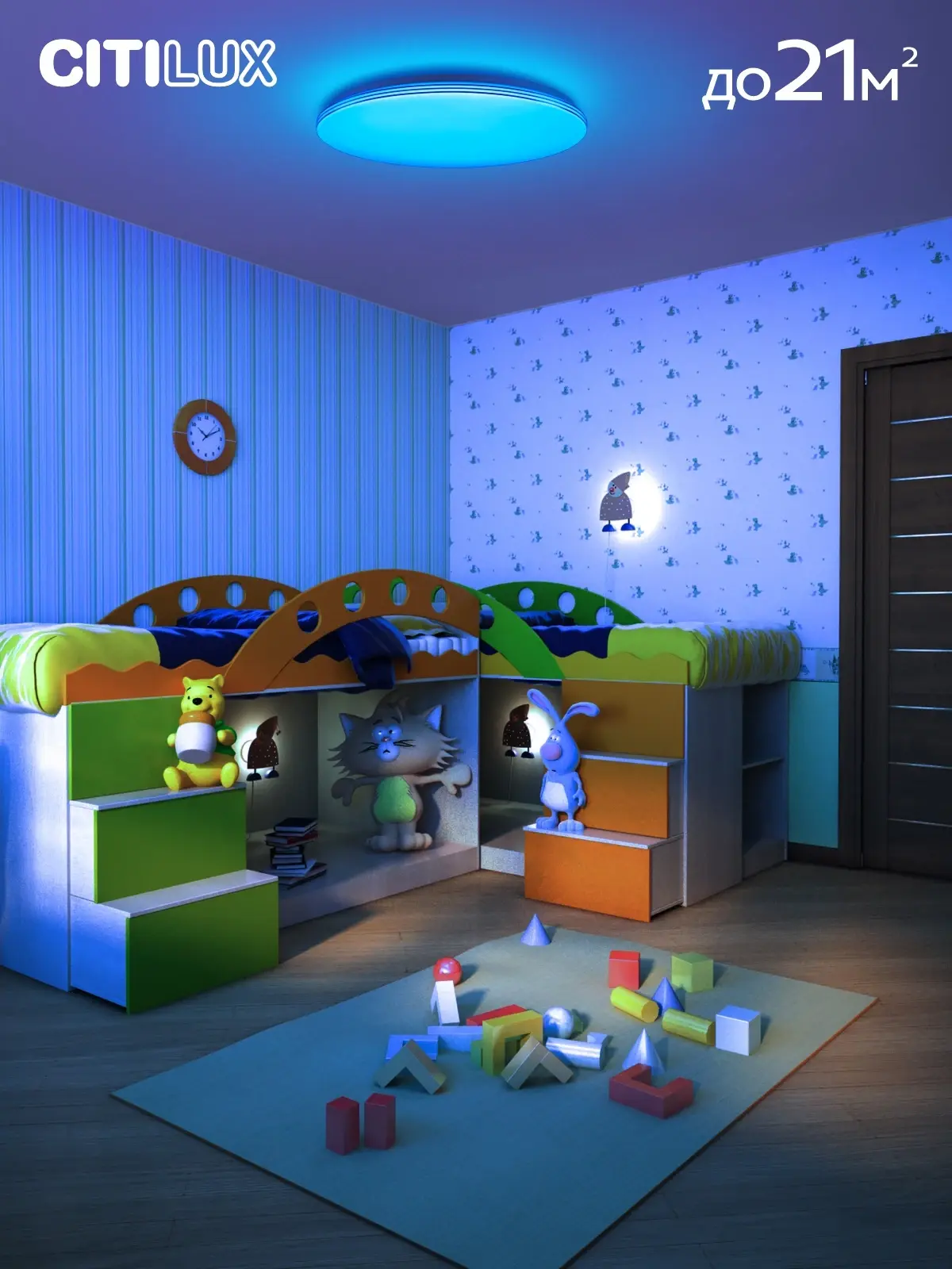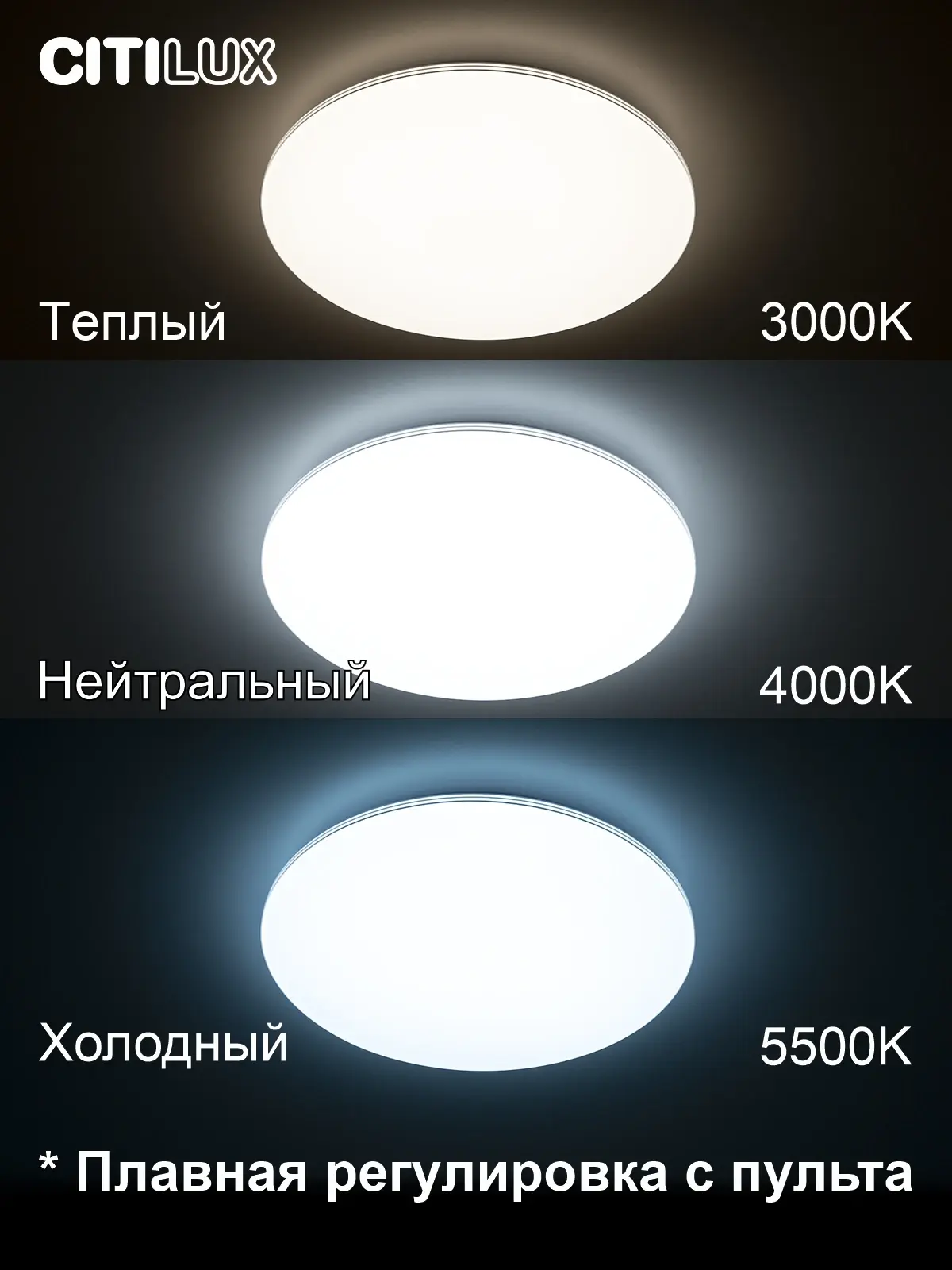Светодиодная потолочная люстра Citilux Симпла CL714680G с яркой цветной RGB подсветкой всего плафона. Светильник плоский, круглой формы. Основание металлическое, плафон белый матовый из оптического полимера, с изящной хромированной окантовкой. Мощность 68Вт, световой поток 5800Лм. Модель с пультом дистанционного управления. Доступна плавная регулировка яркости от 100 до 10%. Плавная регулировка цветовой температурой освещения в диапазоне от 3000К до 5500К, позволяет настроить любые оттенки теплого, нейтрального или холодного света. Цветная RGB подсветка имеет различные режимы работы. Таймер - функция отсроченного на 20сек. выключения. Четыре кнопки памяти позволяют сохранить настроенные режимы работы и включать их с пульта или обычным настенным выключателем. Пульт ДУ инфракрасный в комплекте, тип батареек ААА (батарейками не комплектуется),