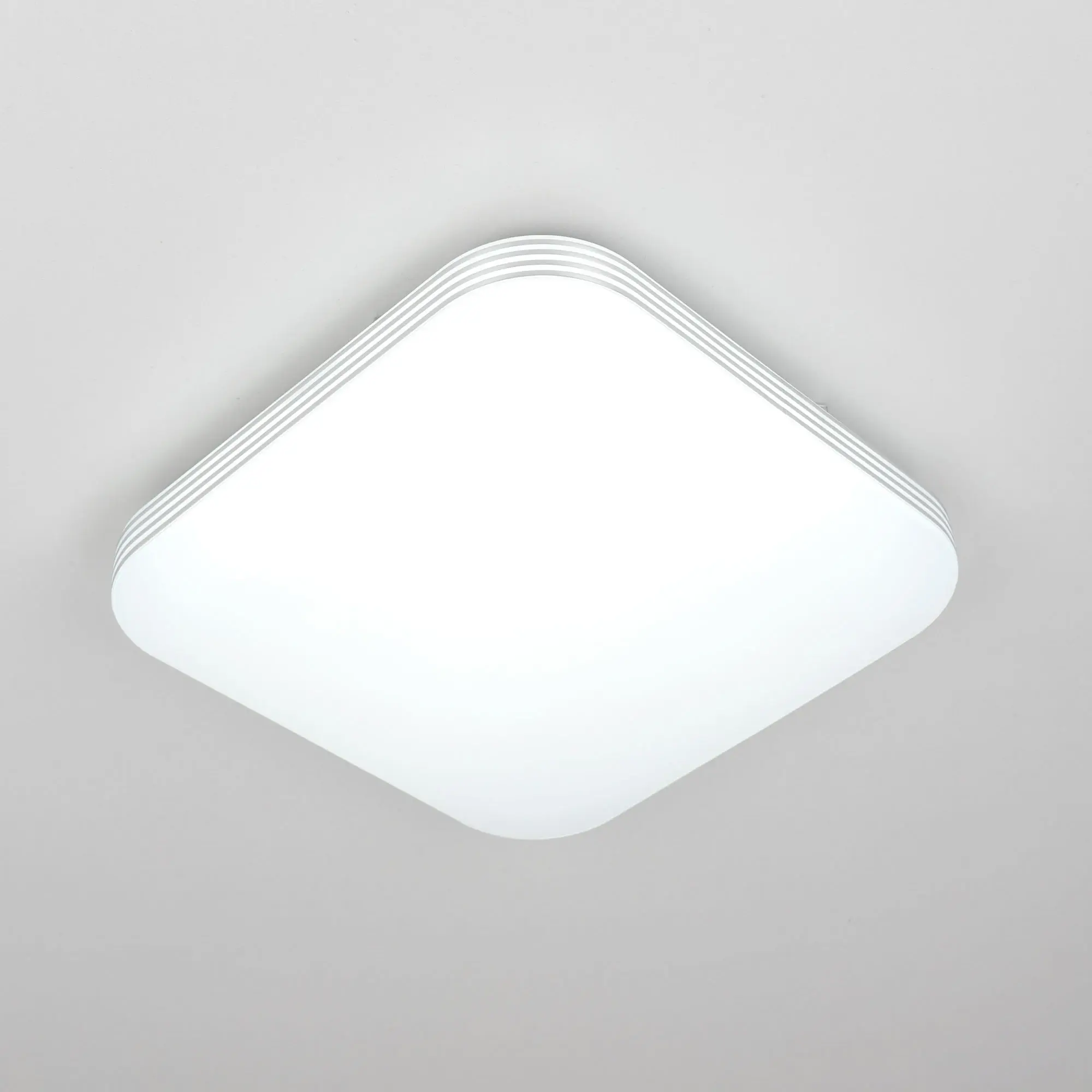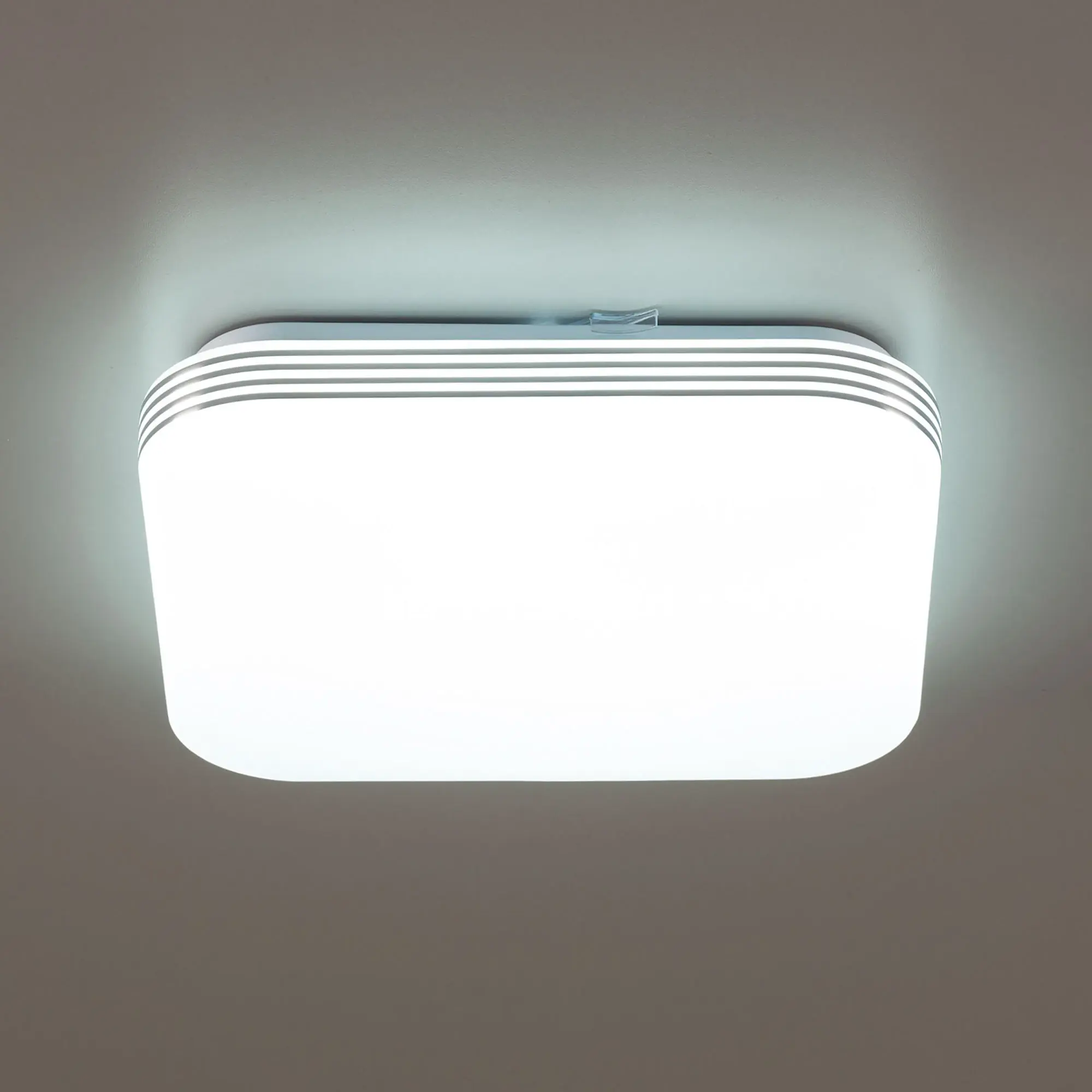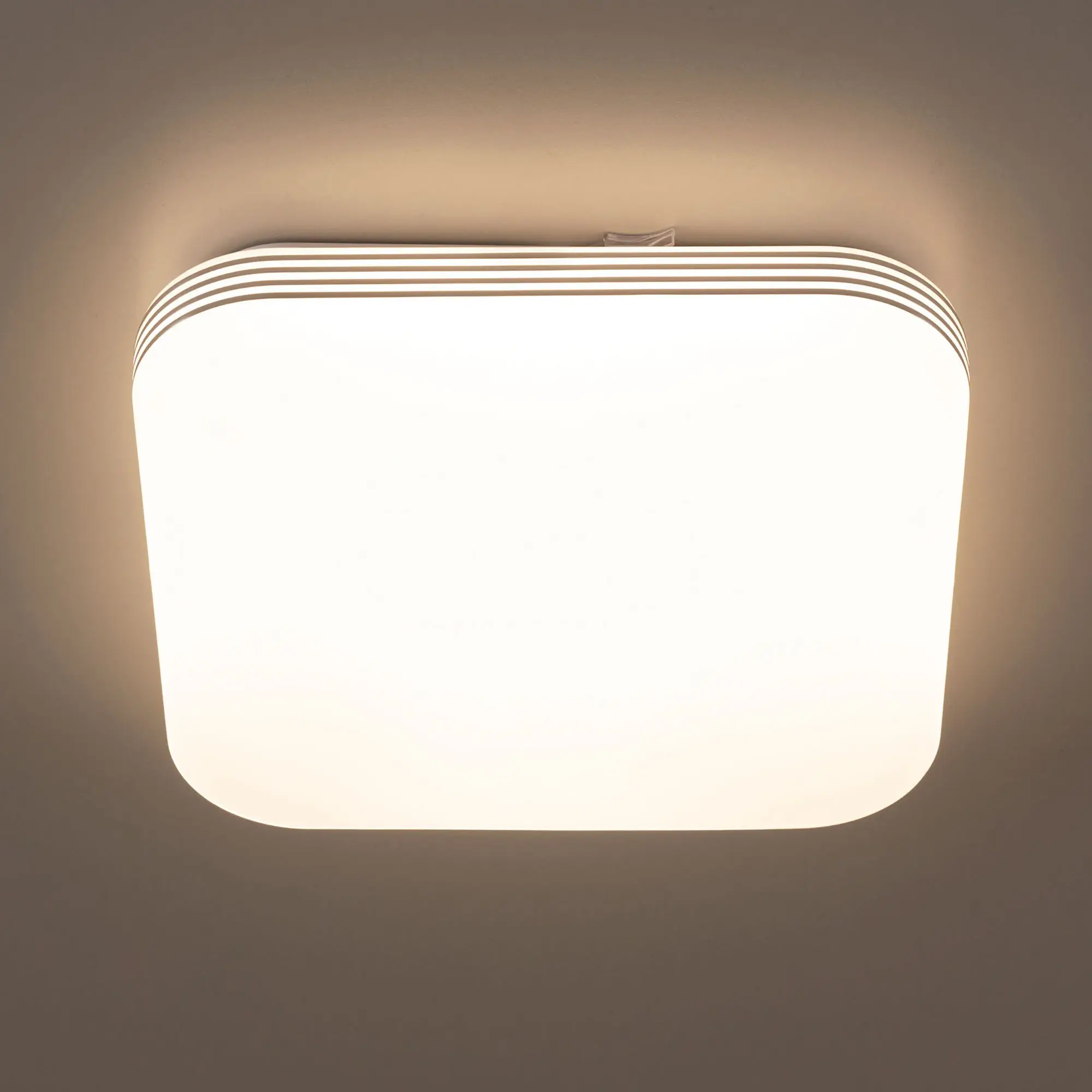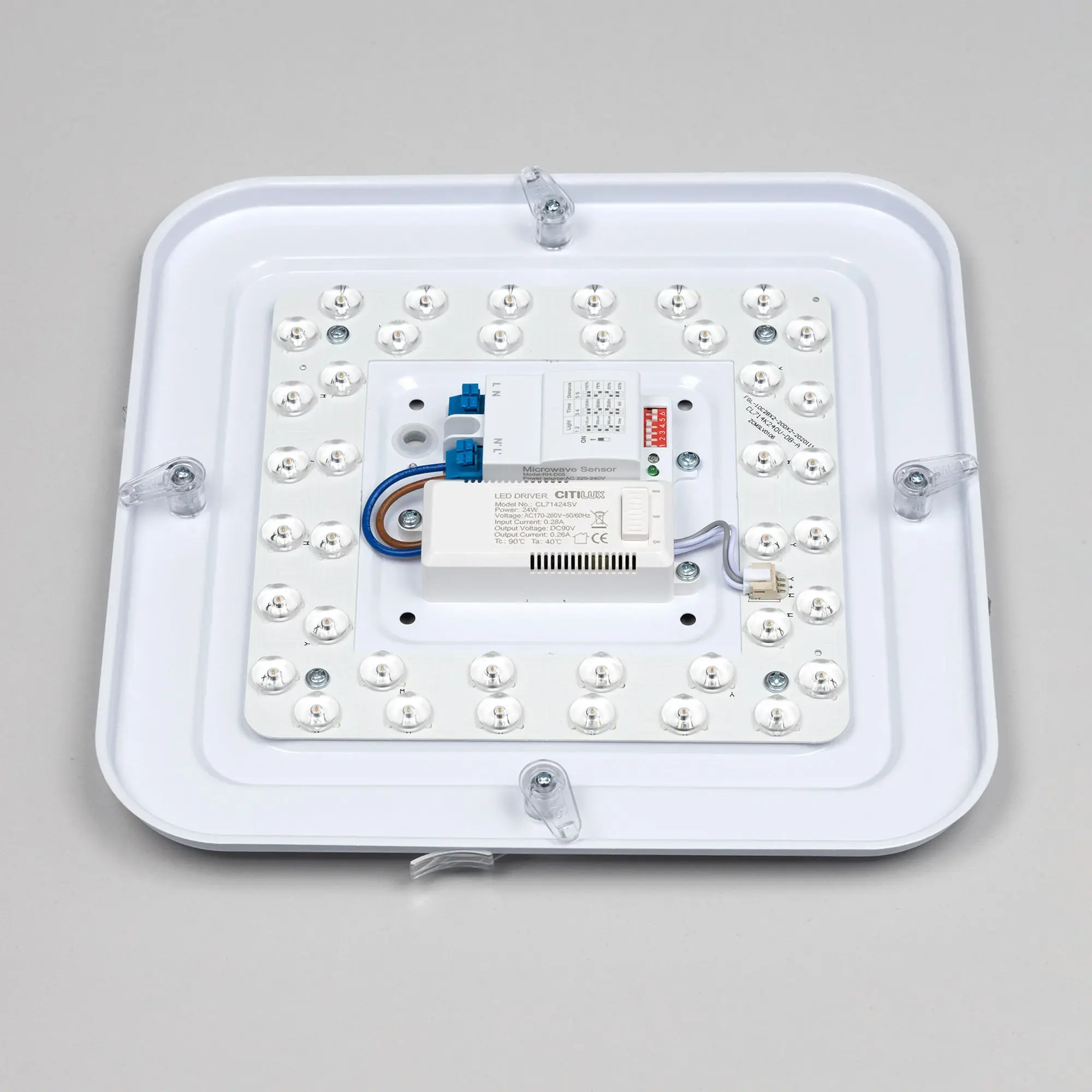 Модель оснащена датчиком движения. Регулировка порога освещённости имеет 4 уровня. Задержка времени выключения – от 8 сек. до 12 мин. Радиус действия от 1 до 7м (при установке на потолке). Переключатель цветовой температуры позволяет при монтаже установить режим свечения - тёплый, нейтральный или холодный свет (3000-4000-5500К). Мощность 24Вт, световой поток 2000Лм, размер 28,5х28,5см, высота 6,5см.
