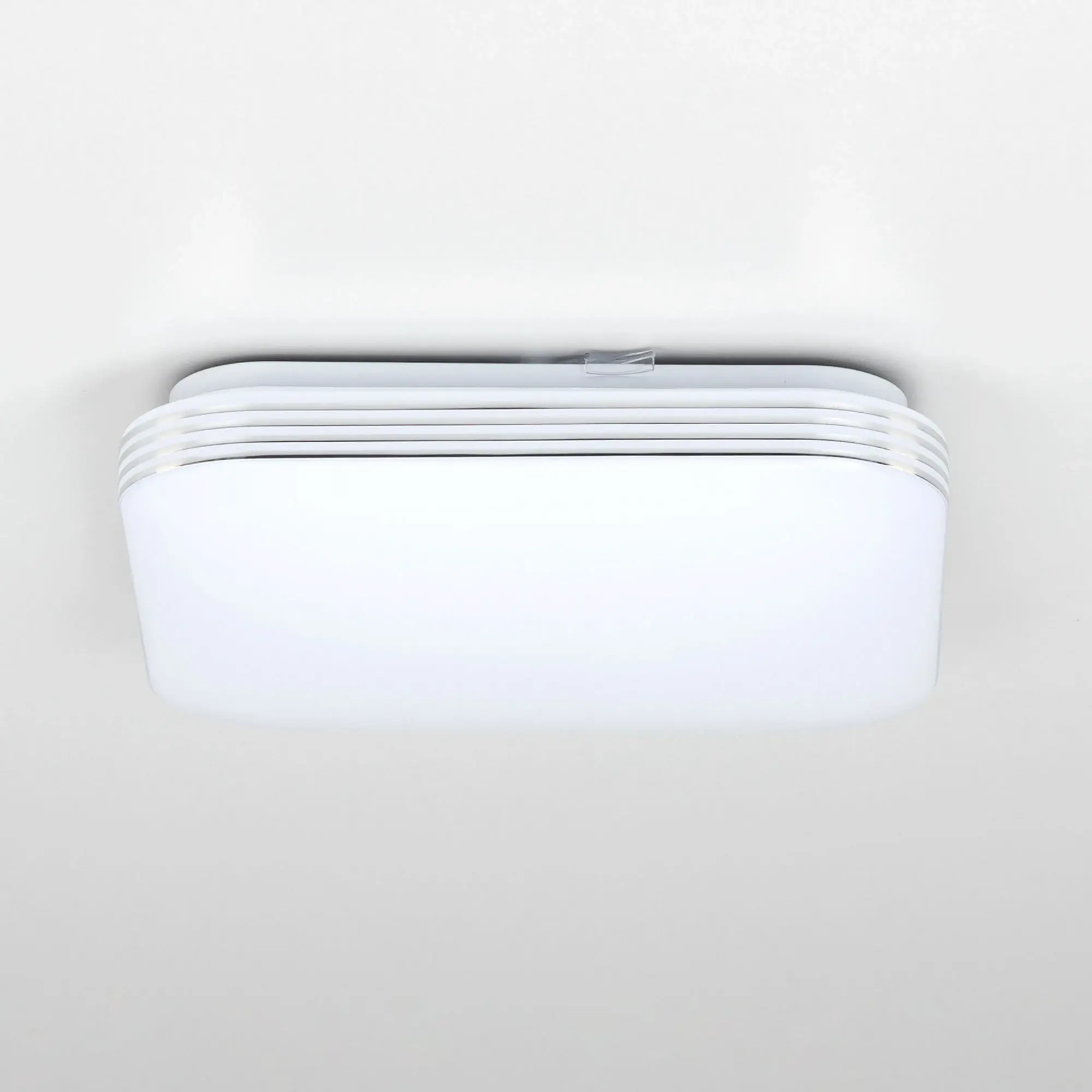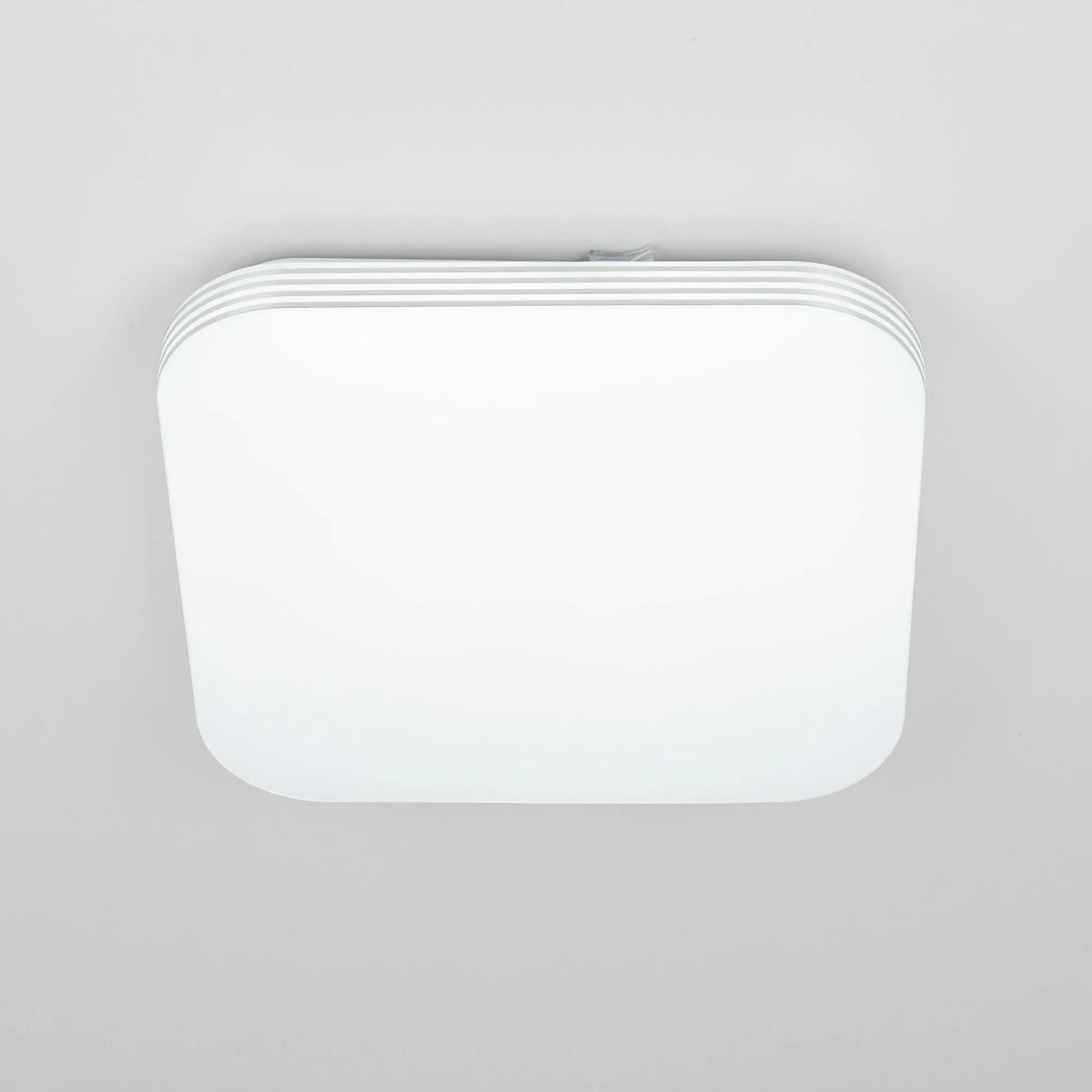 Светильник плоский, квадратной формы. Основание металлическое, плафон белый матовый из оптического полимера с изящной хромированной окантовкой.