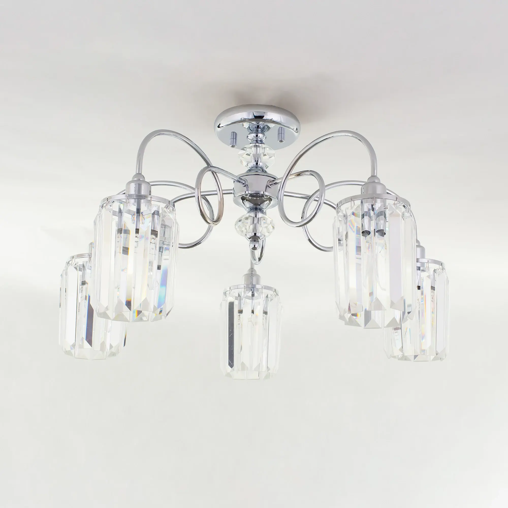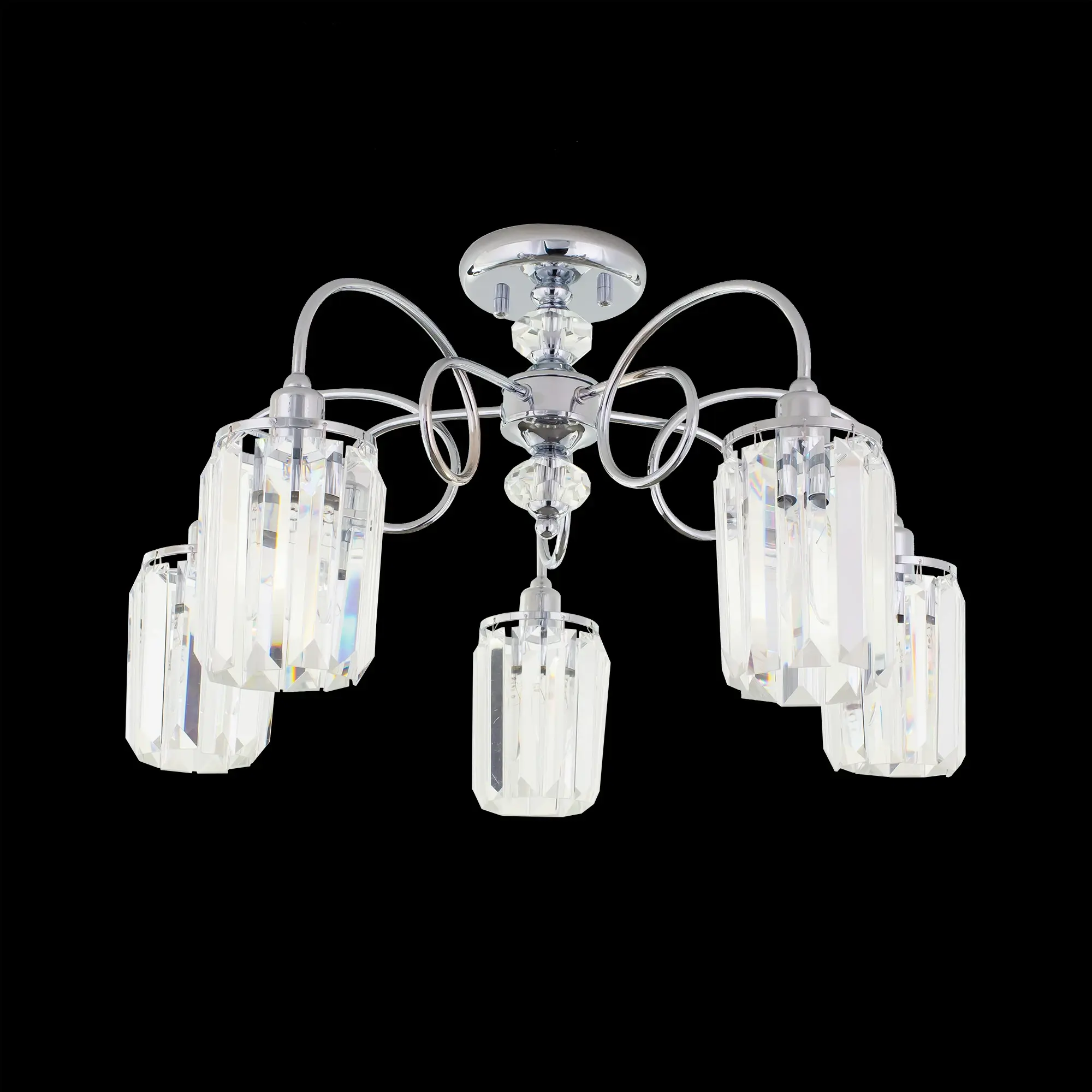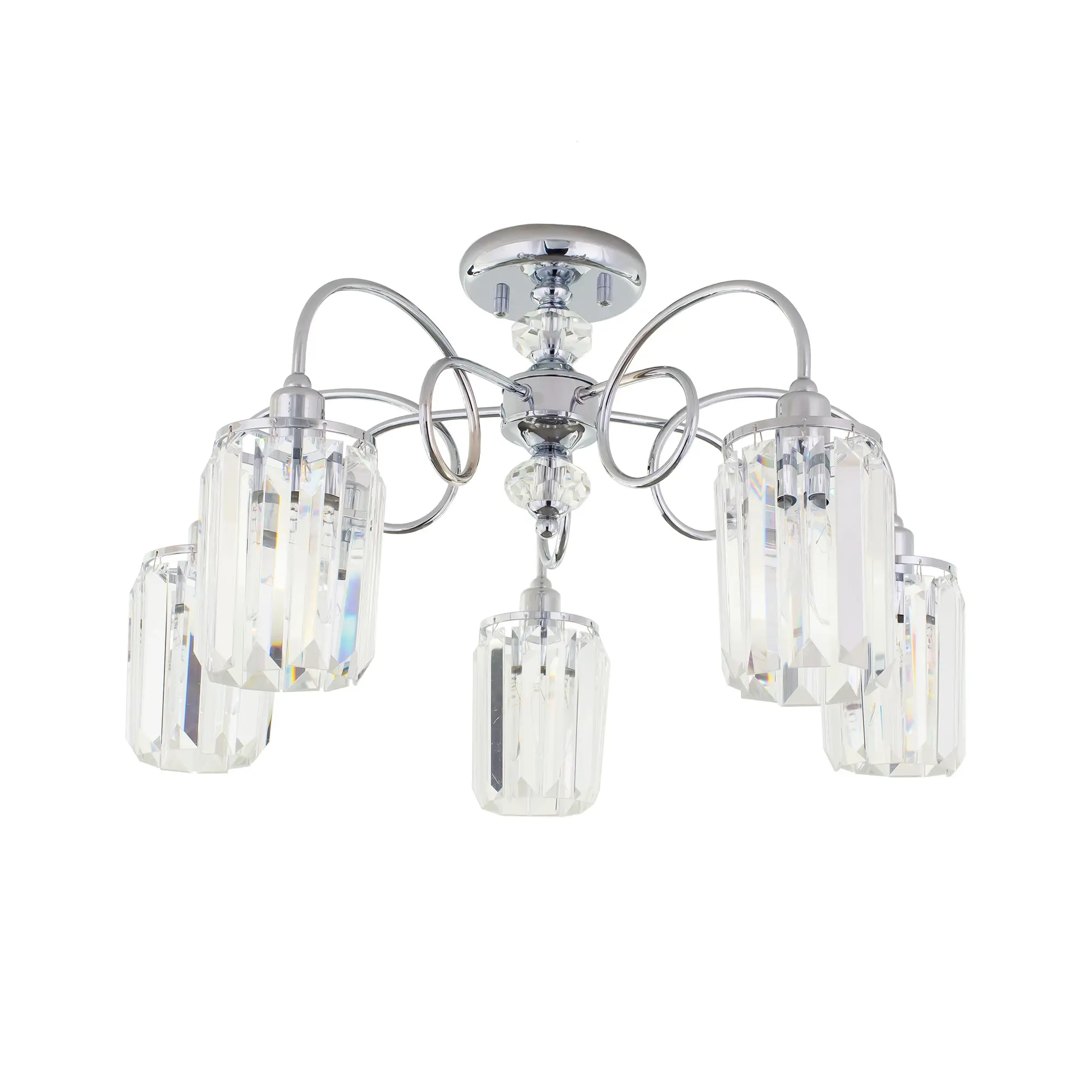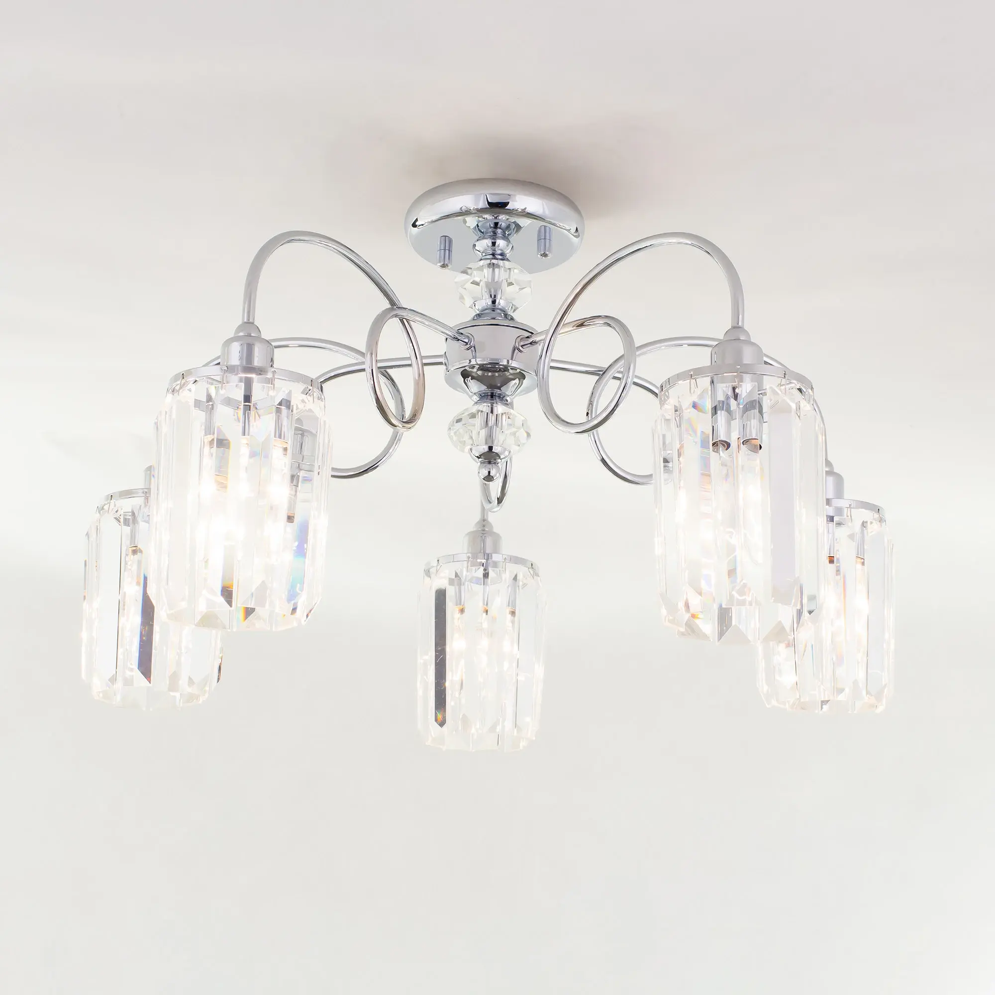 Потолочная пятирожковая люстра Citilux Sindi CL330151 с хрустальными подвесками. Металлический каркас с хромированным покрытием. Хрустальные подвески с огранкой в форме призмы образуют элегантные плафоны в форме цилиндра.
