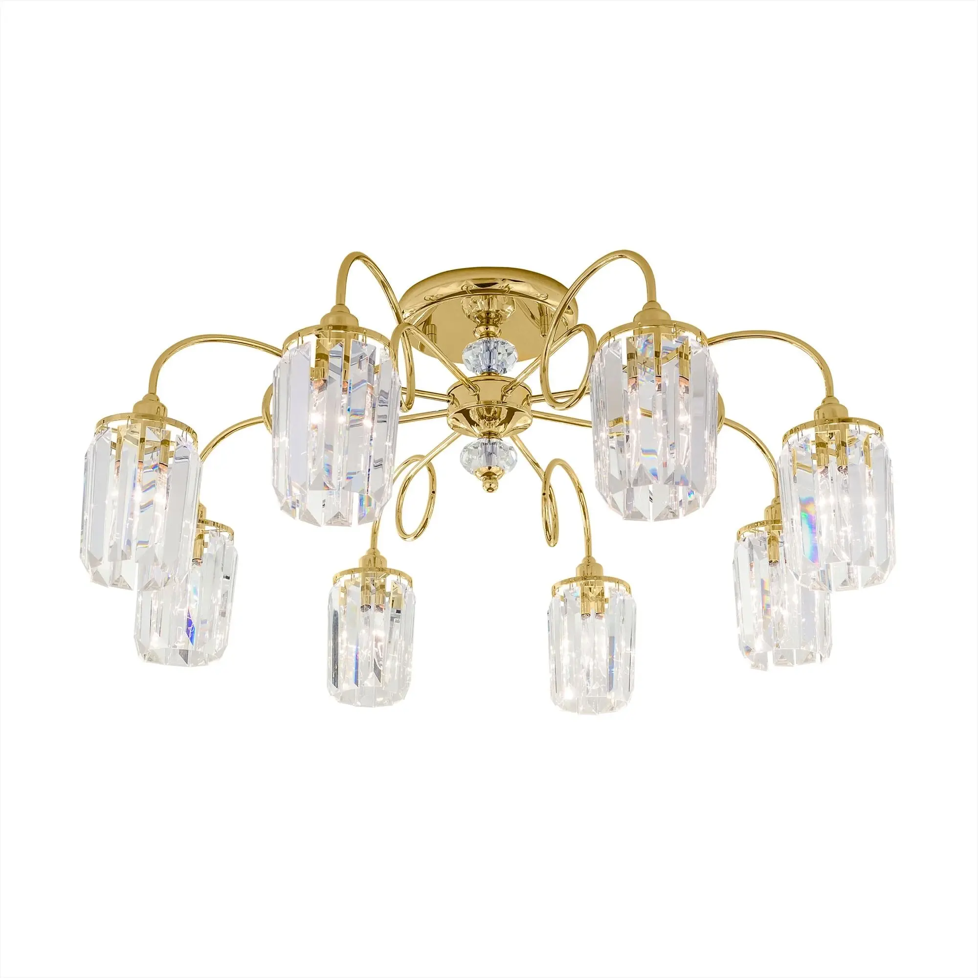 Потолочная восьмирожковая люстра Citilux Sindi CL330182 с хрустальными подвесками. Металлический каркас с золотистым покрытием. Хрустальные подвески с огранкой в форме призмы образуют элегантные плафоны в форме цилиндра.