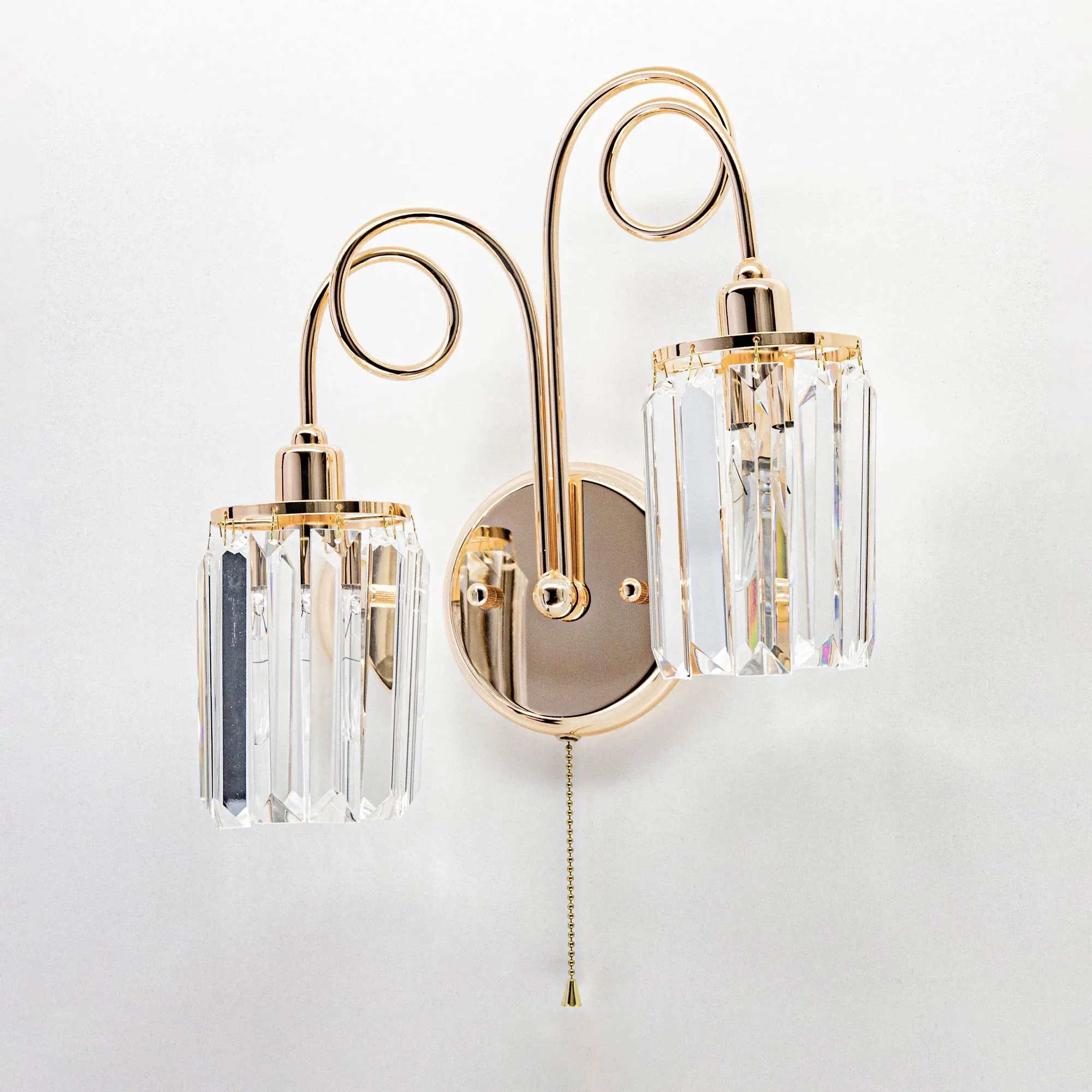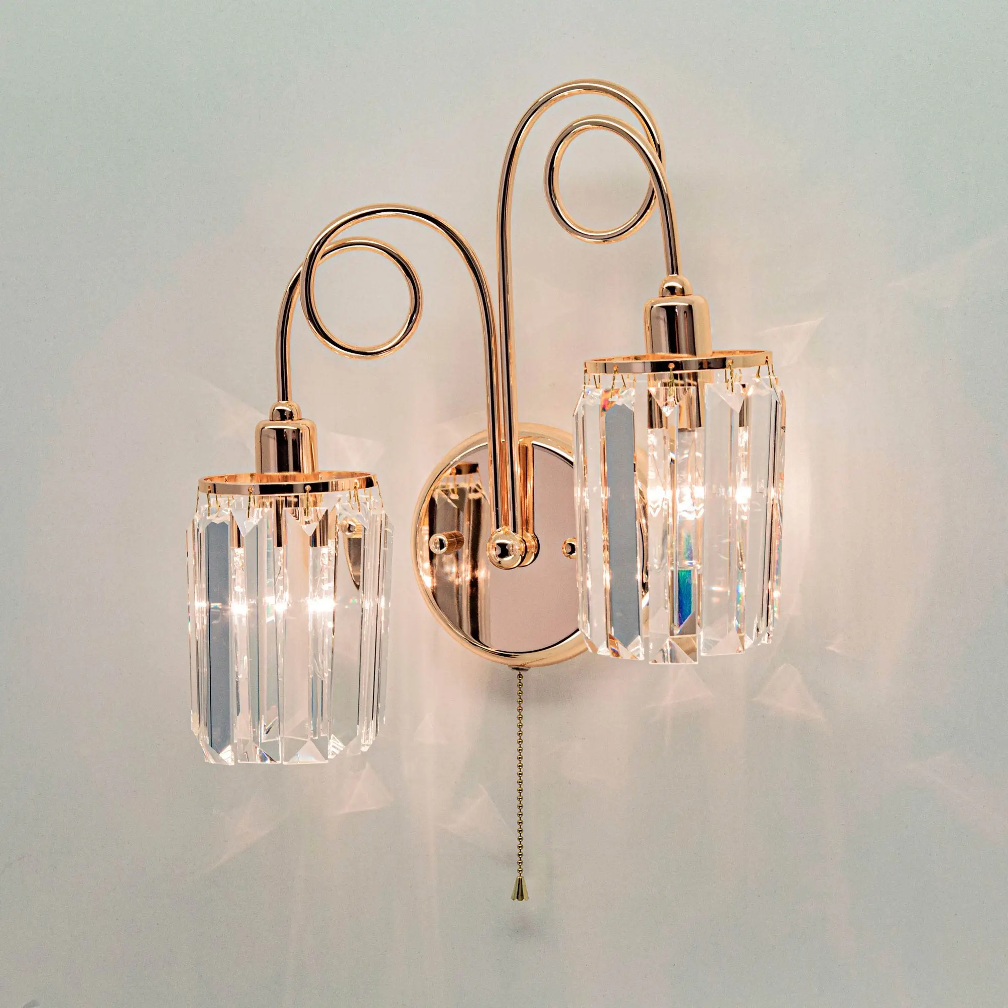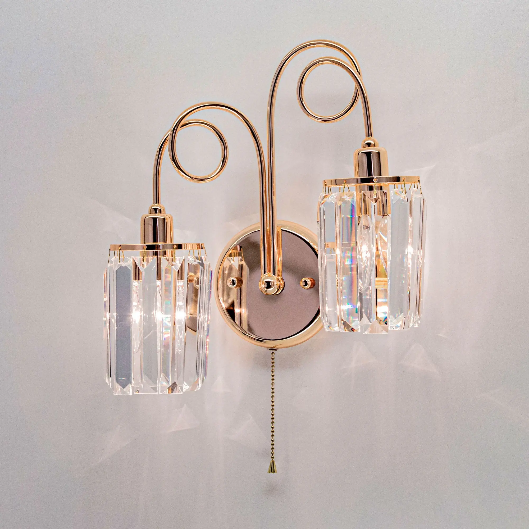 Стильное двухрожковое бра Citilux Sindi CL330322 с хрустальными подвесками. Металлический каркас с золотистым покрытием. Хрустальные подвески с огранкой в форме призмы образуют элегантные плафоны в форме цилиндра.
