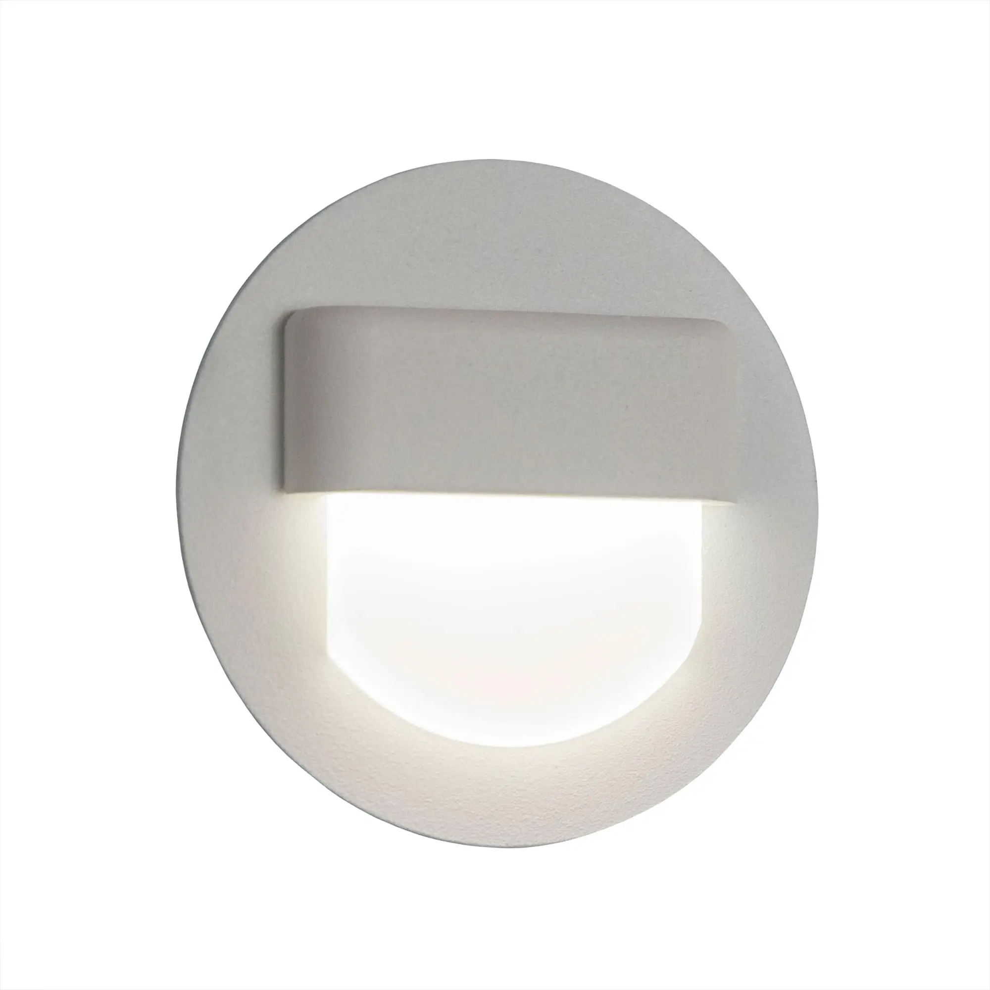 Светильник белого цвета, круглой формы. Корпус выполнен из металла, что гарантирует его прочность и долговечность. Рассеиватель из оптического полимера позволяет свету равномерно распространяться по всей поверхности ступени. Благодаря цветовой температуре 3000К свет получается теплым и уютным.