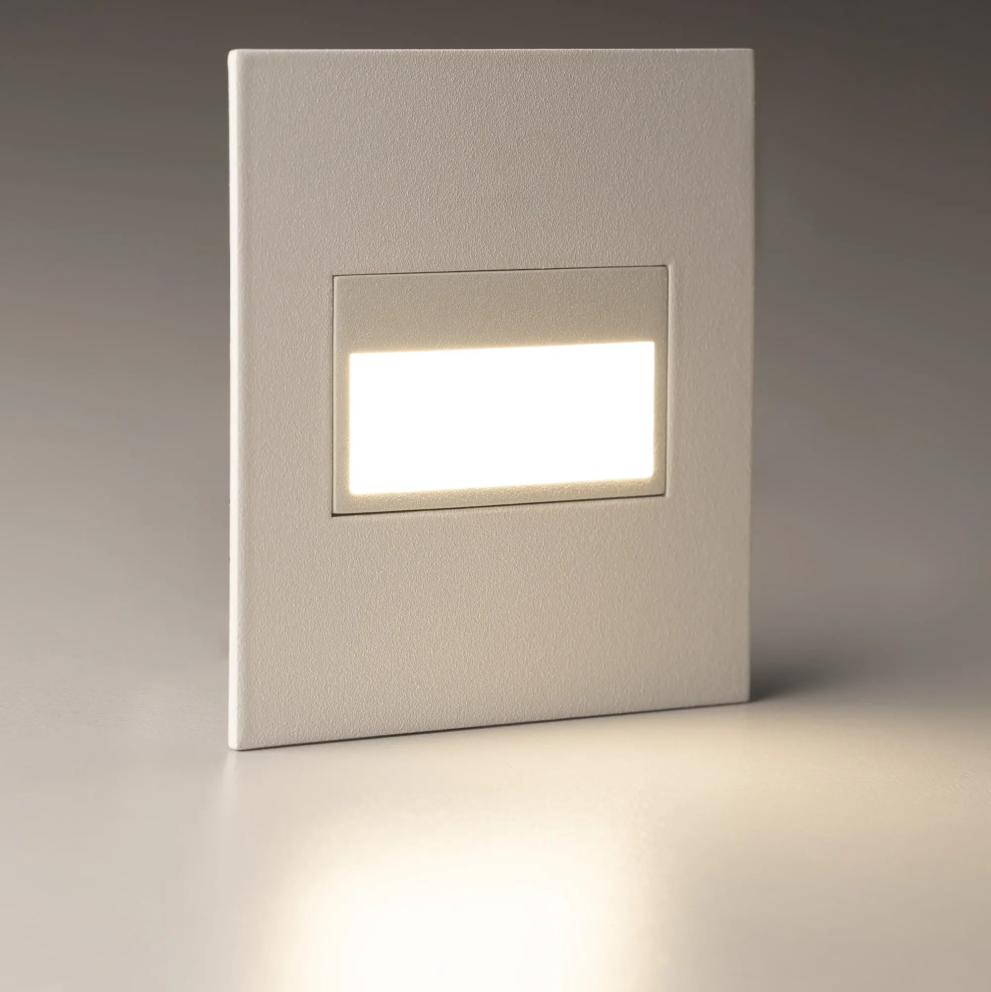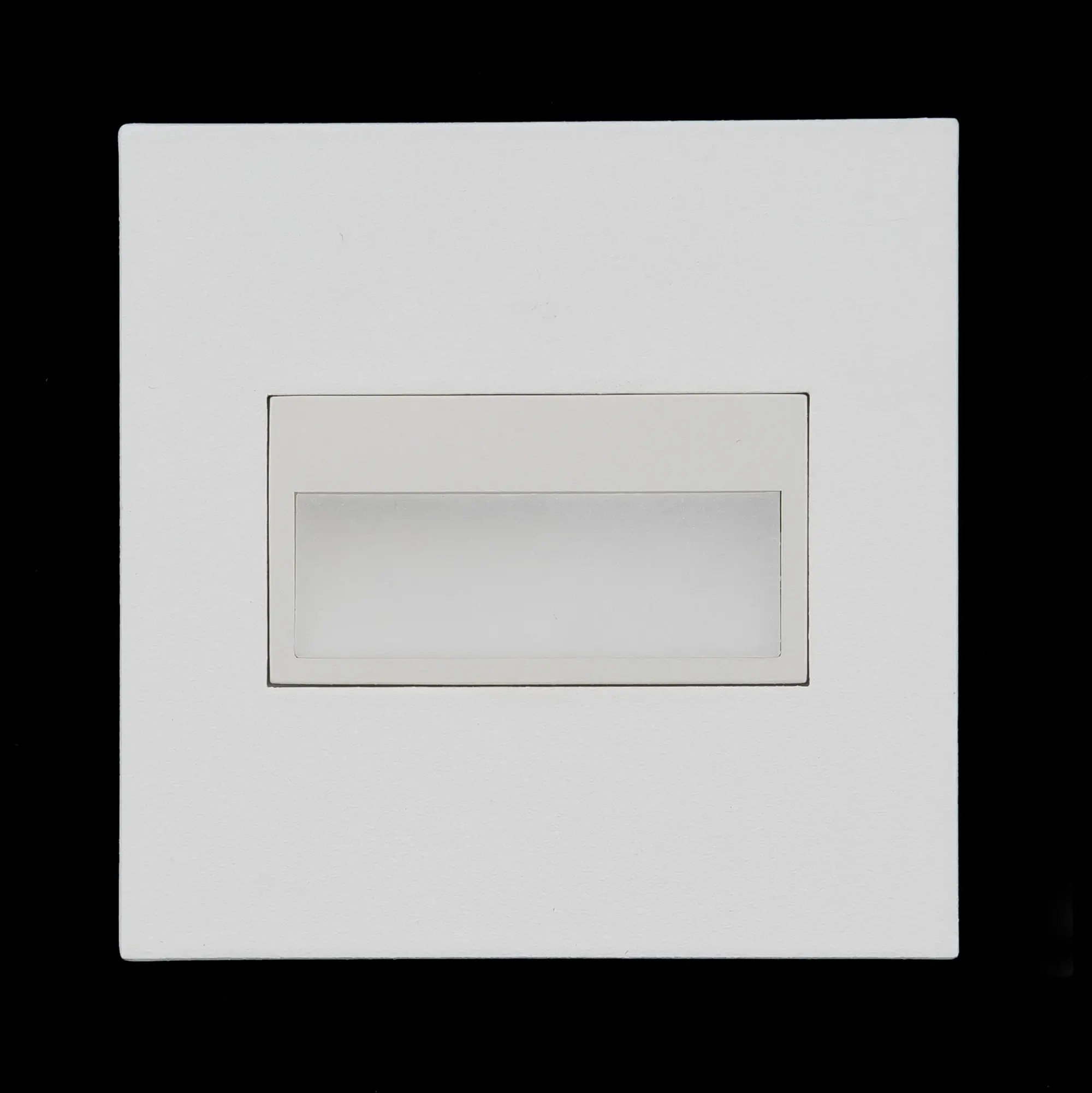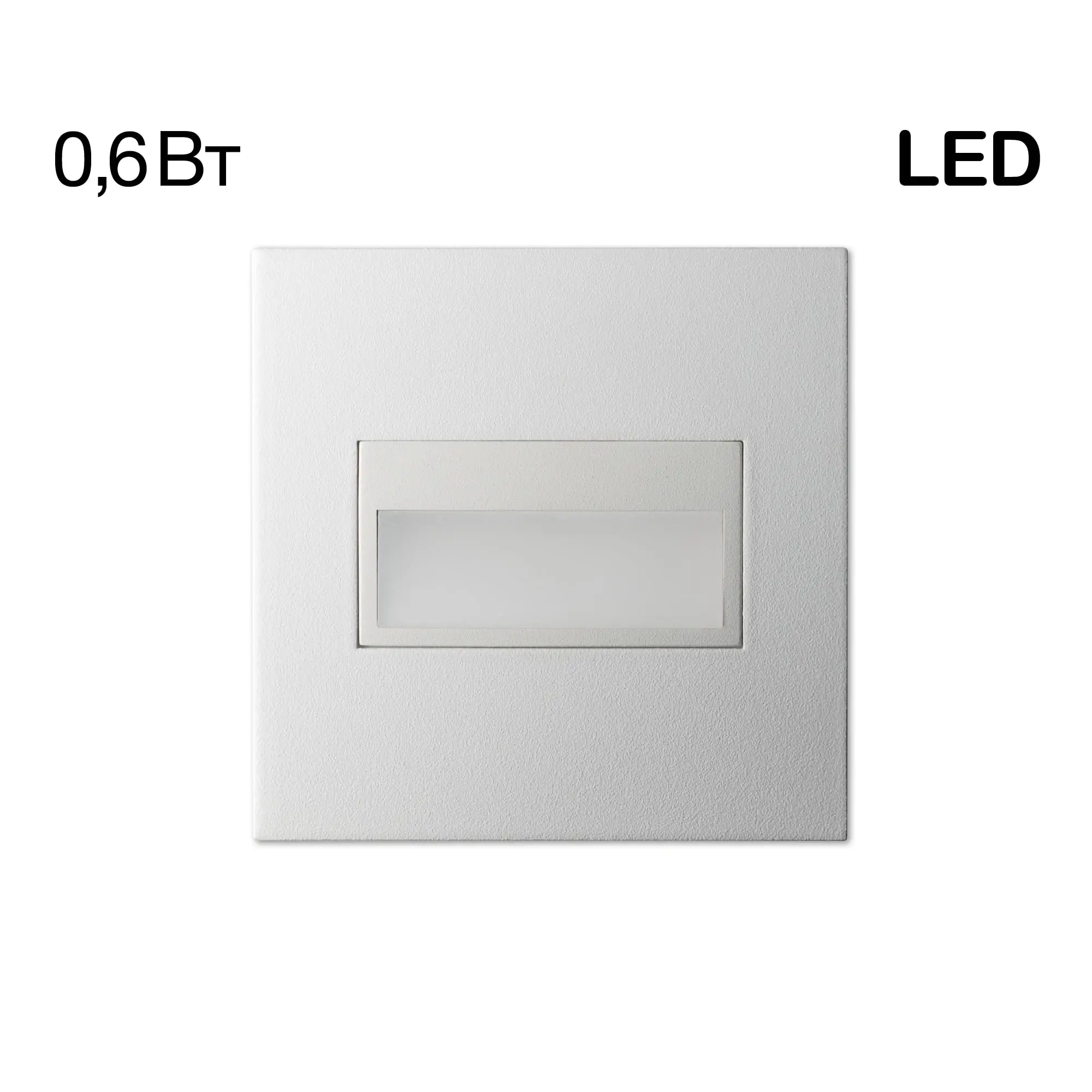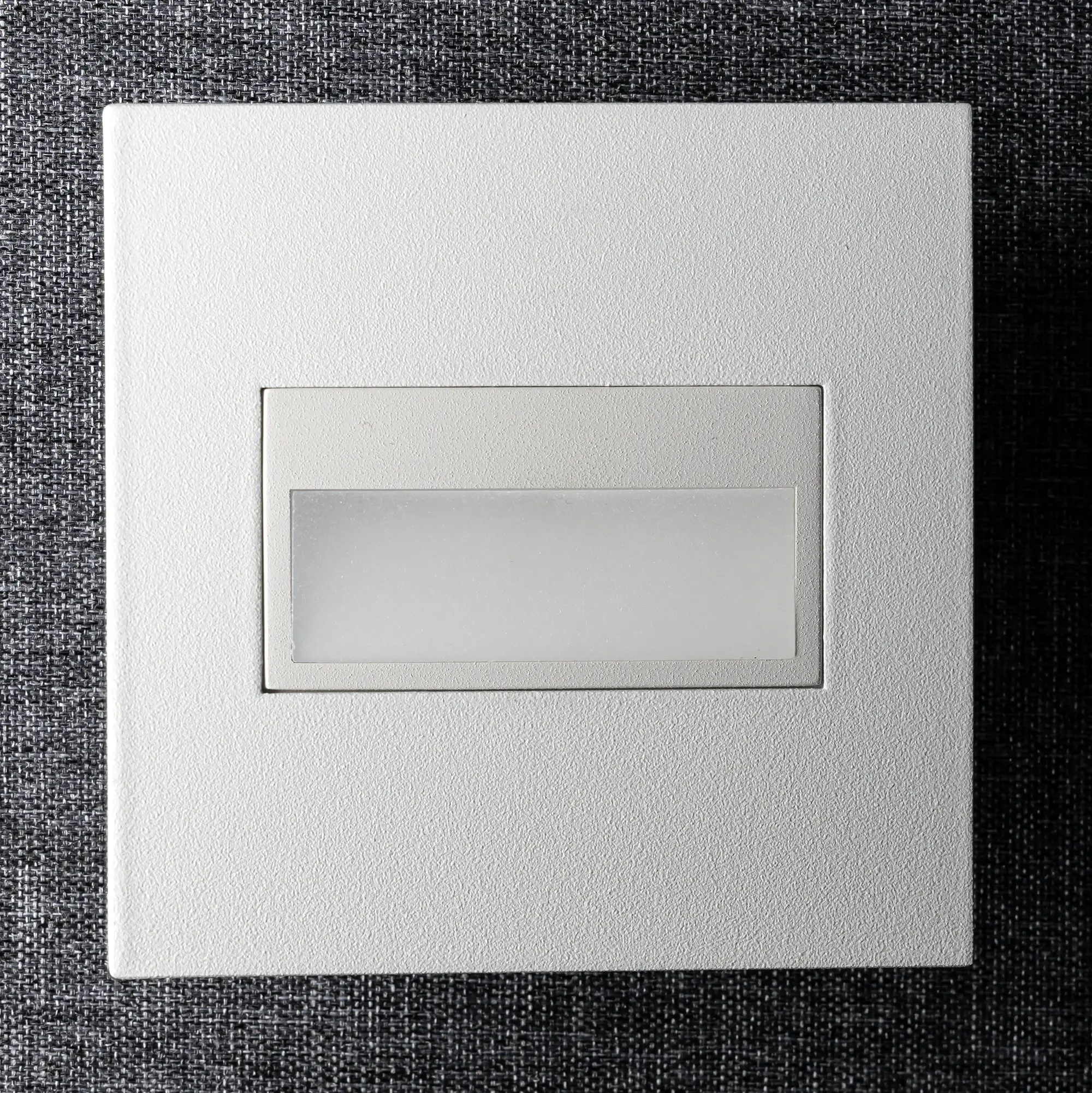 Светильник белого цвета, квадратной формы. Корпус металлический, что гарантирует его прочность и долговечность. Рассеиватель из оптического полимера позволяет свету равномерно распространяться по всей поверхности ступени.