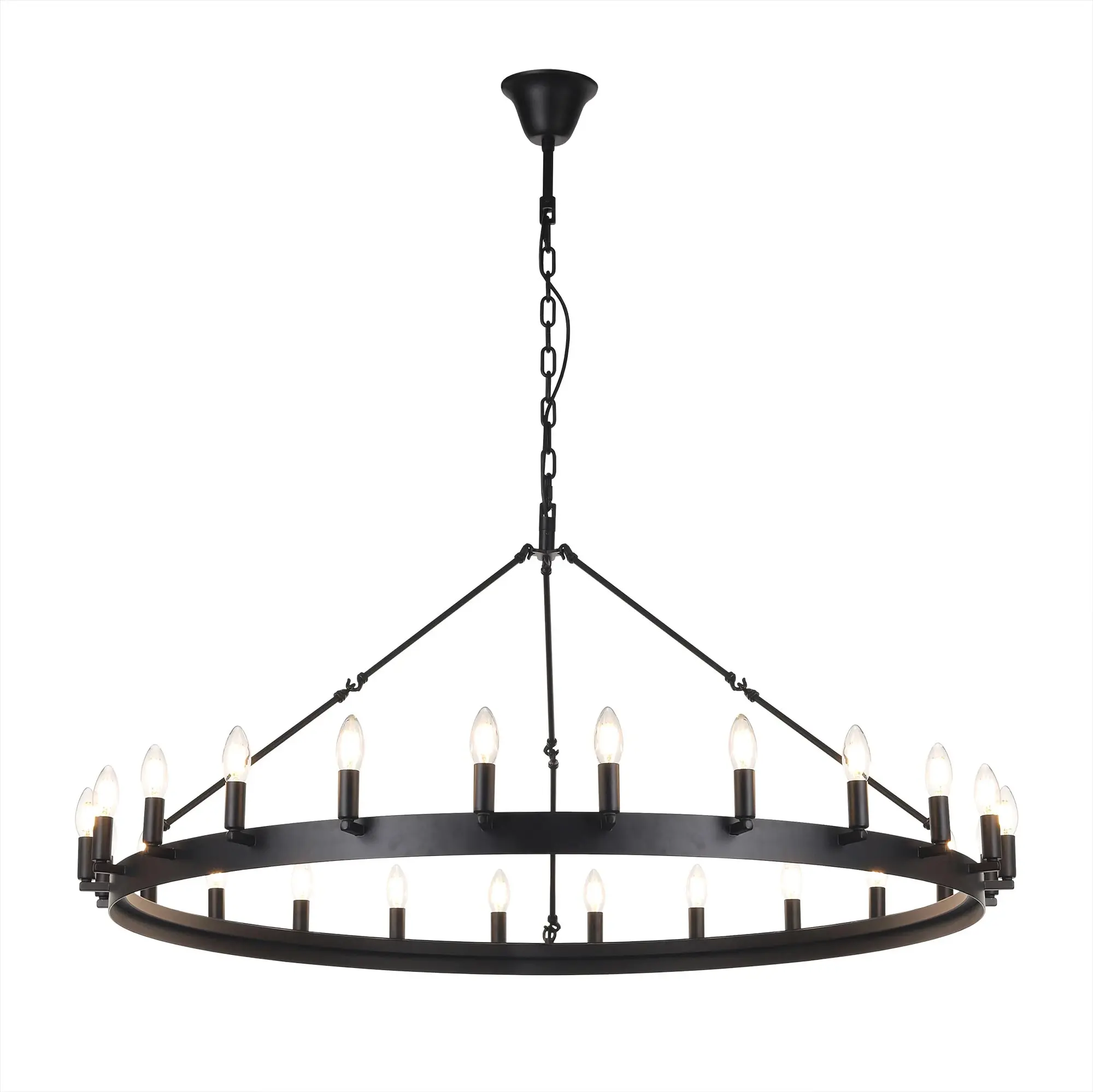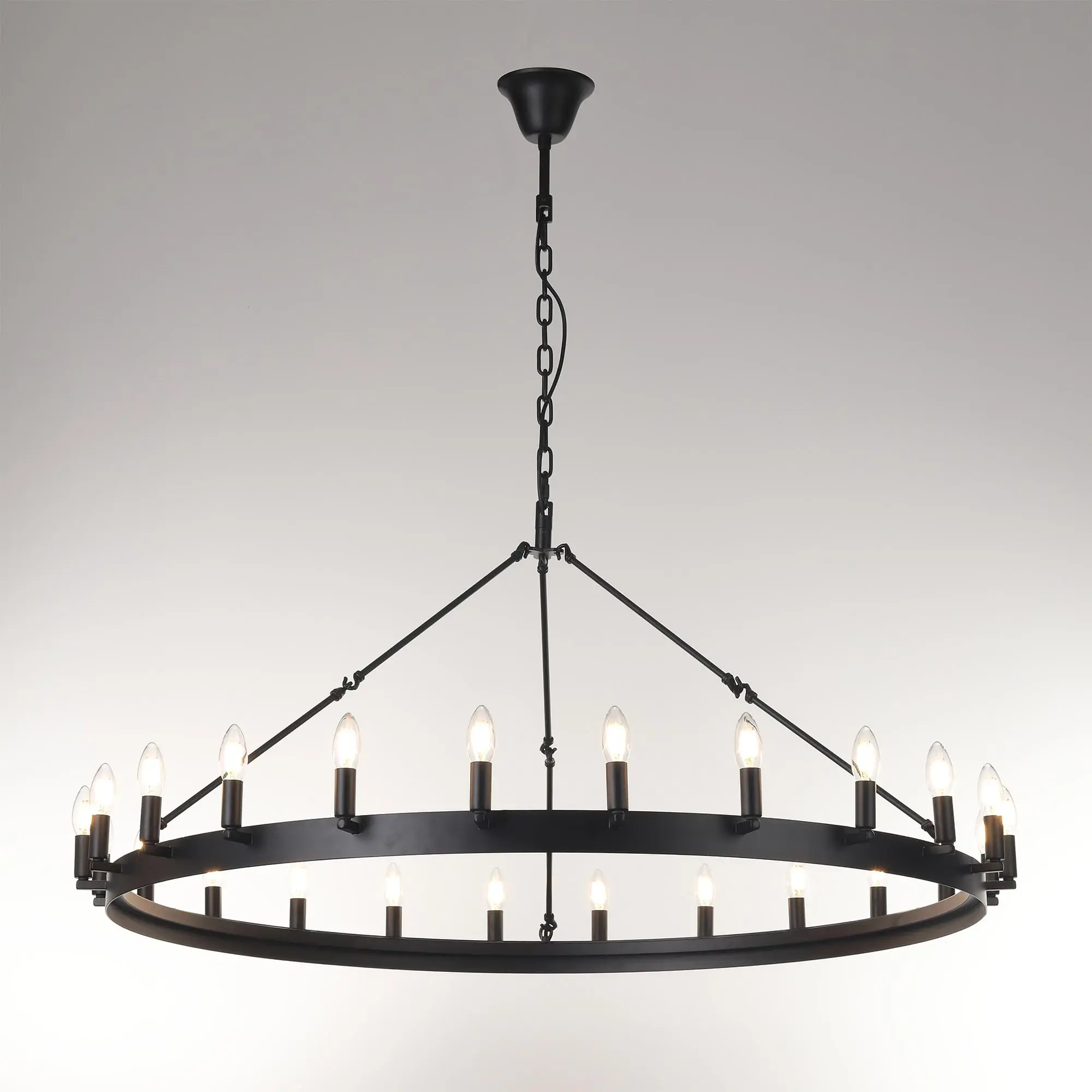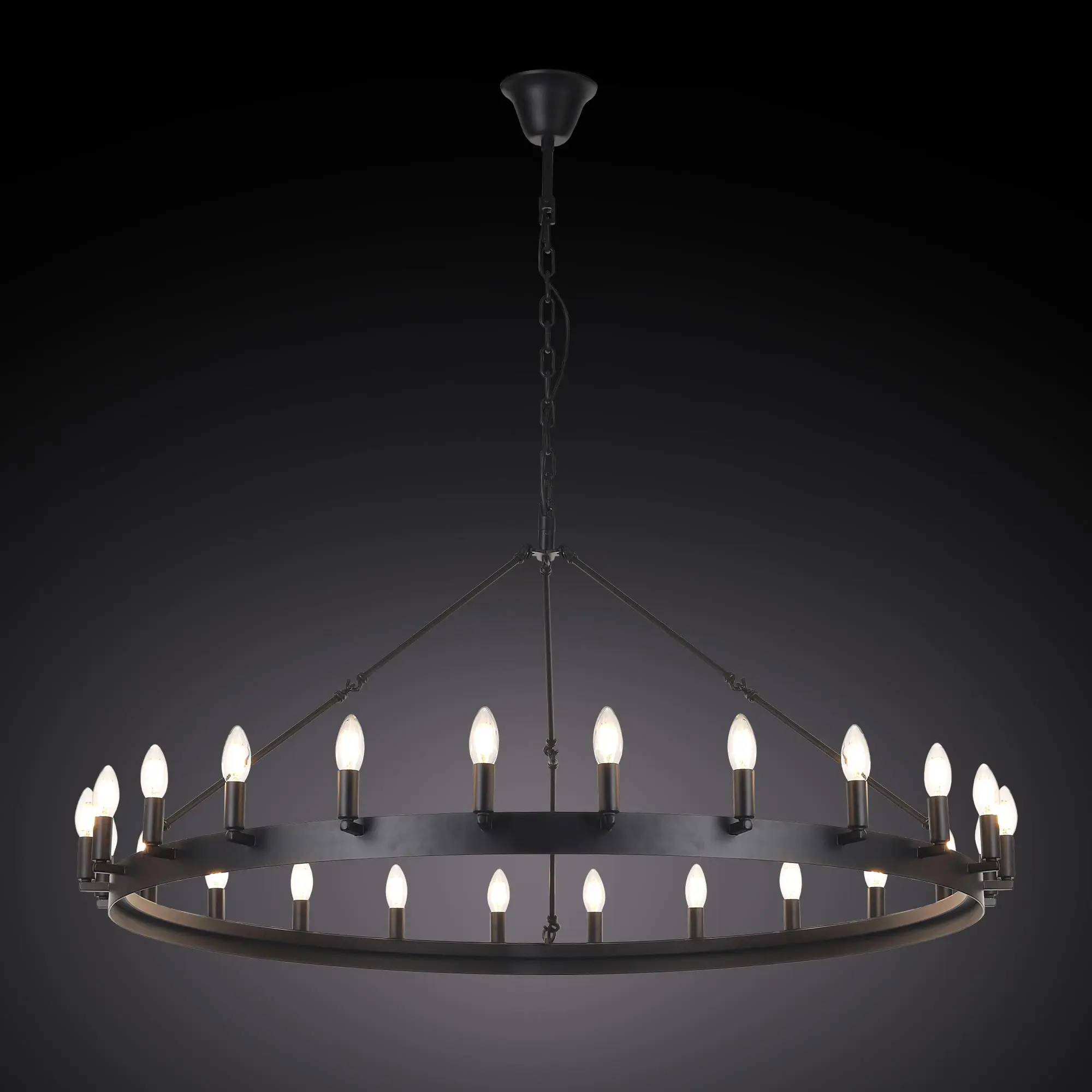 Подвесная люстра на цепи Citilux Смитсон CL470124 идеальное решение для создания освещения в стиле средневекового замка. Светильник металлический в виде широкого кольца со свечами, цвет чёрный матовый.