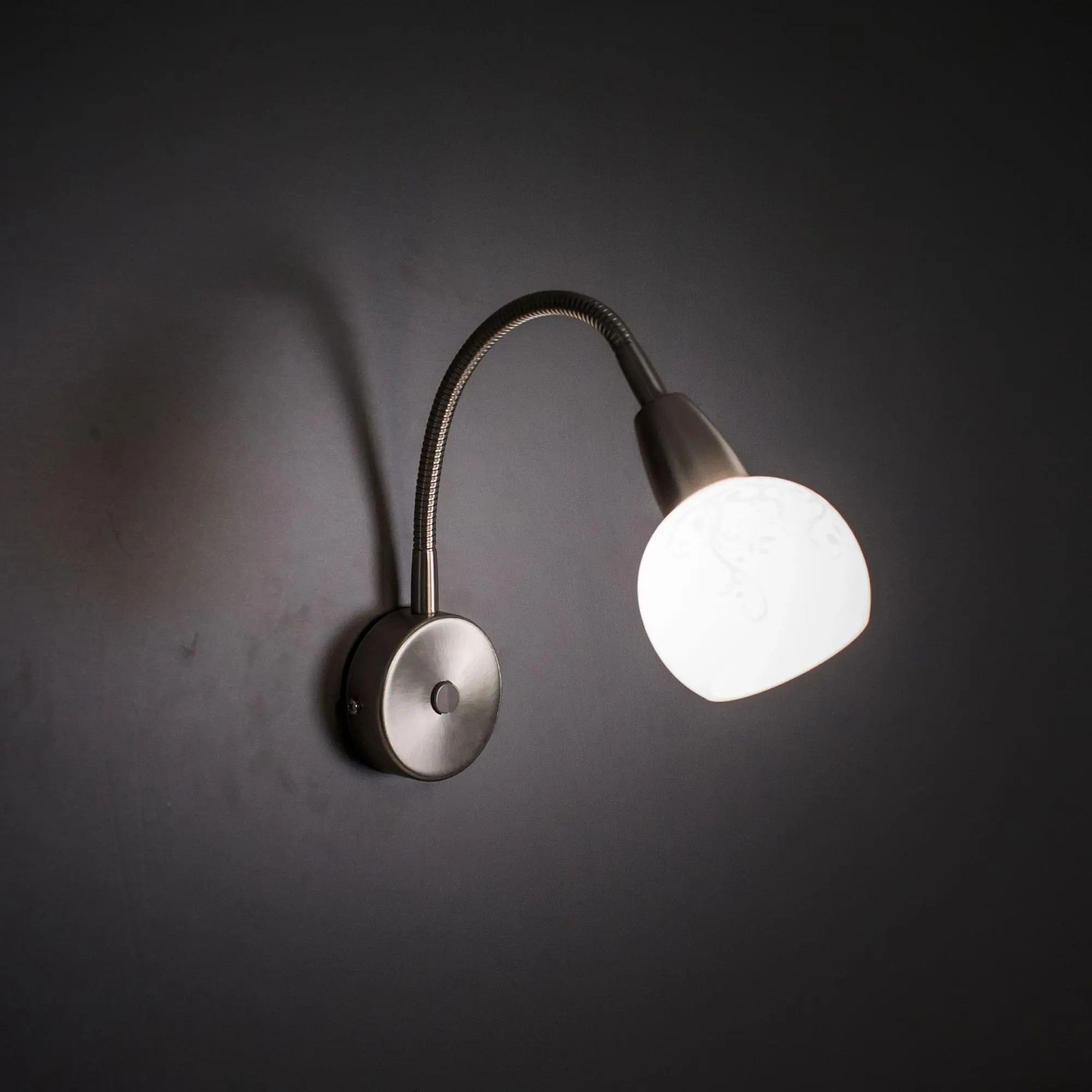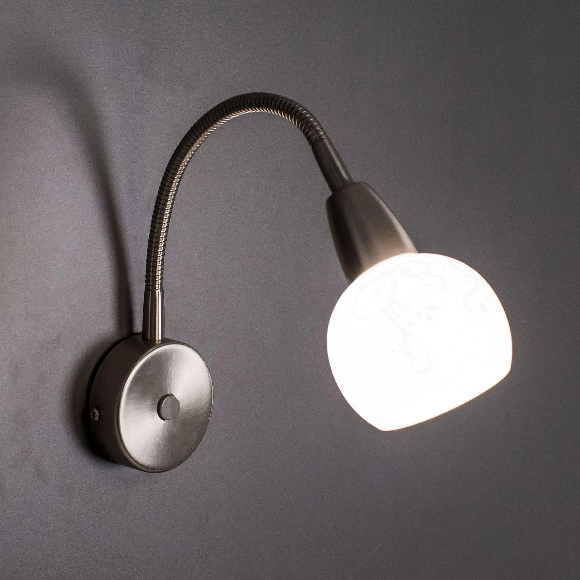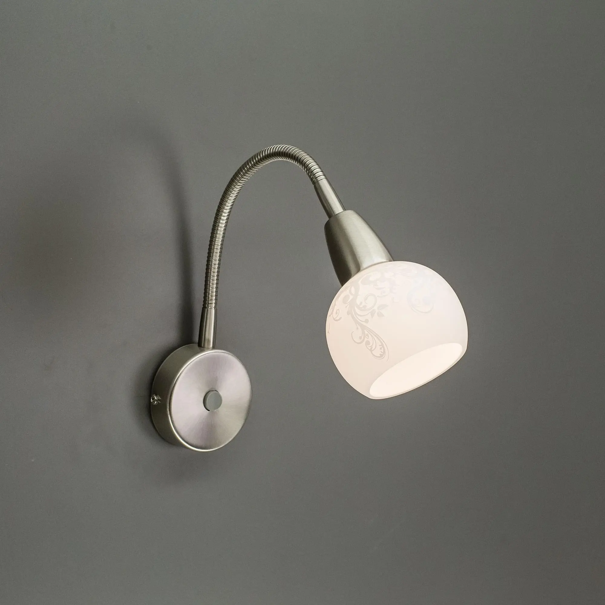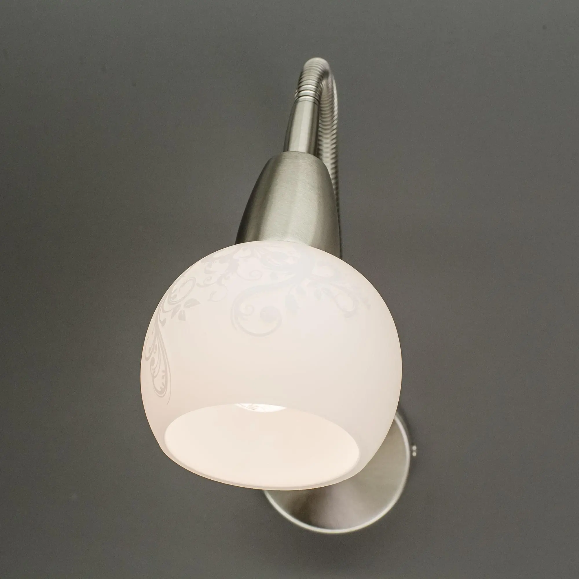 Бра настенные на гибкой ножке коллекции «Соната» очень удобное и элегантное решение для подсветки определённых зон. Идеально подойдёт для освещения как письменного стола, так и в качестве прикроватной бра для чтения. На корпусе светильника располагается встроенный выключатель, это позволяет выключить свет, не вставая из постели. Выключатель сделан под цвет корпуса, что добавляет изящества всей конструкции. На классический белый матовый плафон нанесён лёгкий ажурный рисунок, идеально сочетающийся с хромовой арматурой. Данная модель идеально вписывается в светлые интерьеры серой, белой или любой другой холодной направленности. Плафон даёт ровный, рассеянный и яркий свет. Хорошая яркость достигается за счёт двух основных моментов: Возможность направить световой поток так, как это нужно в тот или иной момент; Возможность применить яркие лампочки, накаливания допускается использовать до 60 ватт накаливания, светодиодные можно применять любой мощности. Максимальная площадь освещения до 3 квадратных метров.