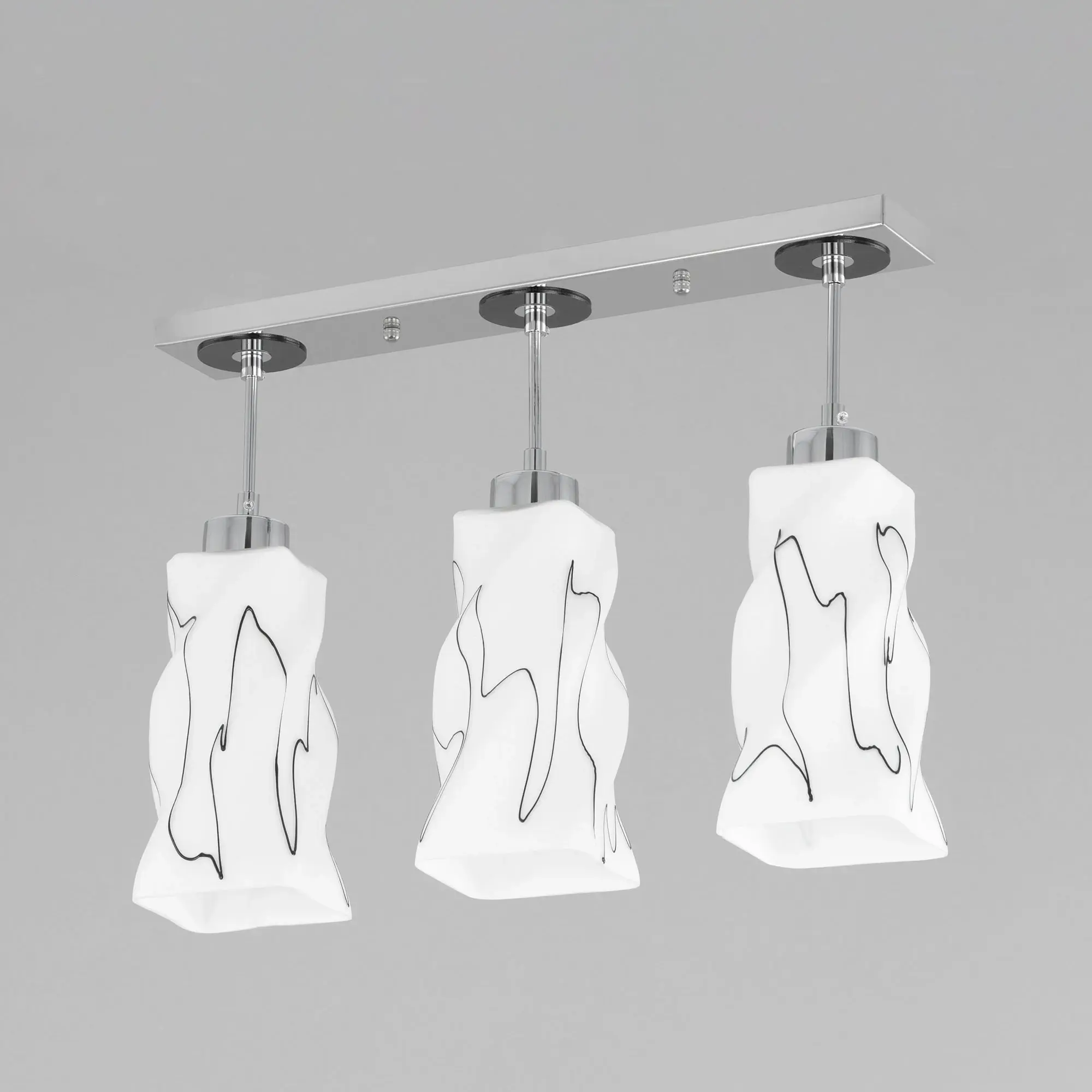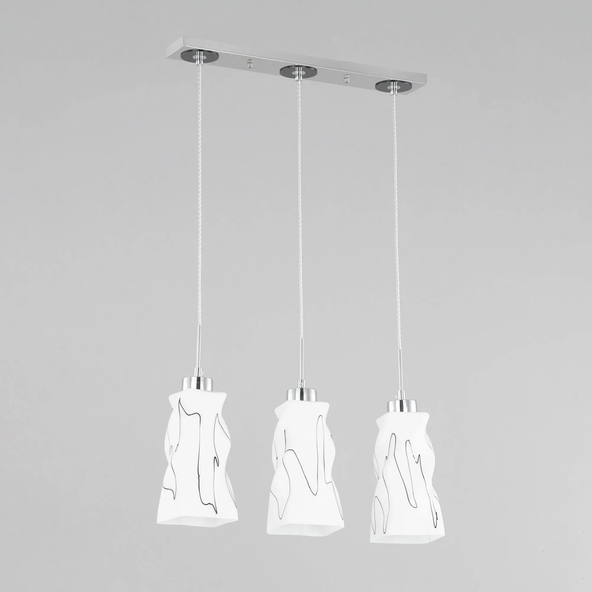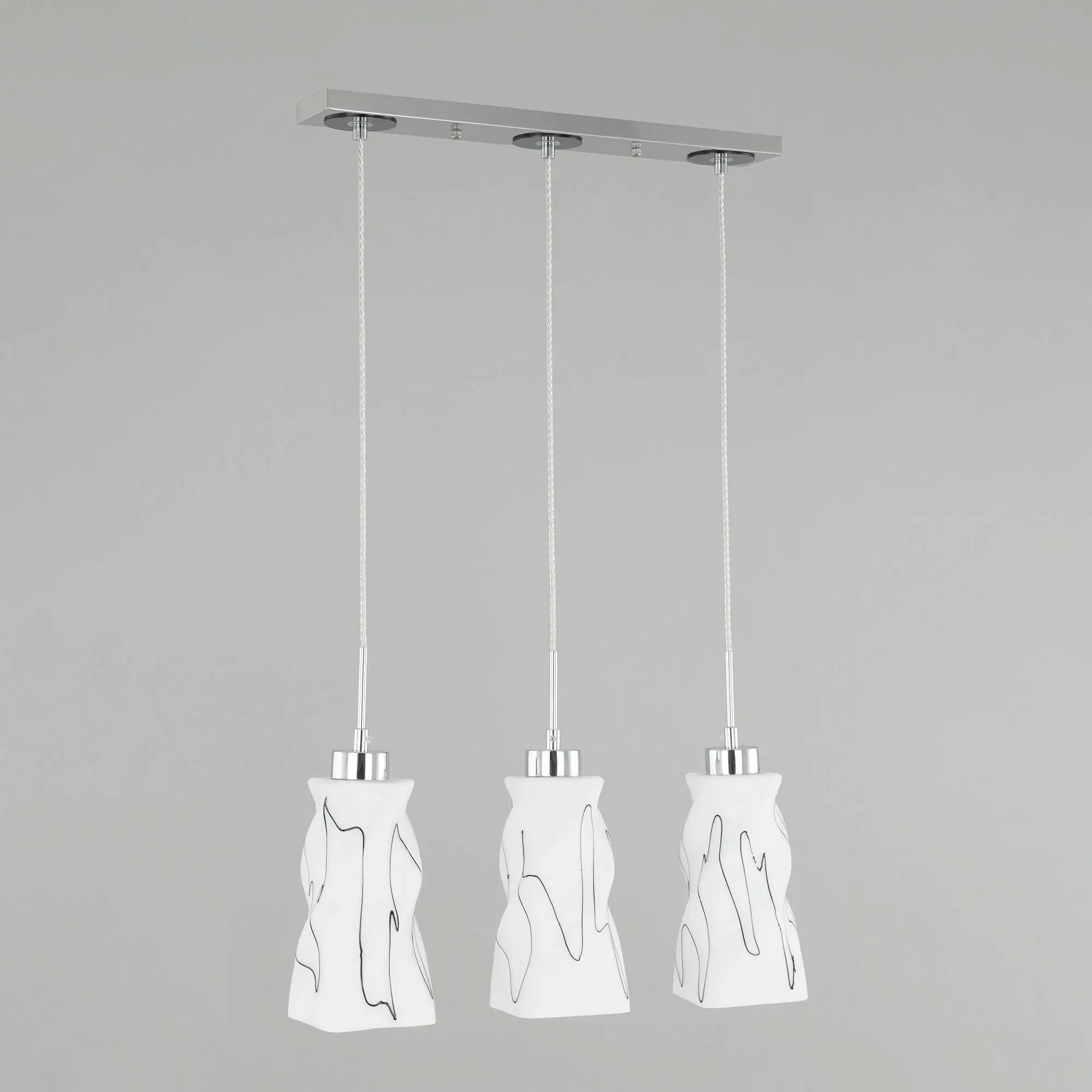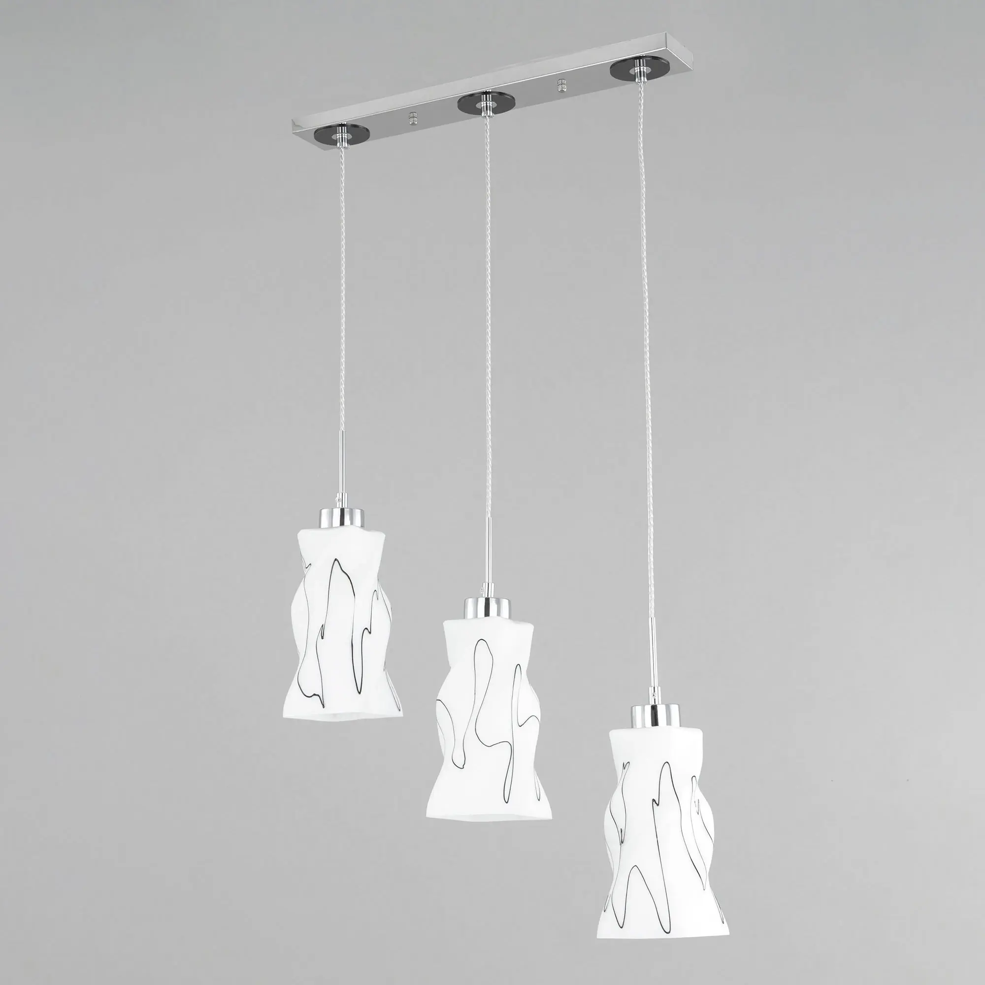 Светильник Citilux Спин CL943131 с тремя подвесными плафонами выполнен в современном стиле. Основание металлическое, прямоугольной формы, цвет хром с декоративными чёрными элементами, размер 50х8см. Плафоны стеклянные, матовые, украшены чёрным абстрактным рисунком, размер плафона 22,5х11х11см. Высота светильника регулируется при установке, в диапазоне от 38 до 115см. В изделии используются 3 лампы с цоколем Е27 максимальной мощностью для ламп накаливания 75Вт (в комплект не входят, приобретаются отдельно) Модель потолочного крепления, подходит для всех типов потолков, в том числе натяжных, тип крепления – планка. Тройной подвесной светильник Citilux Спин CL943131 прекрасный вариант для освещения стойки бара или зоны стола на кухне, в гостиной, столовой.,