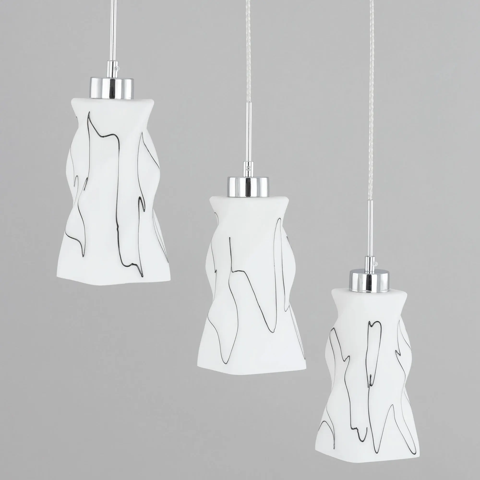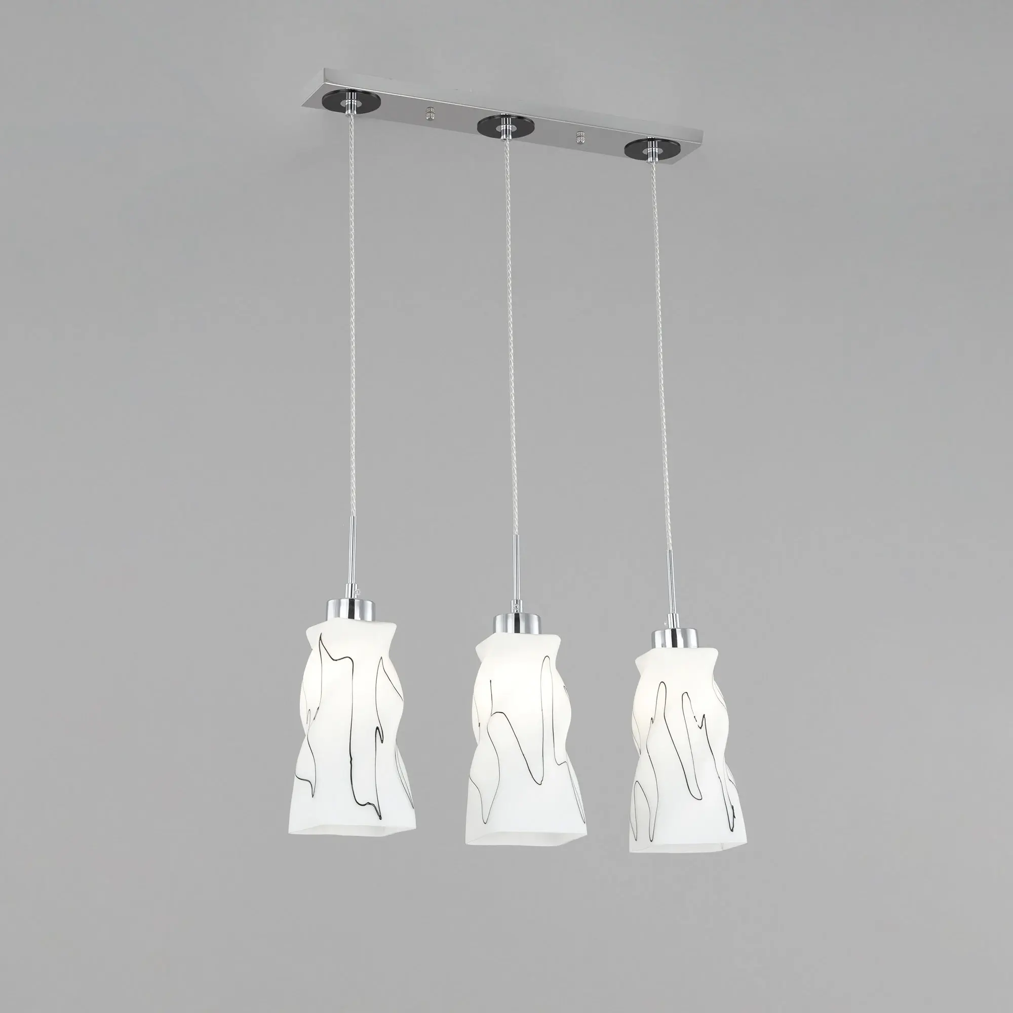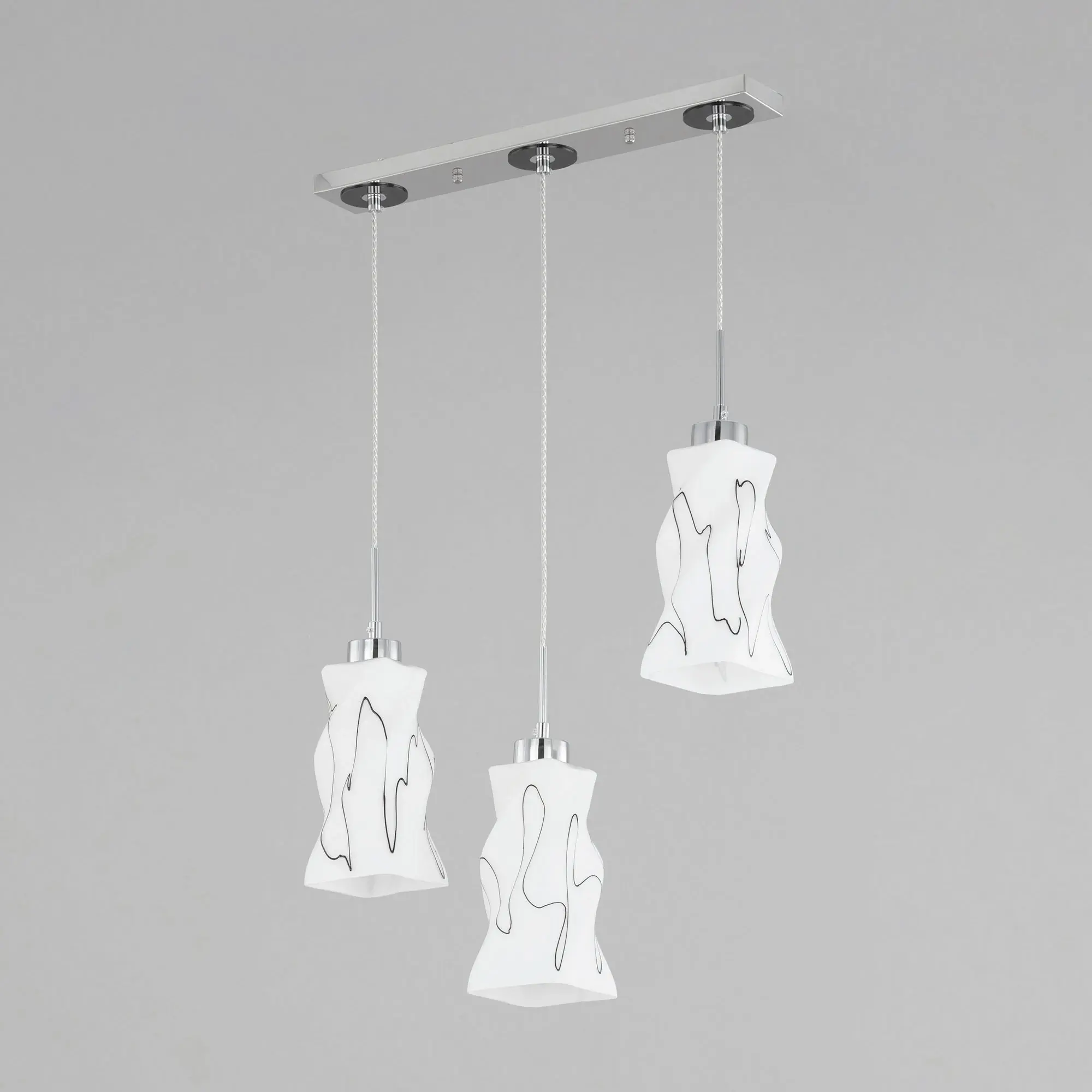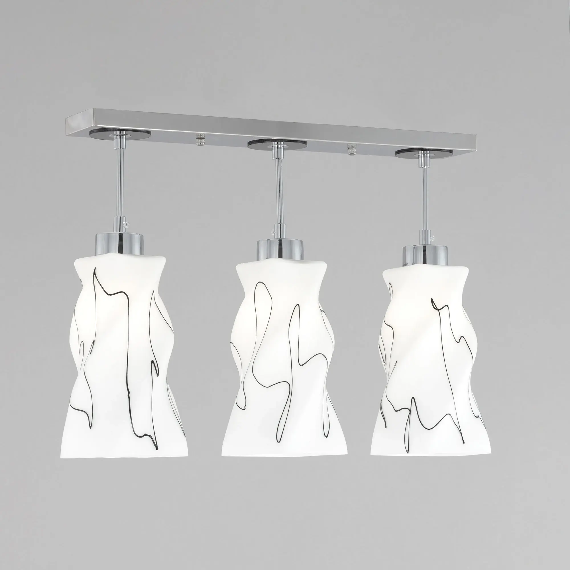 Светильник Citilux Спин CL943131 с тремя подвесными плафонами выполнен в современном стиле. Основание металлическое, прямоугольной формы, цвет хром с декоративными чёрными элементами, размер 50х8см. Плафоны стеклянные, матовые, украшены чёрным абстрактным рисунком, размер плафона 22,5х11х11см. Высота светильника регулируется при установке, в диапазоне от 38 до 115см. В изделии используются 3 лампы с цоколем Е27 максимальной мощностью для ламп накаливания 75Вт (в комплект не входят, приобретаются отдельно) Модель потолочного крепления, подходит для всех типов потолков, в том числе натяжных, тип крепления – планка. Тройной подвесной светильник Citilux Спин CL943131 прекрасный вариант для освещения стойки бара или зоны стола на кухне, в гостиной, столовой.,