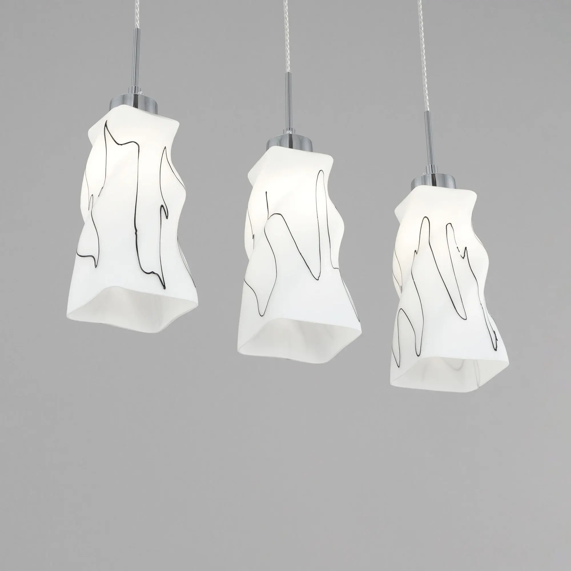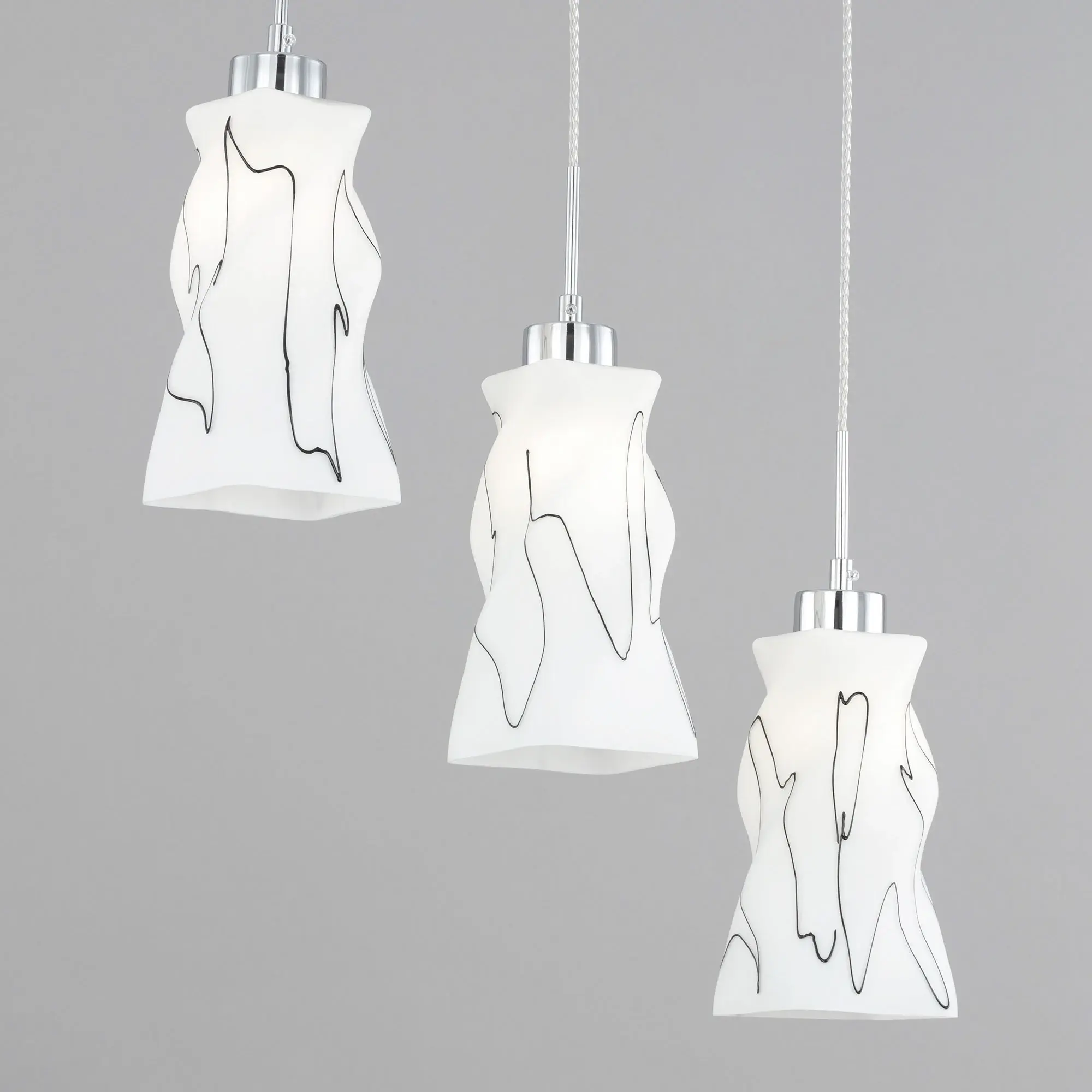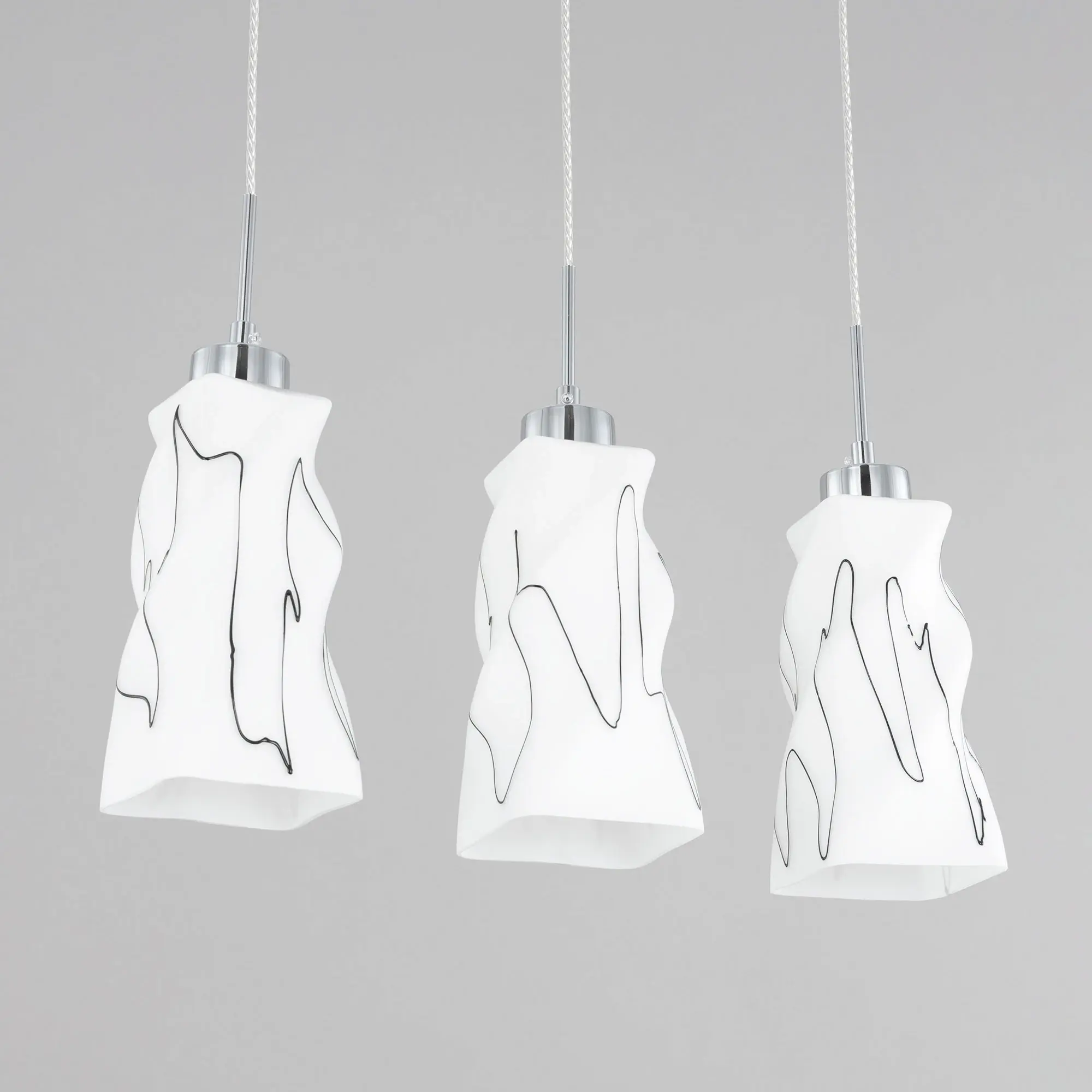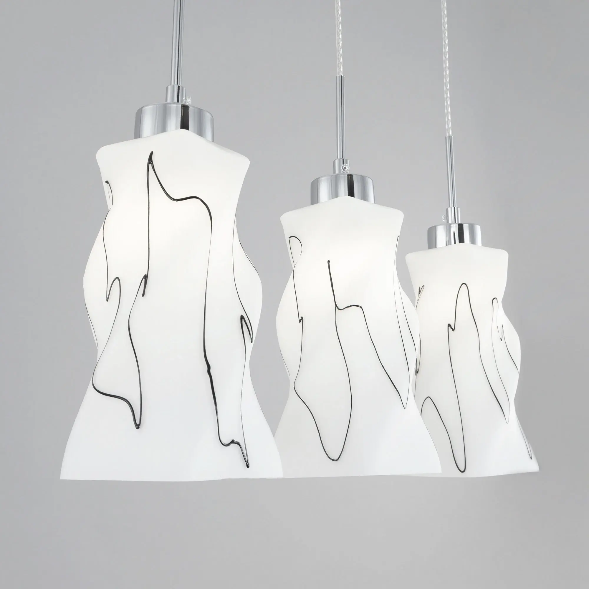 Светильник Citilux Спин CL943131 с тремя подвесными плафонами выполнен в современном стиле. Основание металлическое, прямоугольной формы, цвет хром с декоративными чёрными элементами, размер 50х8см. Плафоны стеклянные, матовые, украшены чёрным абстрактным рисунком, размер плафона 22,5х11х11см. Высота светильника регулируется при установке, в диапазоне от 38 до 115см. В изделии используются 3 лампы с цоколем Е27 максимальной мощностью для ламп накаливания 75Вт (в комплект не входят, приобретаются отдельно) Модель потолочного крепления, подходит для всех типов потолков, в том числе натяжных, тип крепления – планка. Тройной подвесной светильник Citilux Спин CL943131 прекрасный вариант для освещения стойки бара или зоны стола на кухне, в гостиной, столовой.,