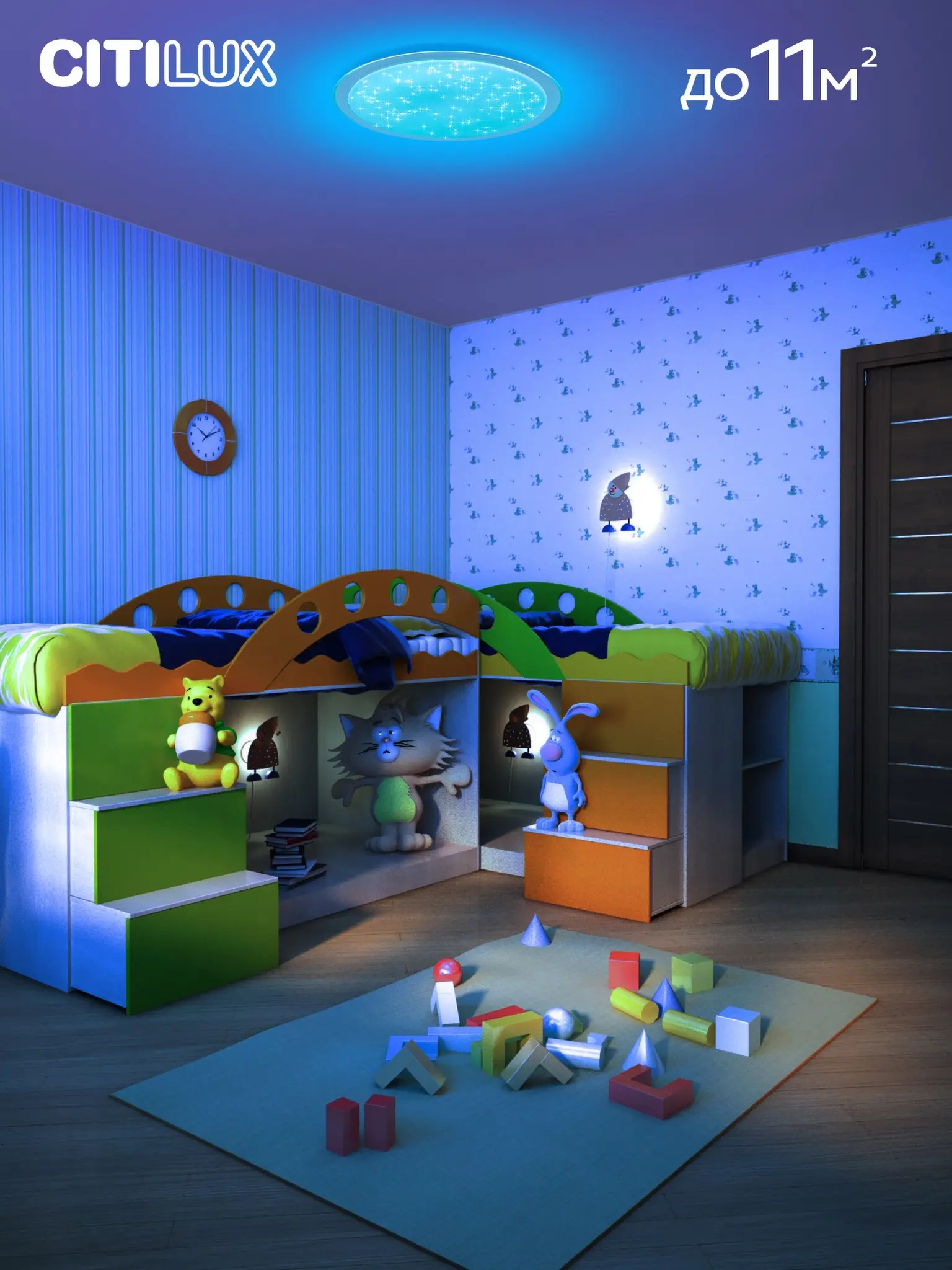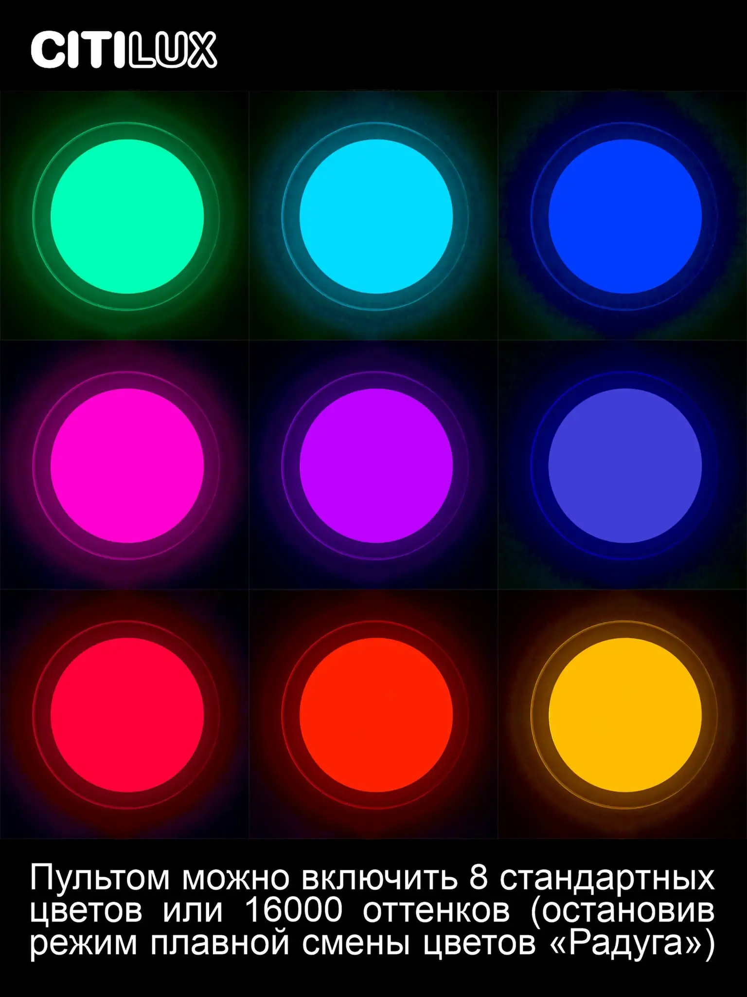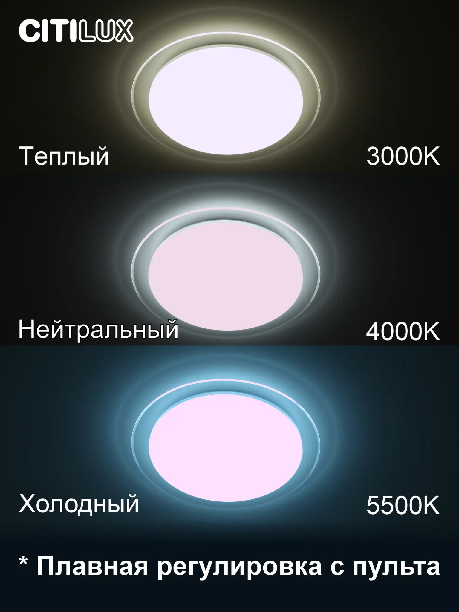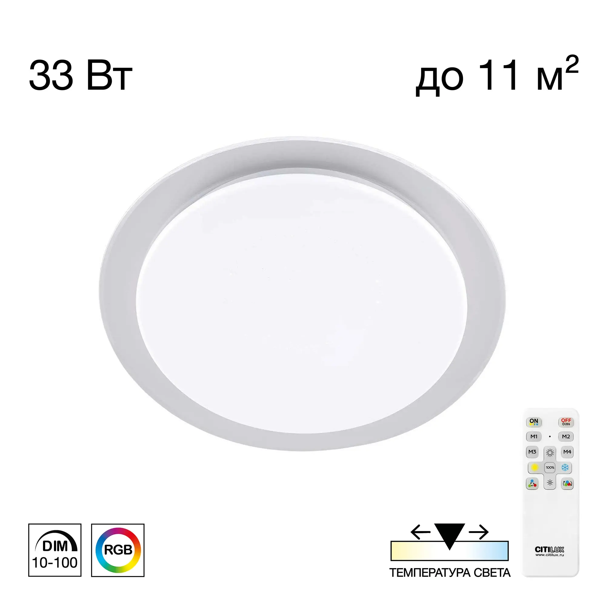 Светодиодная потолочная люстра Citilux Спутник CL734330G с яркой цветной RGB подсветкой всего плафона. Светильник плоский, круглой формы, с металлическим основанием. Плафон белый глянцевый, из оптического полимера с эффектом звездного неба и стильным прозрачным кольцом. Мощность 33Вт, световой поток 2700Лм. Модель с пультом дистанционного управления. Доступна плавная регулировка яркости от 100 до 10%. Плавная регулировка цветовой температурой освещения в диапазоне от 3000К до 5500К, позволяет настроить любые оттенки теплого, нейтрального или холодного света. Цветная RGB подсветка имеет различные режимы работы. Таймер - функция отсроченного на 20сек. выключения. Четыре кнопки памяти позволяют сохранить настроенные режимы работы и включать их с пульта или обычным настенным выключателем. Пульт ДУ инфракрасный в комплекте, тип батареек ААА (батарейками не комплектуется),