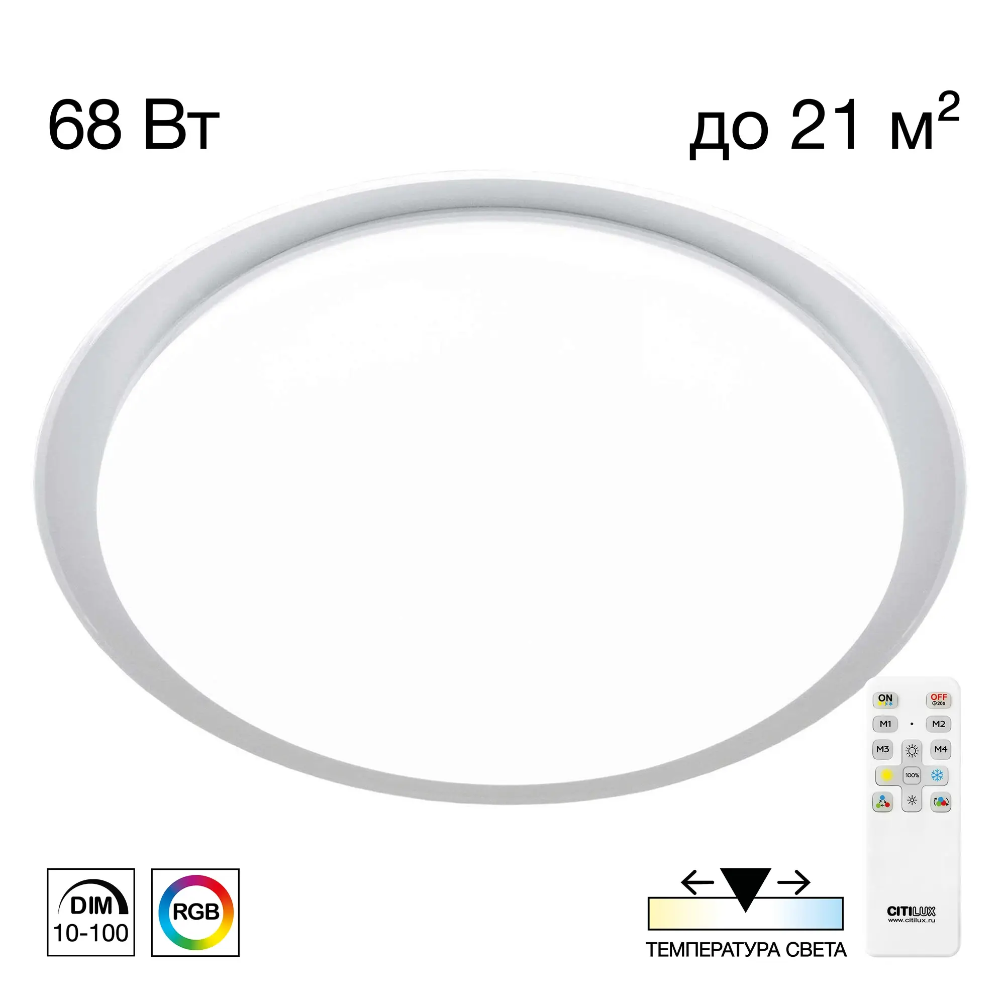 Светодиодная потолочная люстра Citilux Спутник CL734680G с яркой цветной RGB подсветкой всего плафона. Светильник плоский, круглой формы, с металлическим основанием. Плафон белый глянцевый, из оптического полимера с эффектом звездного неба и стильным прозрачным кольцом. Мощность 68Вт, световой поток 5800Лм. Модель с пультом дистанционного управления. Доступна плавная регулировка яркости от 100 до 10%. Плавная регулировка цветовой температурой освещения в диапазоне от 3000К до 5500К, позволяет настроить любые оттенки теплого, нейтрального или холодного света. Цветная RGB подсветка имеет различные режимы работы. Таймер - функция отсроченного на 20сек. выключения. Четыре кнопки памяти позволяют сохранить настроенные режимы работы и включать их с пульта или обычным настенным выключателем. Пульт ДУ инфракрасный в комплекте, тип батареек ААА (батарейками не комплектуется).,
