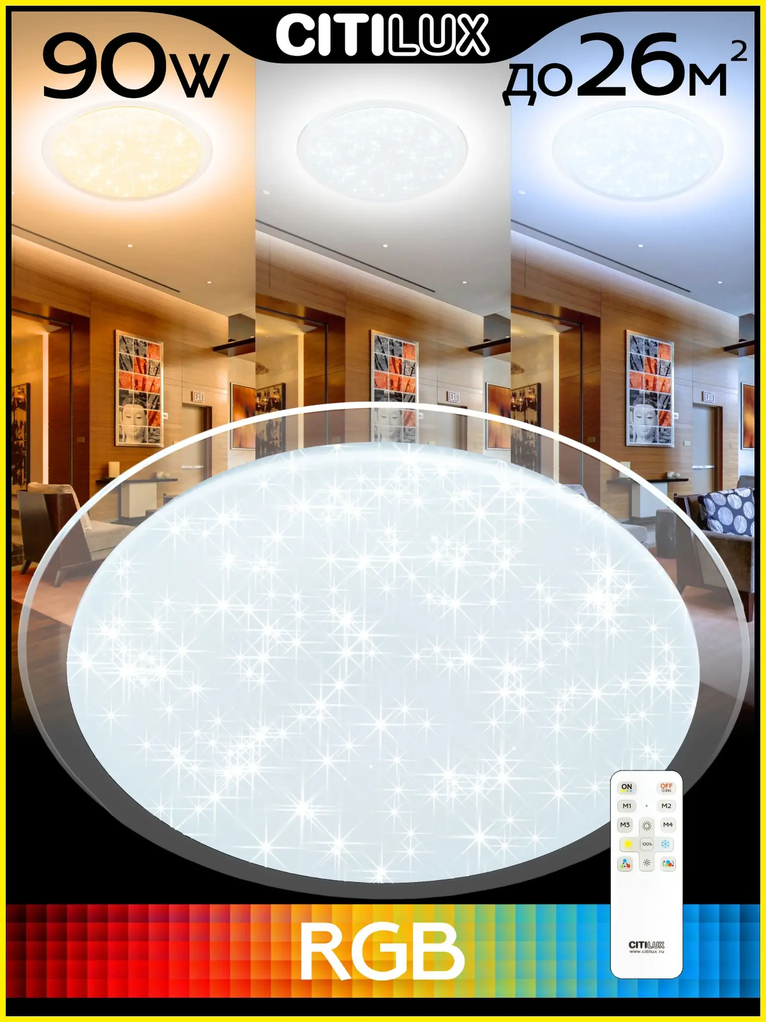 Светодиодная потолочная люстра Citilux Спутник CL734900G с яркой цветной RGB подсветкой всего плафона. Светильник плоский, круглой формы, с металлическим основанием. Плафон белый глянцевый, из оптического полимера с эффектом звездного неба и стильным прозрачным кольцом. Мощность 90Вт, световой поток 7700Лм. Доступна плавная регулировка яркости от 100 до 10%. Плавная регулировка цветовой температурой освещения в диапазоне от 3000К до 5500К, позволяет настроить любые оттенки теплого, нейтрального или холодного света. Цветная RGB подсветка имеет различные режимы работы. Таймер - функция отсроченного на 20сек. выключения. Четыре кнопки памяти позволяют сохранить настроенные режимы работы и включать их с пульта или обычным настенным выключателем. Пульт ДУ инфракрасный в комплекте, тип батареек ААА (батарейками не комплектуется).,