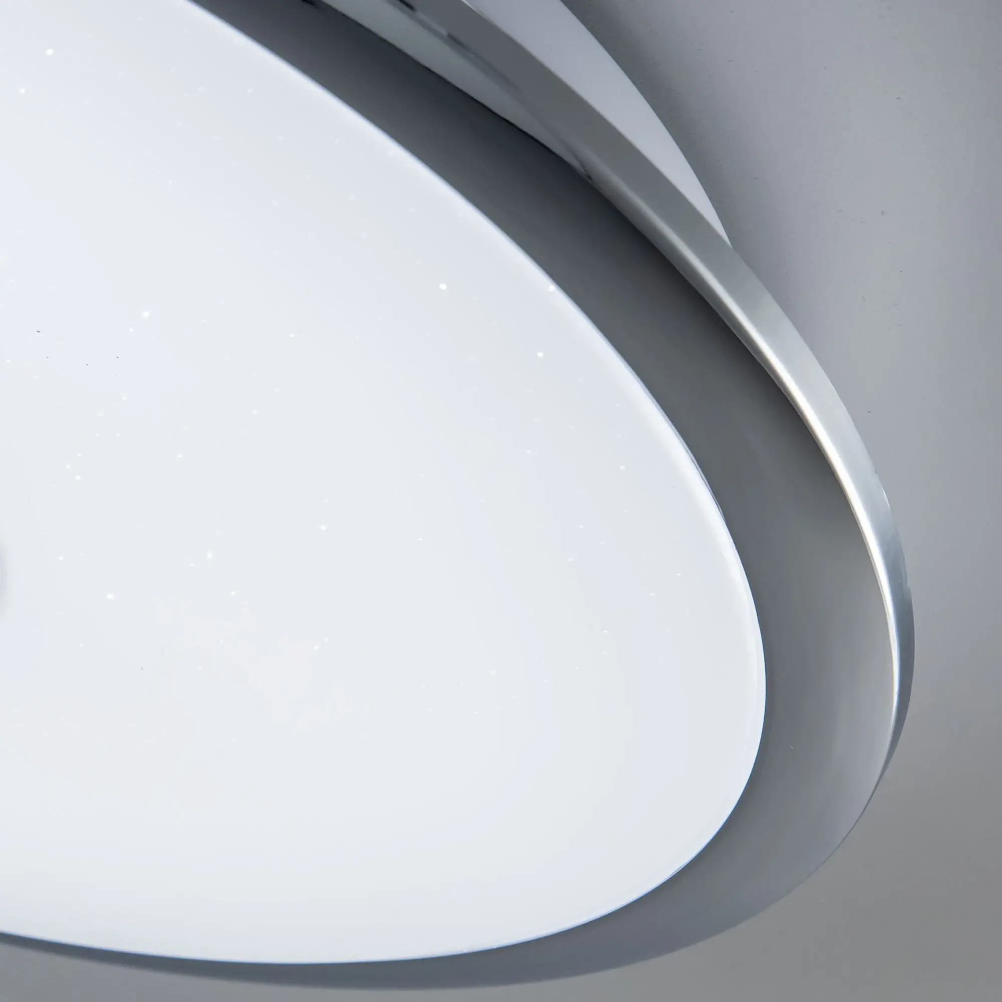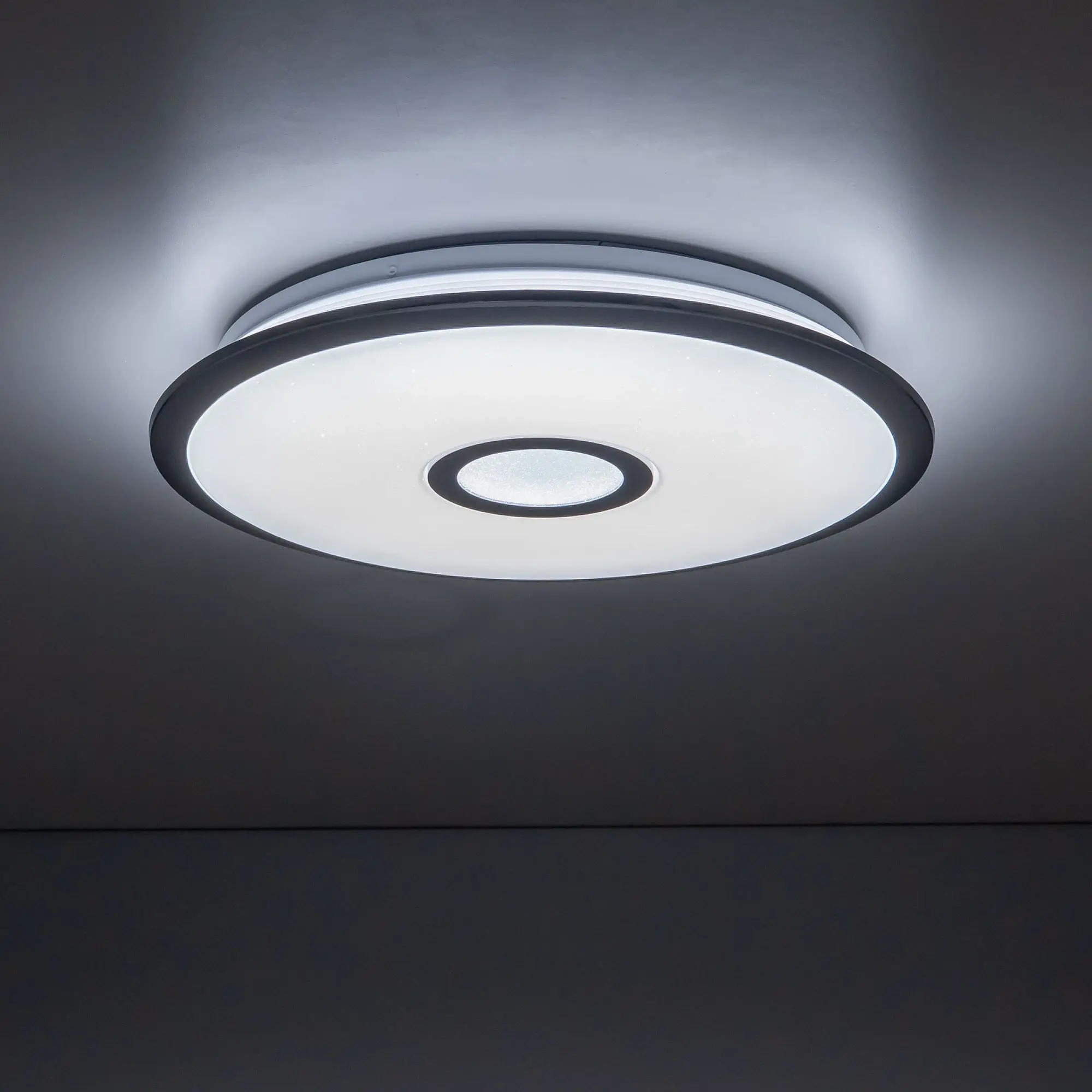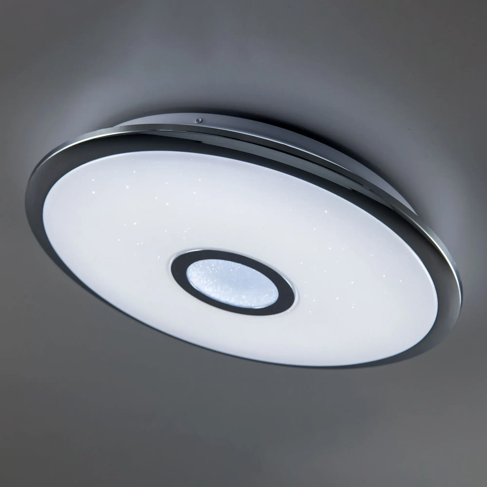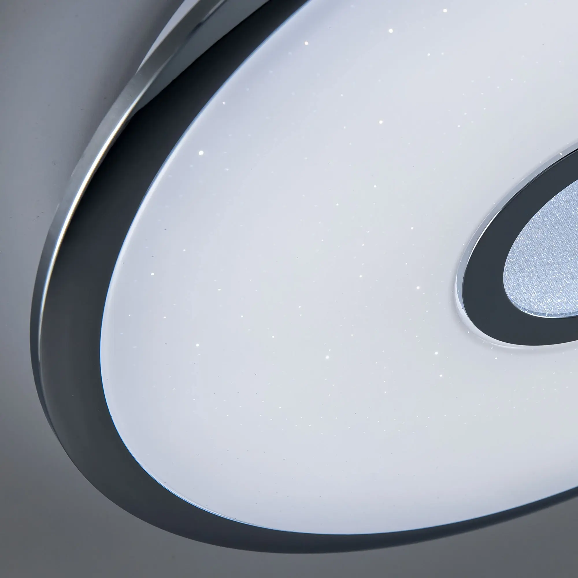 Выпускается с белым глянцевым плафоном с эффектом звездного неба и декоративными элементами в цвете хром. Светильник накладной, круглой формы, крепление подходит для всех типов потолков, в том числе натяжных.