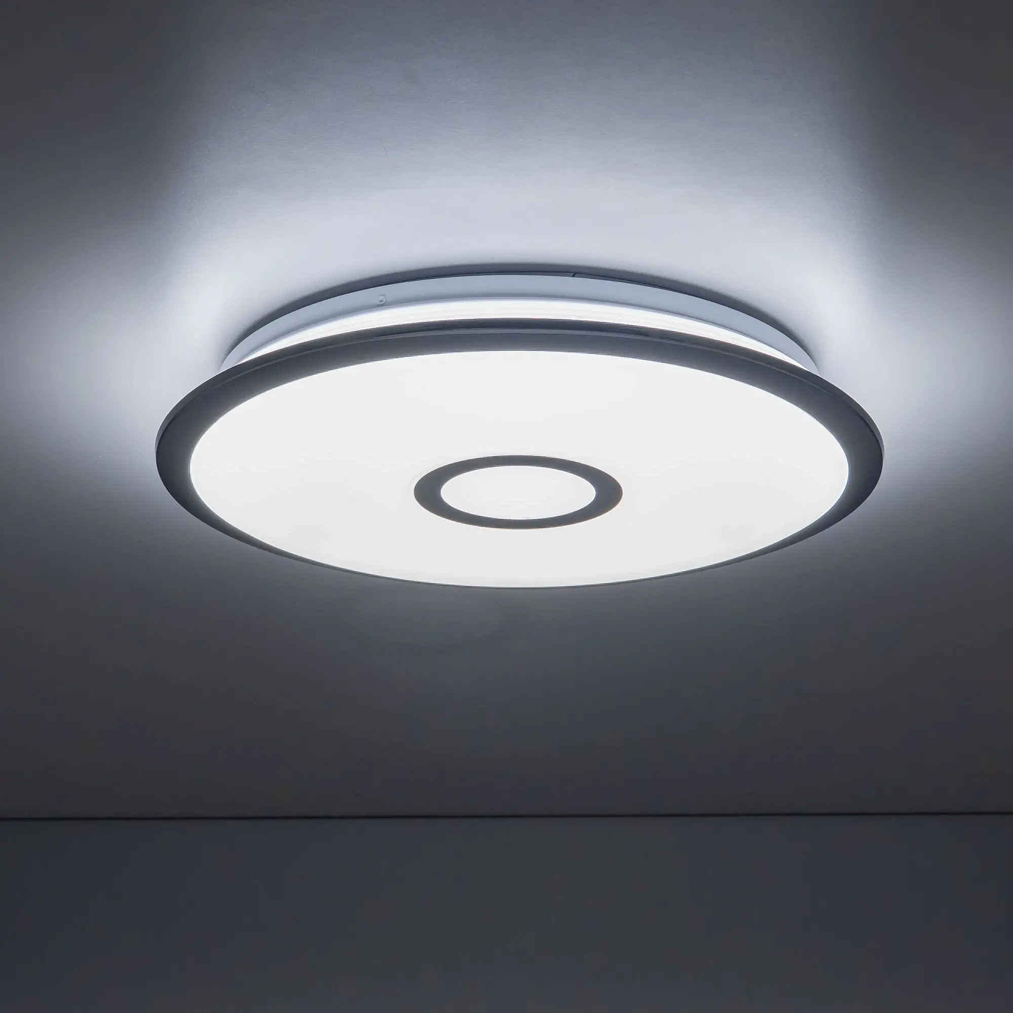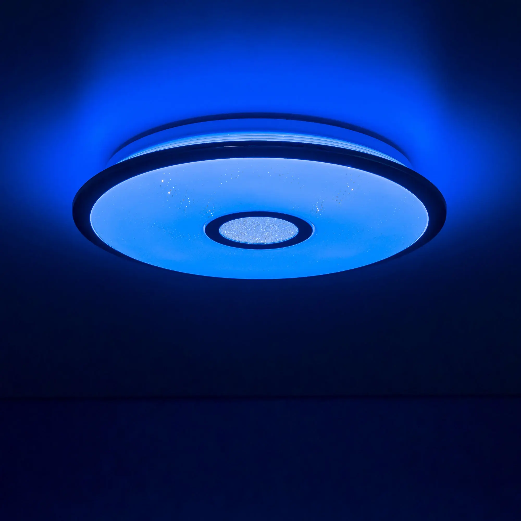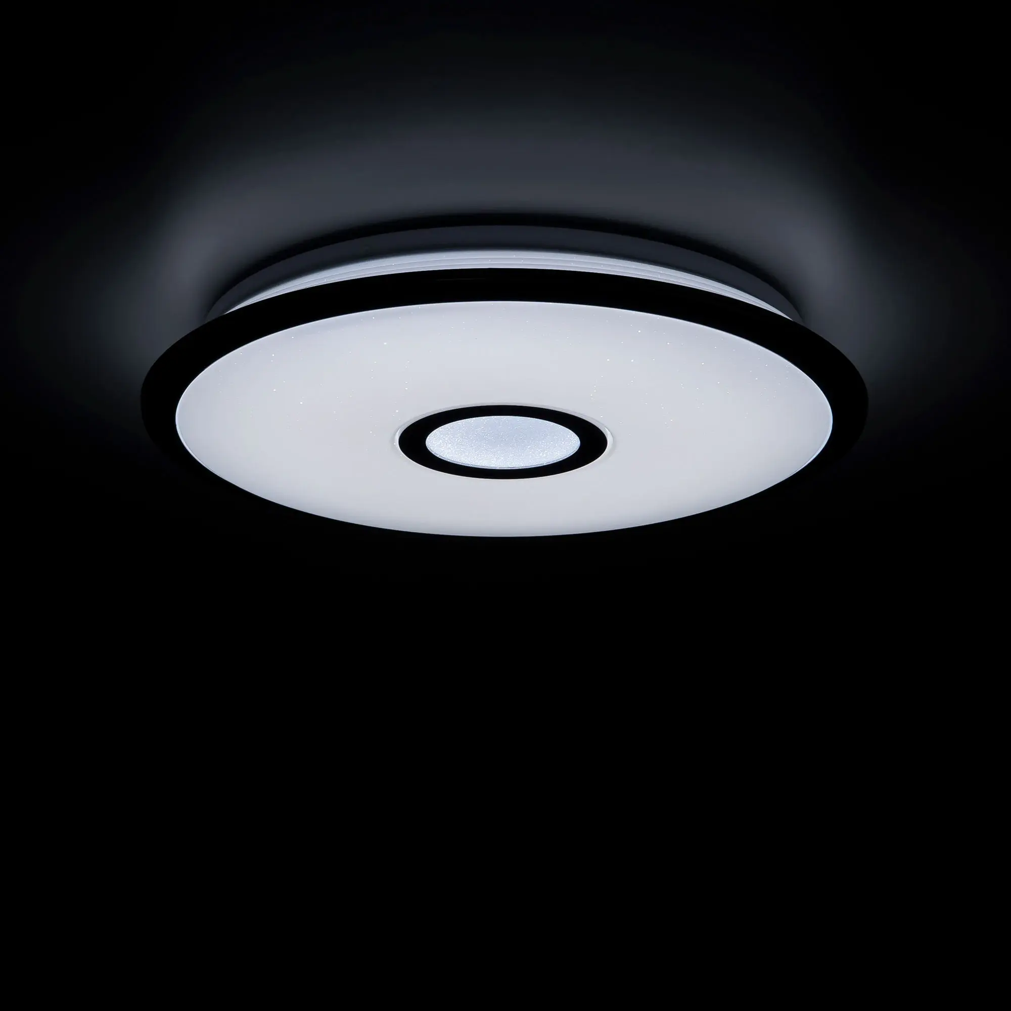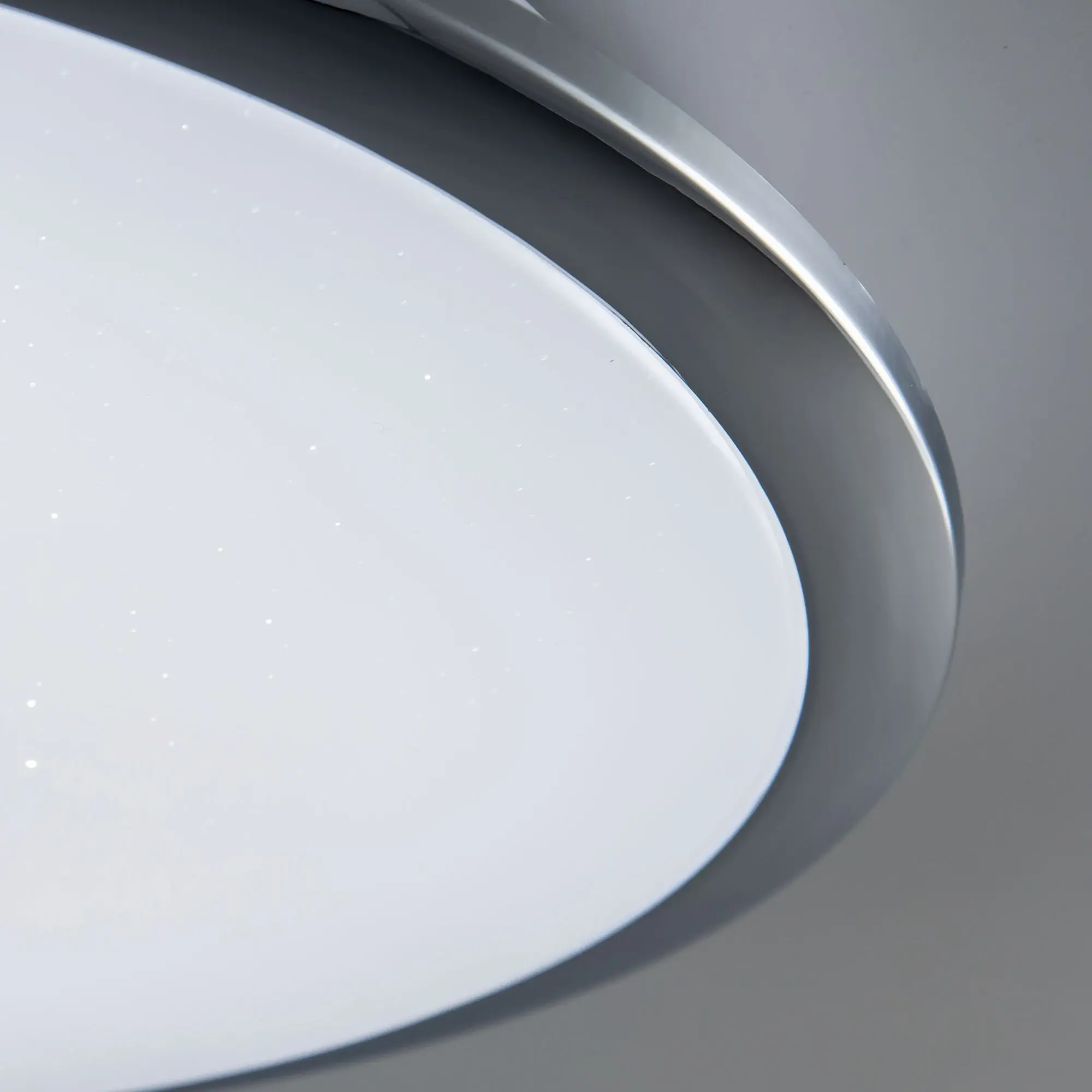 Выпускается с белым глянцевым плафоном с эффектом звездного неба и декоративными элементами в цвете хром. Светильник накладной, круглой формы, крепление подходит для всех типов потолков, в том числе натяжных.