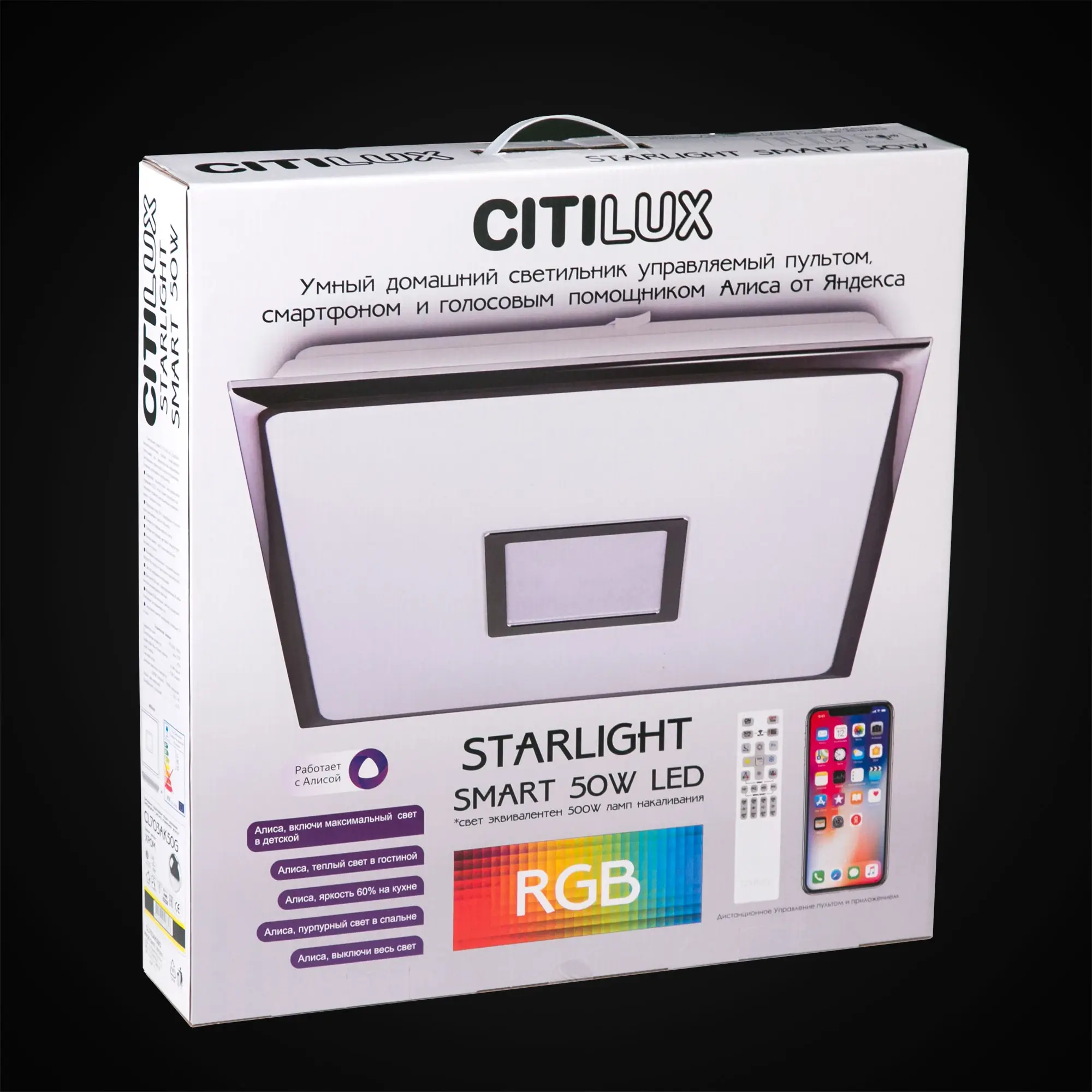 Светодиодная потолочная люстра Citilux Старлайт Смарт CL703AK50G с голосовым управлением является ярким представителем современных УМНЫХ хай-тек светильников экосистемы Citilux SMART . Выпускается с белым глянцевым плафоном с эффектом звездного неба и декоративными элементами в цвете хром. Светильник накладной, квадратной формы, крепление подходит для всех типов потолков, в том числе натяжных. Моделью можно управлять: из приложения на смартфоне по Wi-Fi при наличии интернета, с помощью голосовых помощников Алиса и Маруся, есть возможность запуска настроенных сценариев с помощью Сири, а также пультом дистанционного управления и с настенного выключателя. Модель оснащена мощными светодиодами холодного и теплого света, независимой цветной подсветкой RGB. Мощность светильника 55Вт, с диммером и функцией плавной регулировки,