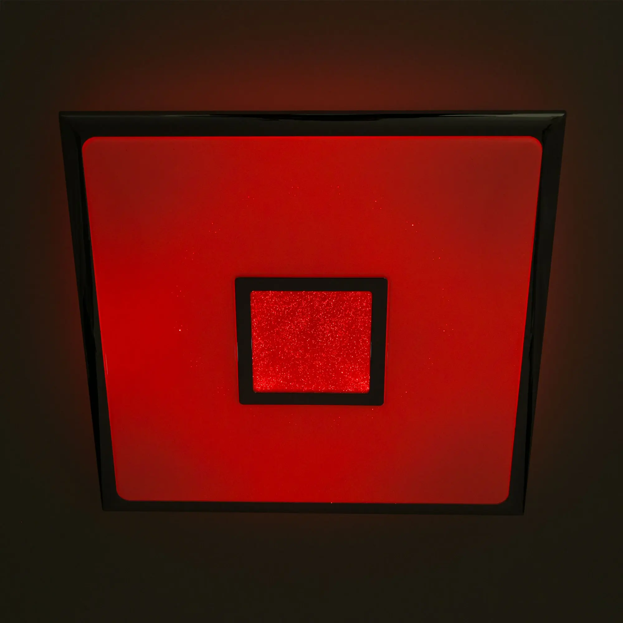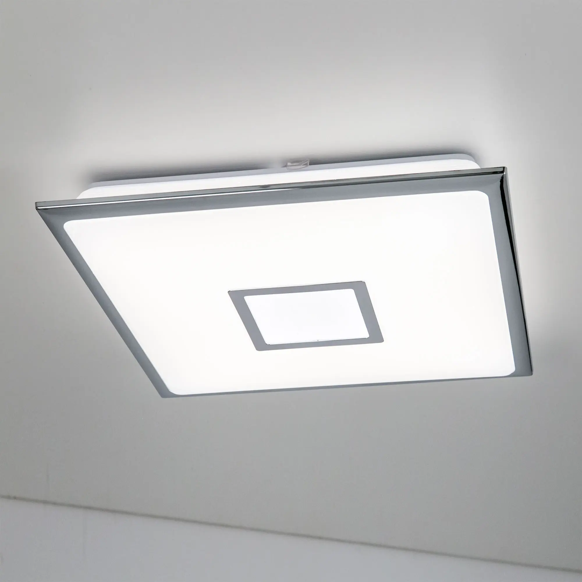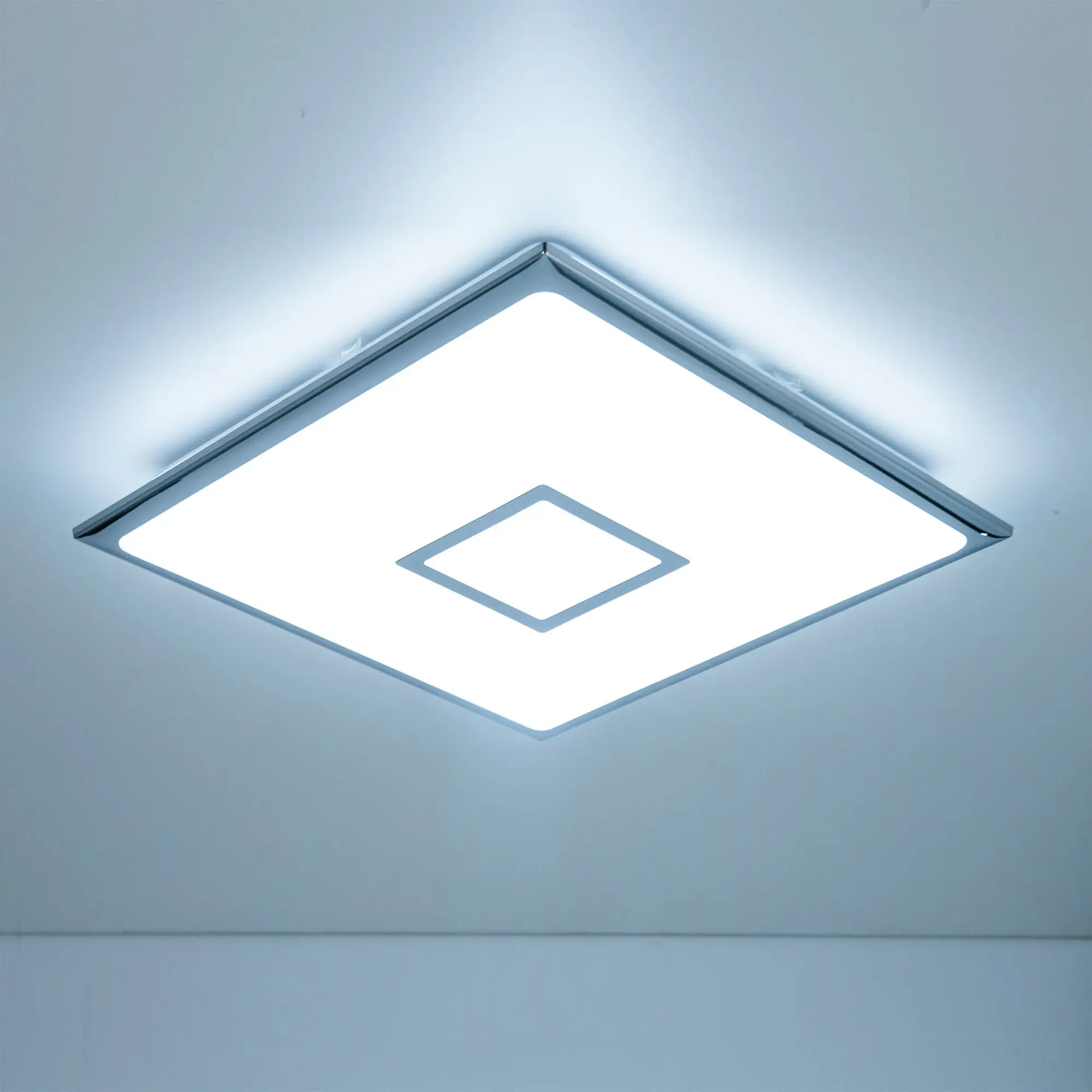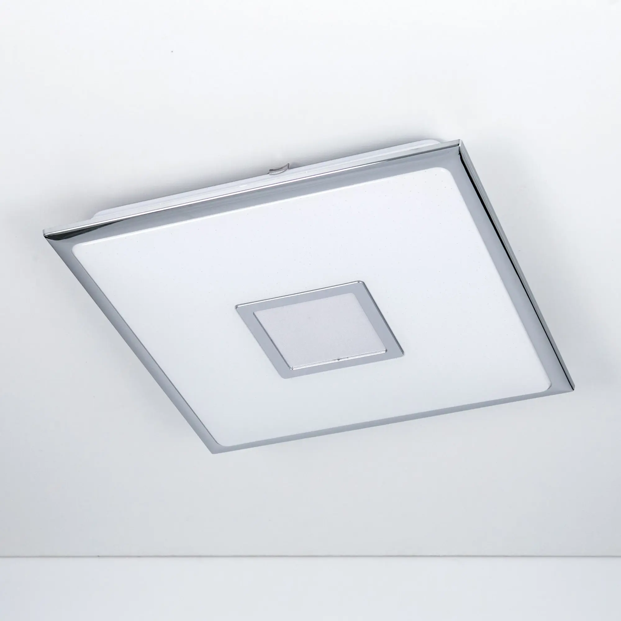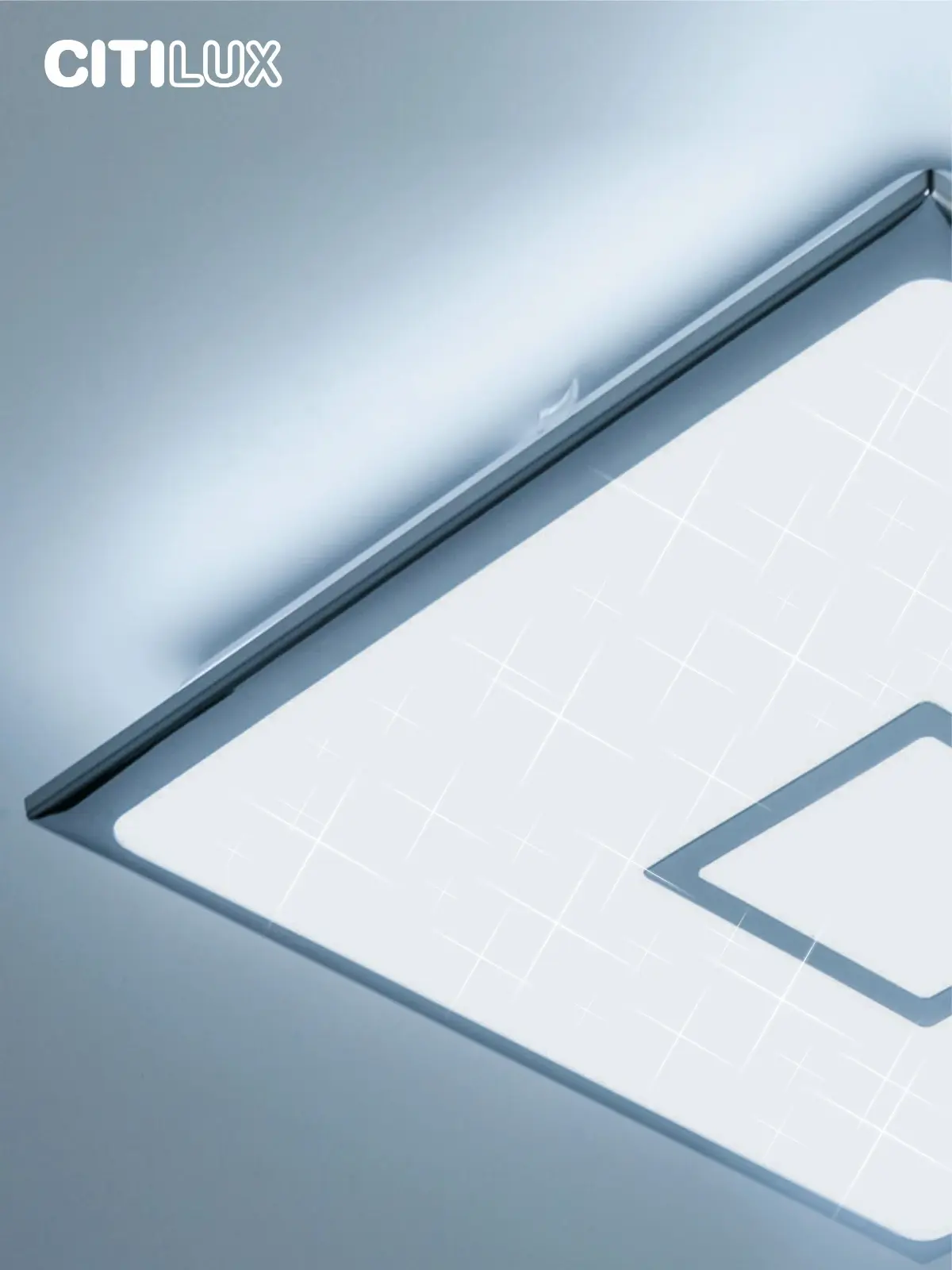 Выпускается с белым глянцевым плафоном с эффектом звездного неба и декоративными элементами в цвете хром. Светильник накладной, квадратной формы, крепление подходит для всех типов потолков, в том числе натяжных.