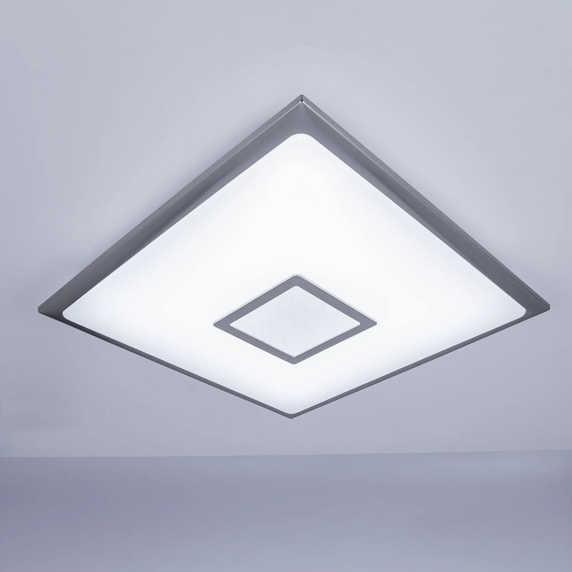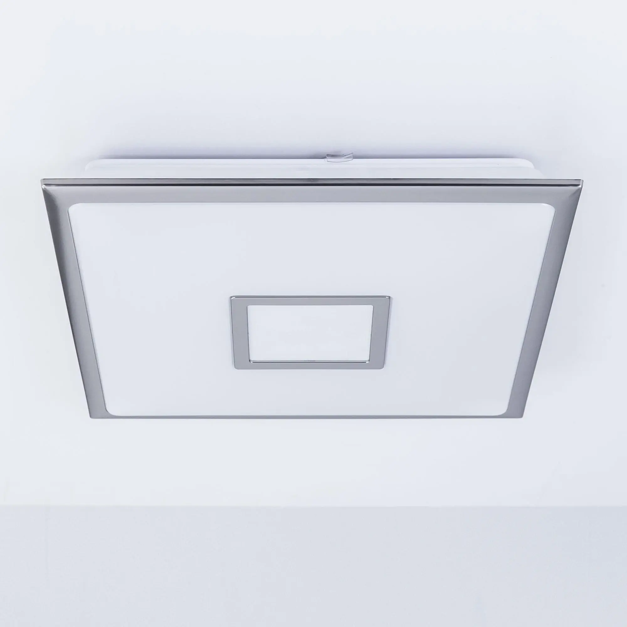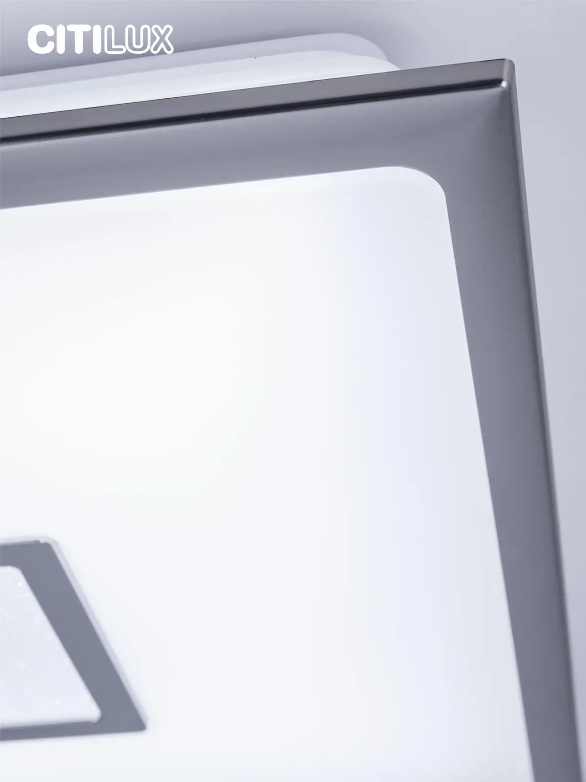 Выпускается с белым матовым плафоном и декоративными элементами в цвете матовый хром. Светильник накладной, квадратной формы, крепление подходит для всех типов потолков, в том числе натяжных.