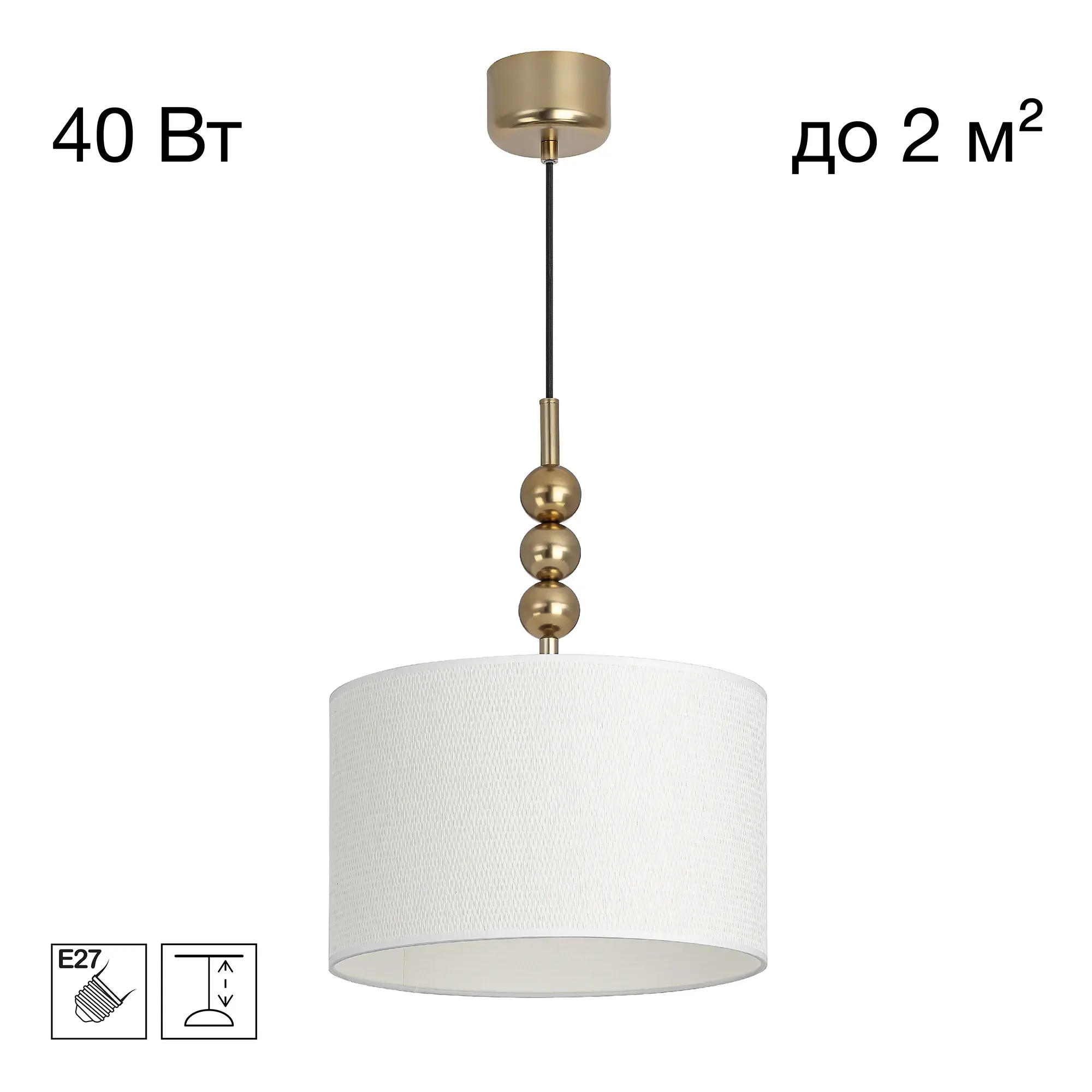 Металлический золотистый каркас светильника дополняют декоративные элементы — несколько шариков на стойке. Цилиндрический абажур из белого матового текстиля создает мягкое заливное освещение, которое придаст уюта вашей гостиной, спальне или коридору.