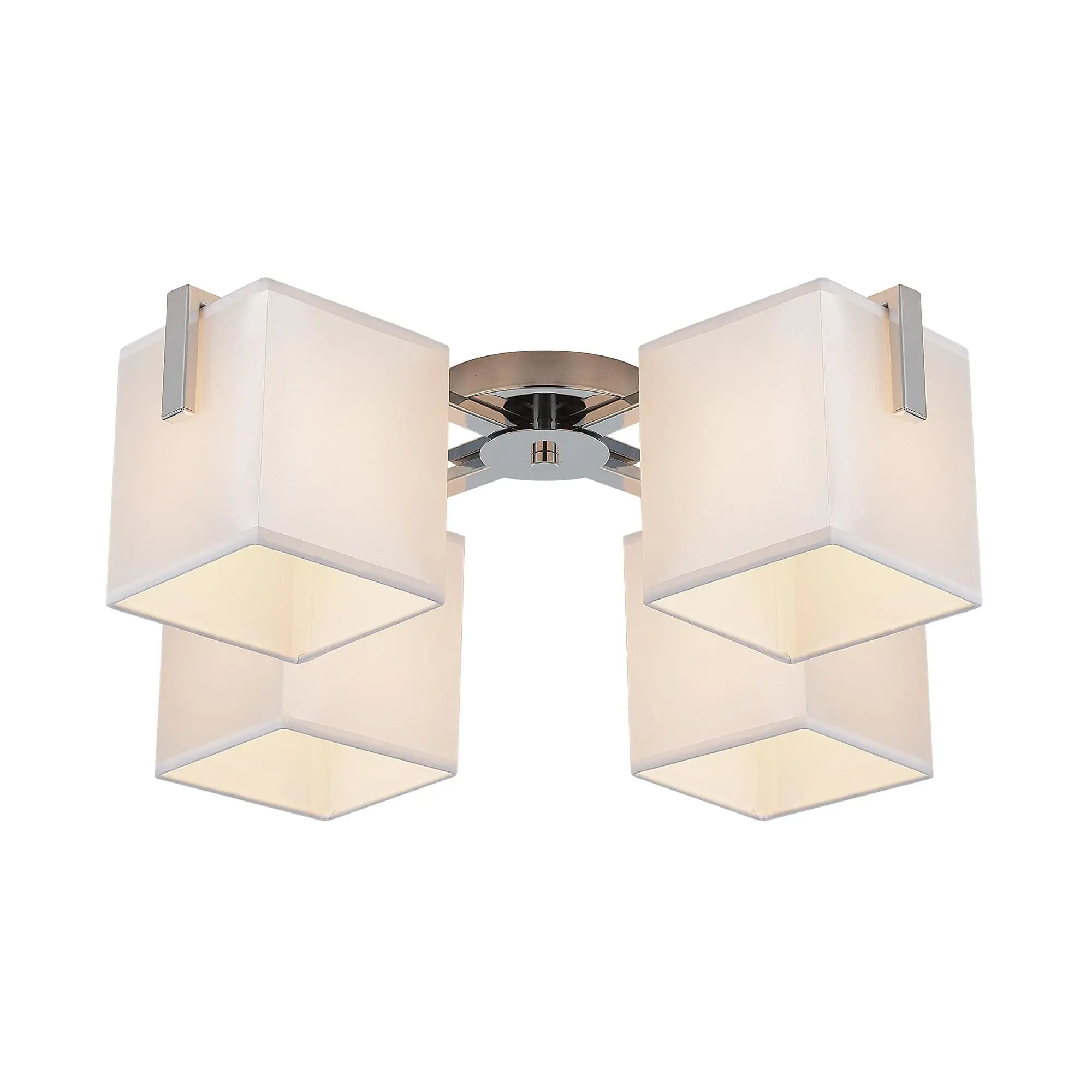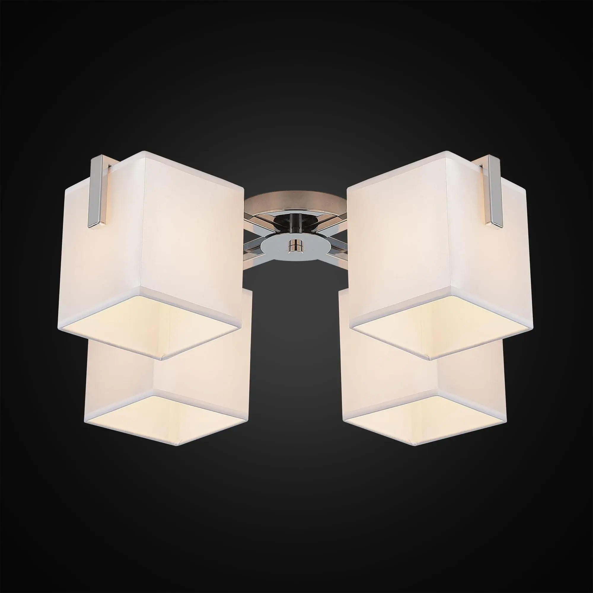 Потолочная люстра Citilux Стенли CL465141 выполнена в современном стиле. Корпус металлический с глянцевой хромированной поверхностью. Квадратные плафоны изготовлены из гладкой ткани жемчужного цвета на подложке из оптического полимера.
