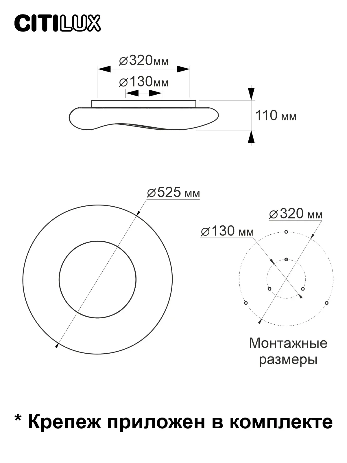 Мощность светильника 65Вт, что равно 650Вт ламп накаливания. Свет без мерцаний и пульсаций с высоким качеством цветопередачи (CRI > 85). Диапазон регулировок цветовой температуры от 3000К до 5500К, с возможностью настроить любые оттенки теплого, нейтрального и холодного света. Есть яркая цветная подсветка всего плафона с несколькими режимами работы. Площадь освещения около 18 кв. метров. Пульт ДУ в комплекте, тип батареек ААА (батарейками не комплектуется).