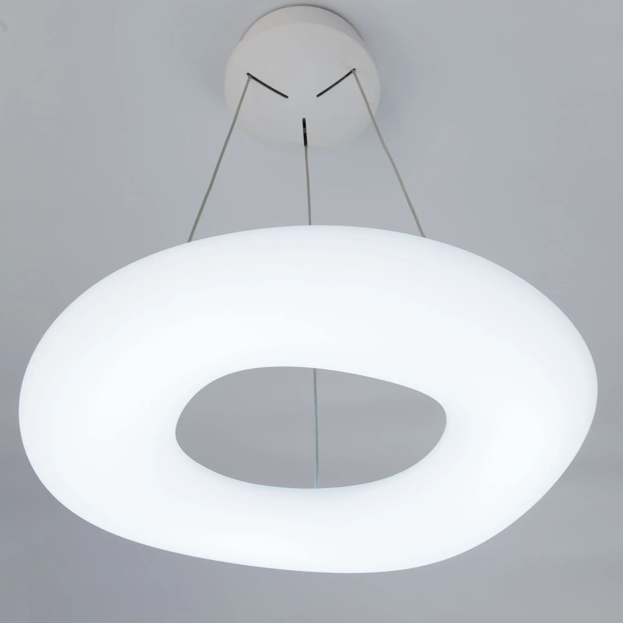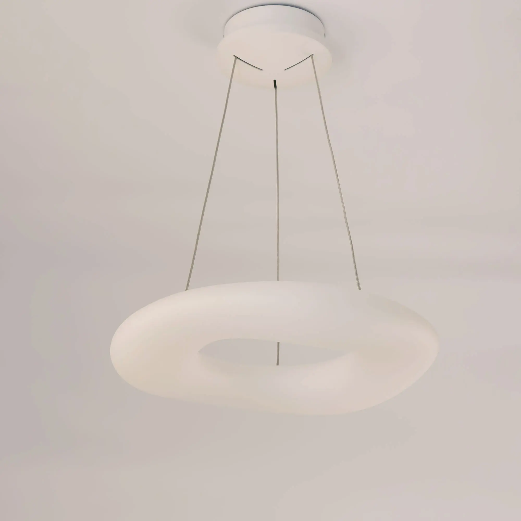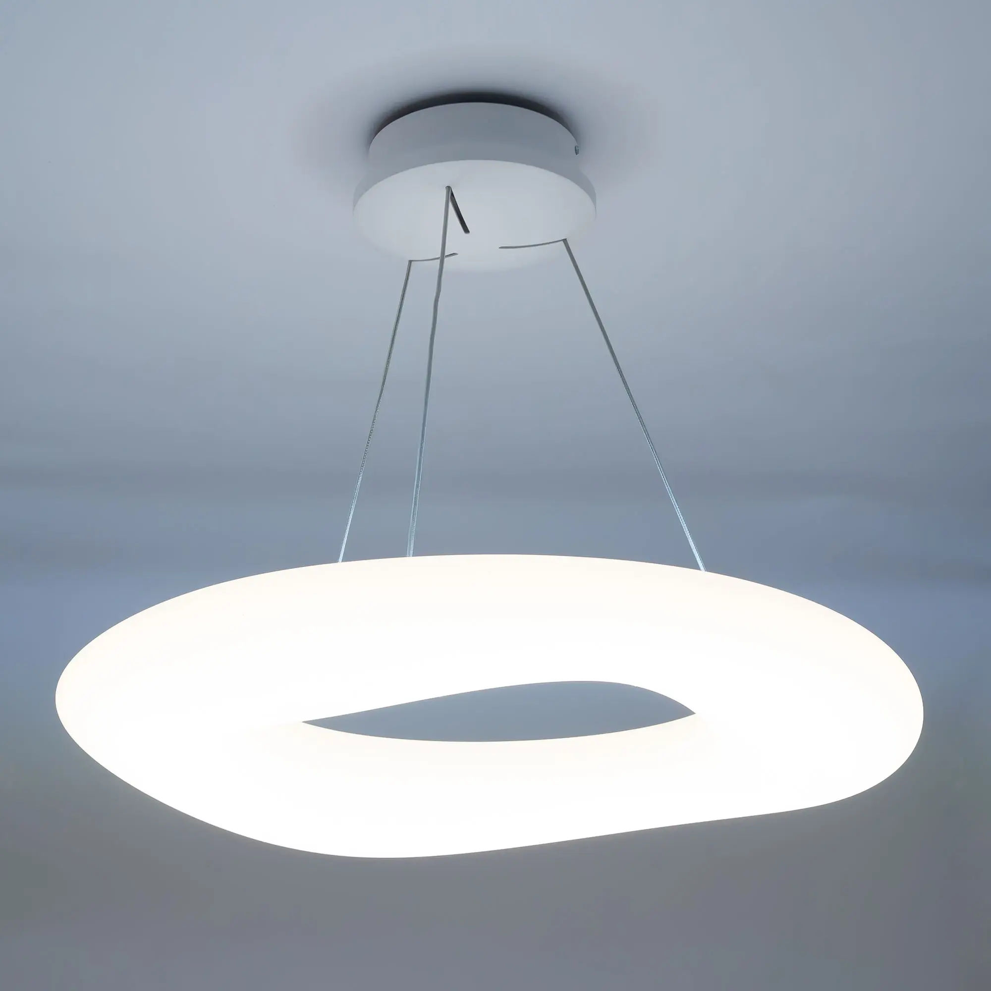 Люстра на тросах в форме подвесного кольца (бублик), высоту и угол наклона которого можно изменить. Корпус изготовлен из белого ударопрочного полимера, рассеиватель оптический полимер, цвет белый матовый. Крепление люстры подходит для всех типов потолков, в том числе натяжных. Тип крепления – планка. Суммарная мощность светильника 104Вт, что равно 1040Вт ламп накаливания. Свет без мерцаний и пульсаций с высоким качеством цветопередачи (CRI > 85).