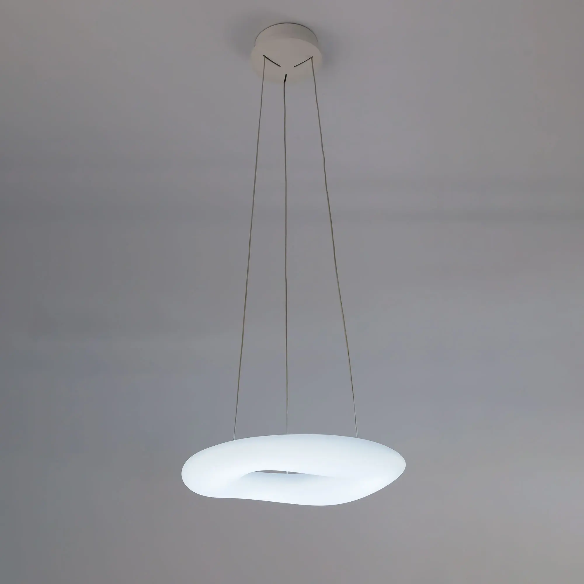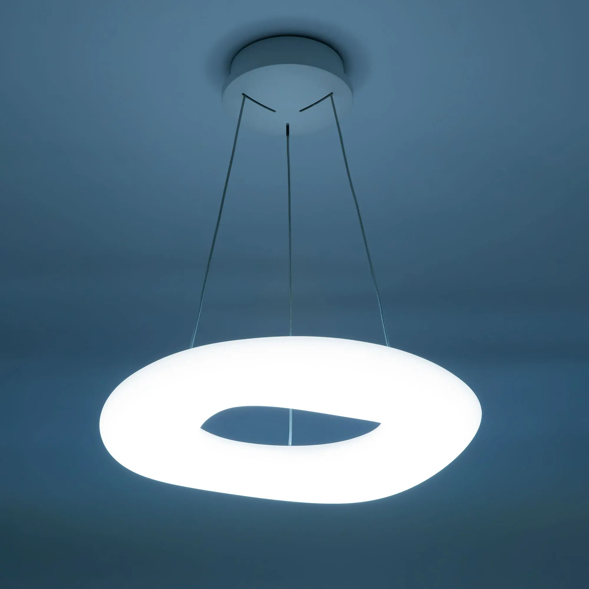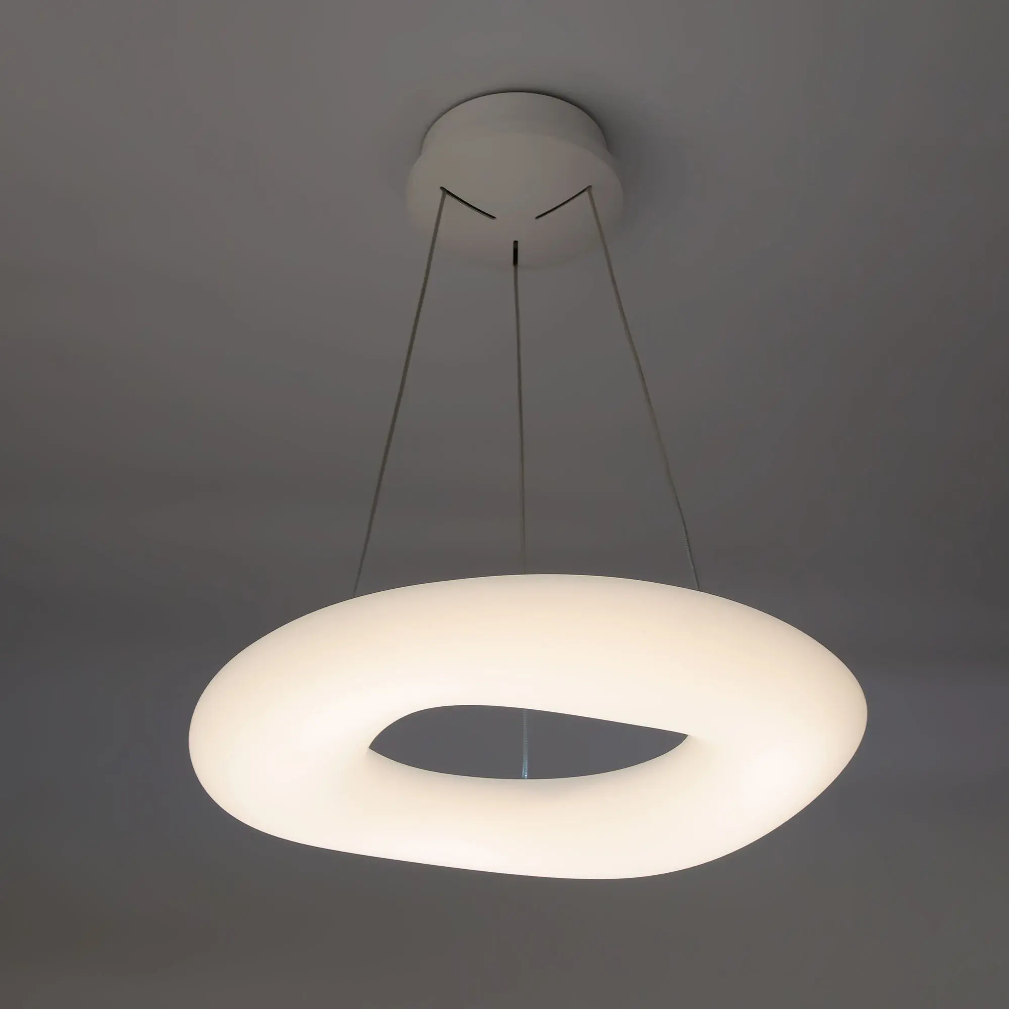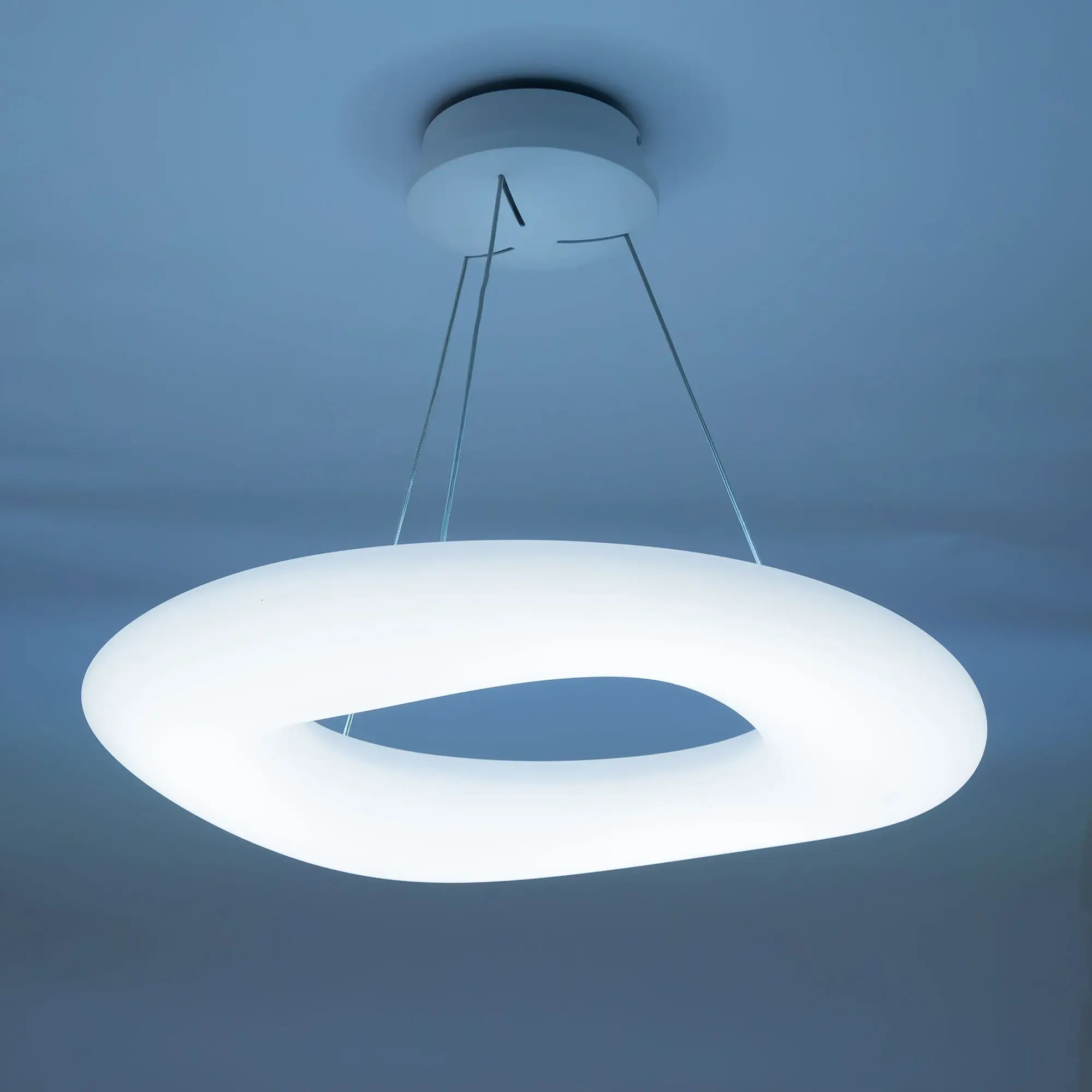 Люстра на тросах в форме подвесного кольца (бублик), высоту и угол наклона которого можно изменить. Корпус изготовлен из белого ударопрочного полимера, рассеиватель оптический полимер, цвет белый матовый. Крепление люстры подходит для всех типов потолков, в том числе натяжных. Тип крепления – планка. Суммарная мощность светильника 104Вт, что равно 1040Вт ламп накаливания. Свет без мерцаний и пульсаций с высоким качеством цветопередачи (CRI > 85).