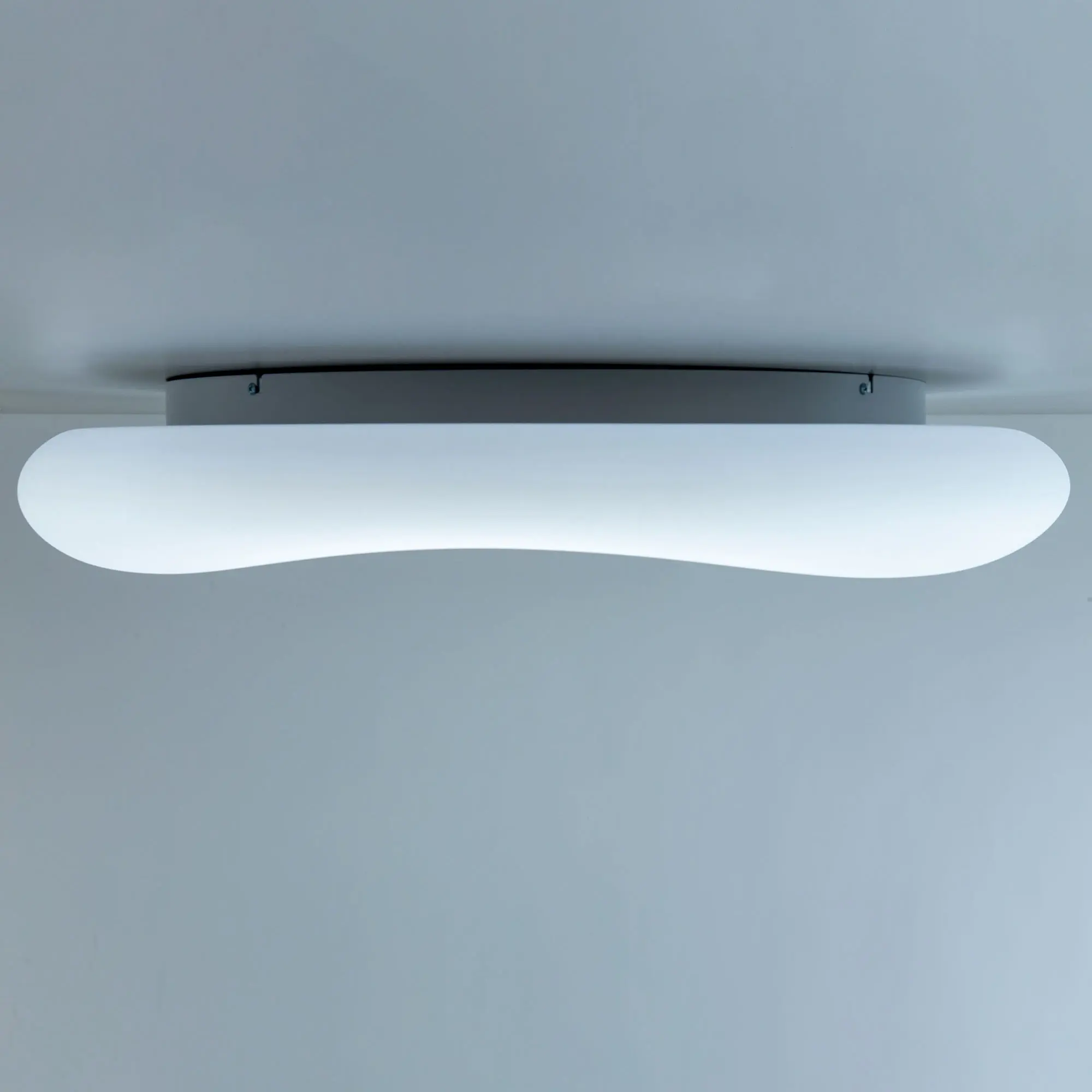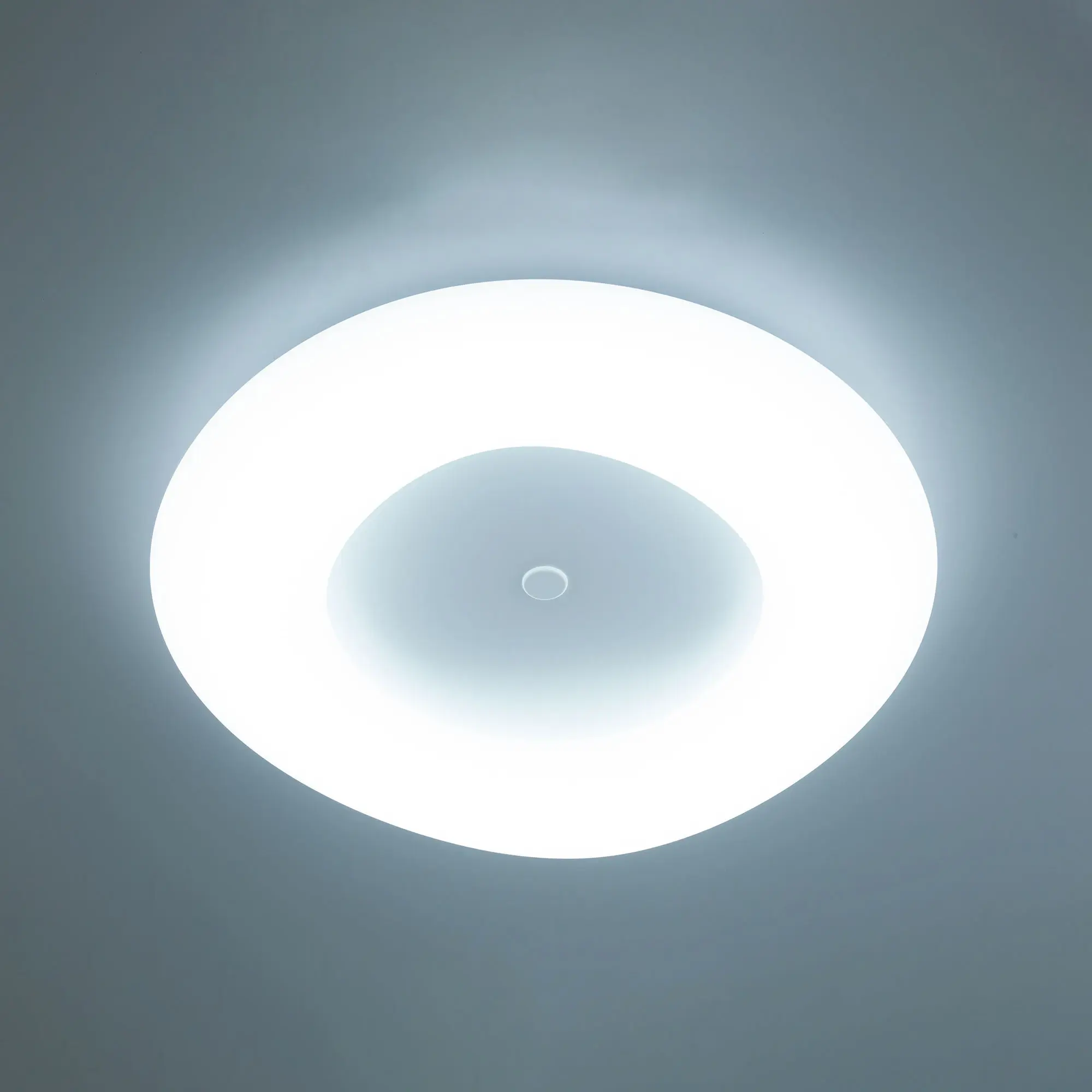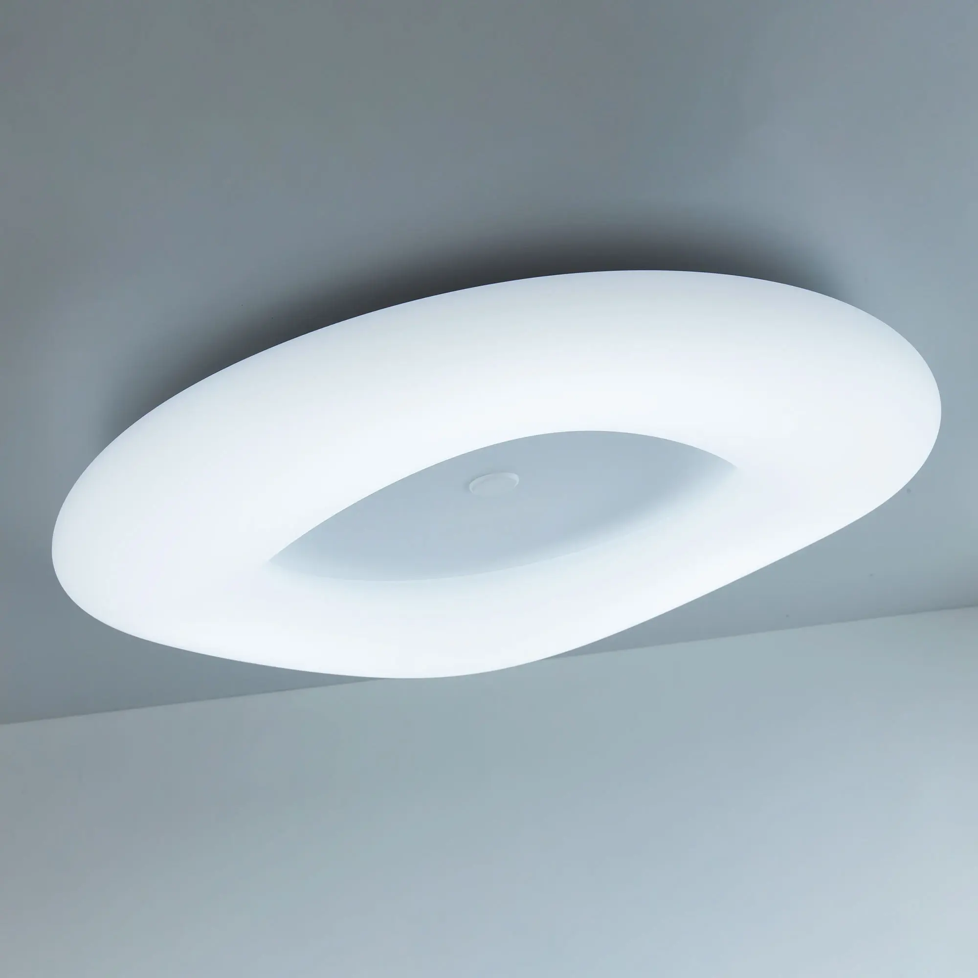 Потолочная люстра в форме кольца (бублик). Корпус металлический, рассеиватель оптический полимер, цвет белый матовый. Крепление люстры подходит для всех типов потолков, в том числе натяжных. Тип крепления – планка.