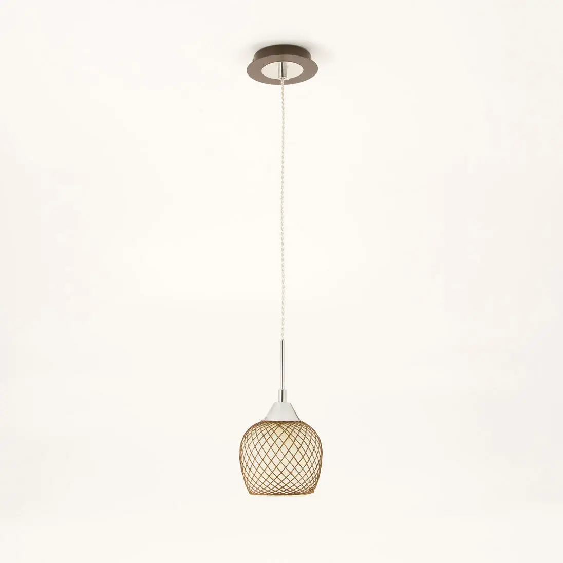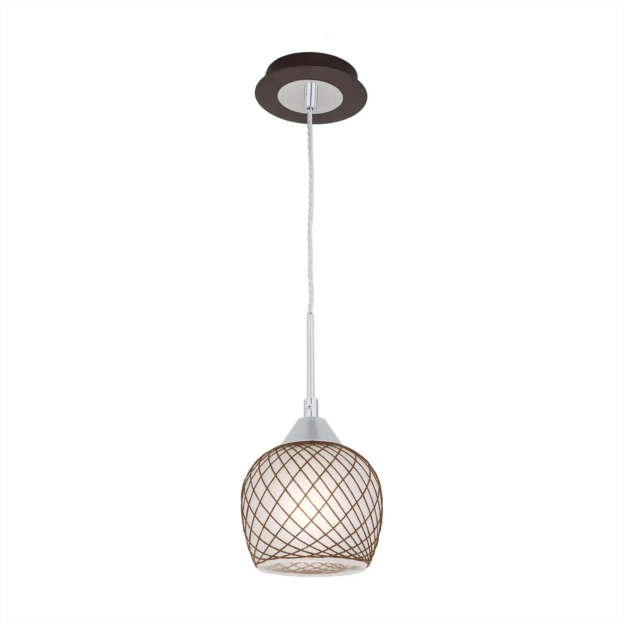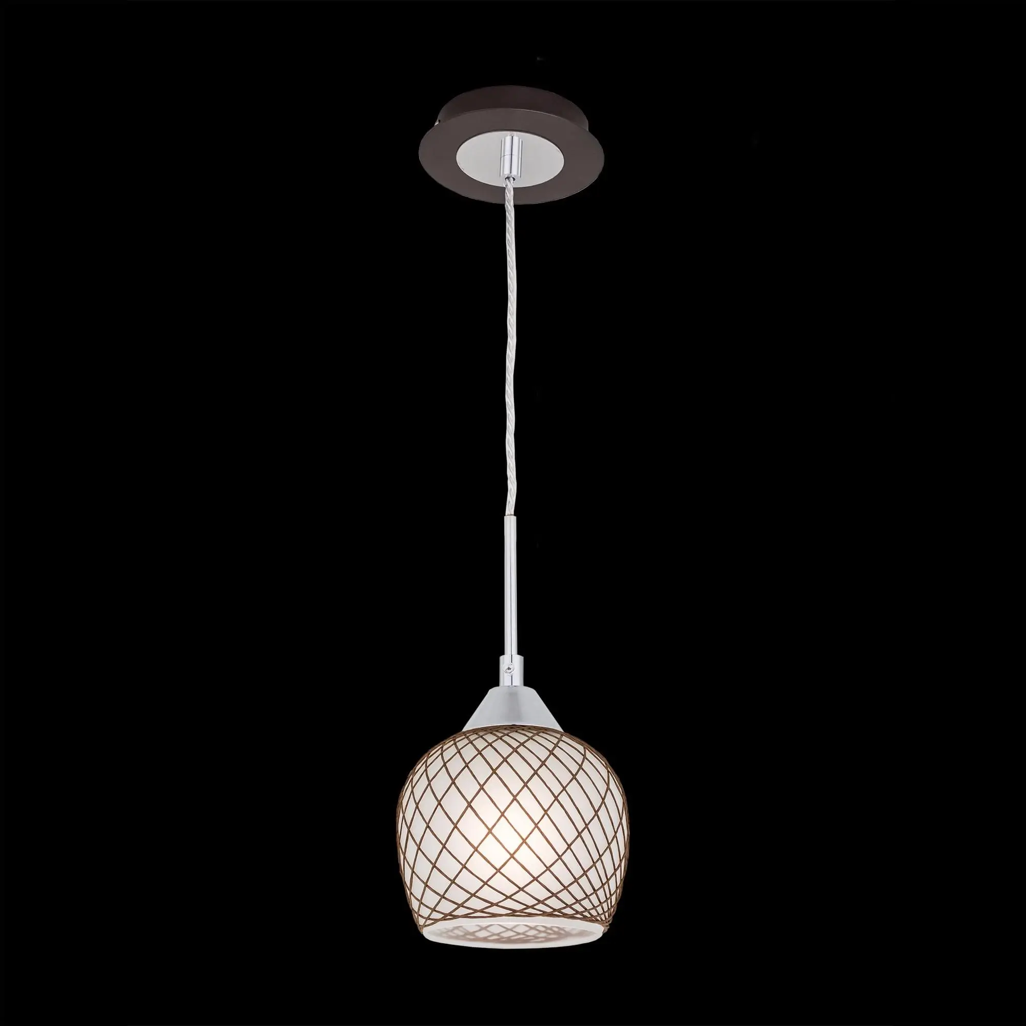 Подвесной светильник из изящной коллекции «Сюзи». Металлическая конструкция светильника со стеклянным плафоном, ажурно оплетенным необычным тканевым узором, делающим светильник в буквальном смысле слова «вязаным» создаст атмосферу уюта и комфорта в вашем доме. Подвес выполнен в цвете венге. Благодаря патрону, изготовленному из высококачественного термостойкого углепластика в данном светильнике допускается использовать светодиодные лампы неограниченной мощности.