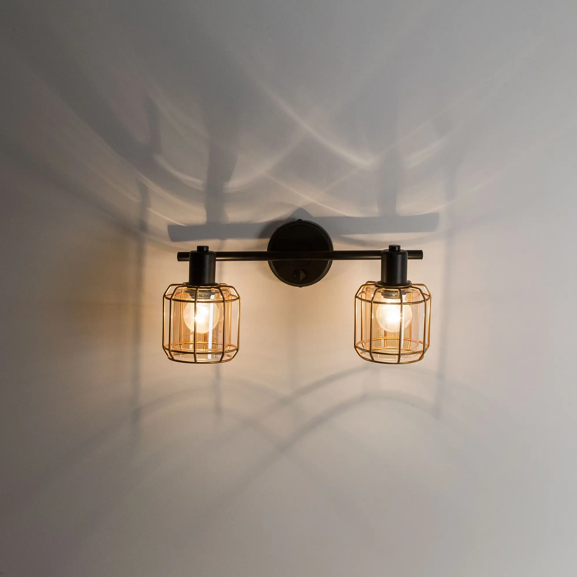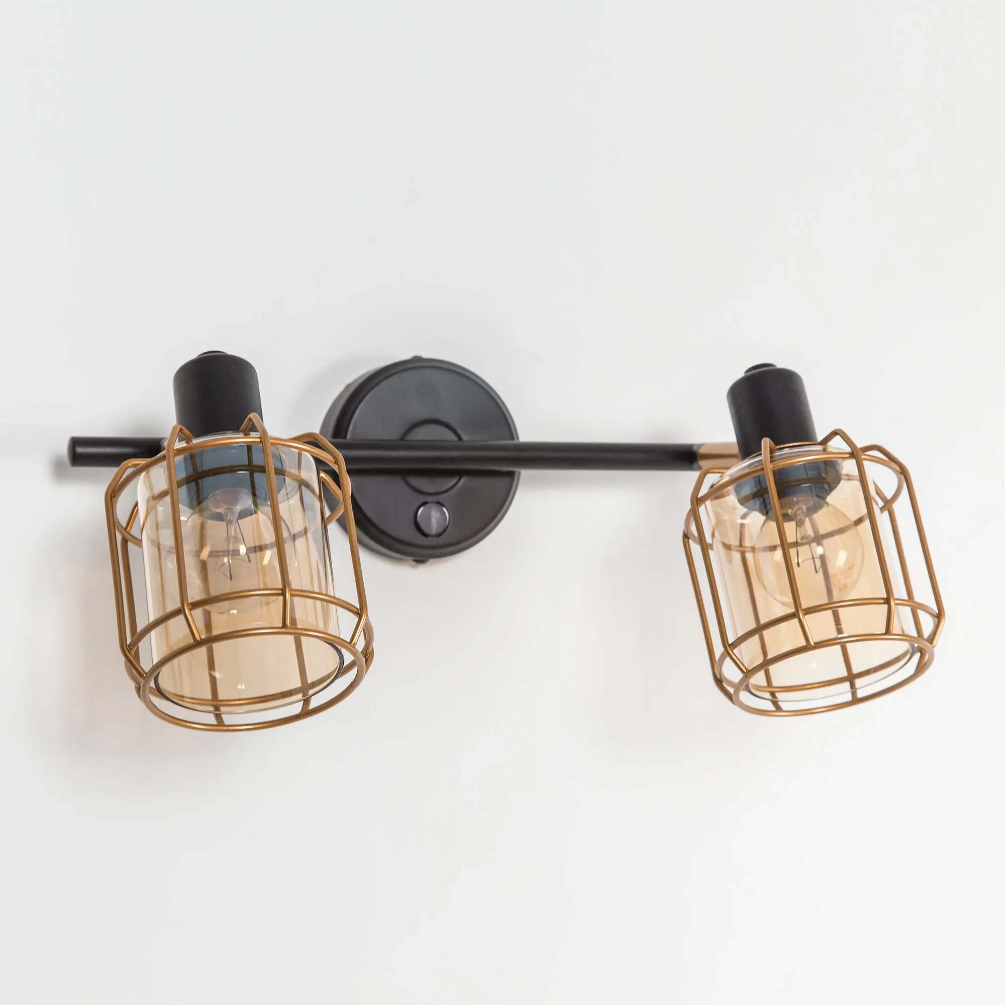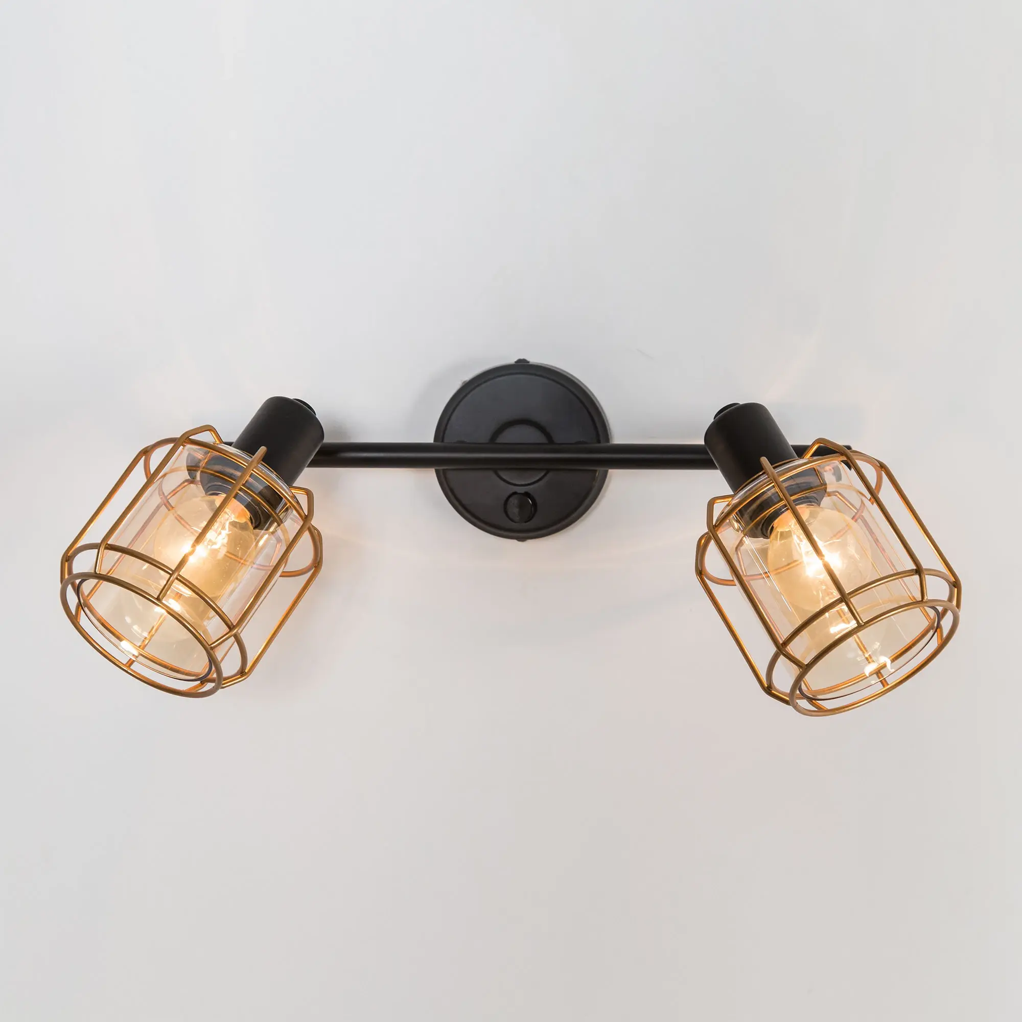 Настенный светильник Citilux Таверна CL542622 с двумя поворотными плафонами выполнен в популярном стиле лофт. Корпус металлический, чёрный с декоративными элементами бронзового цвета. Плафоны из прозрачного стекла светло-янтарного оттенка.