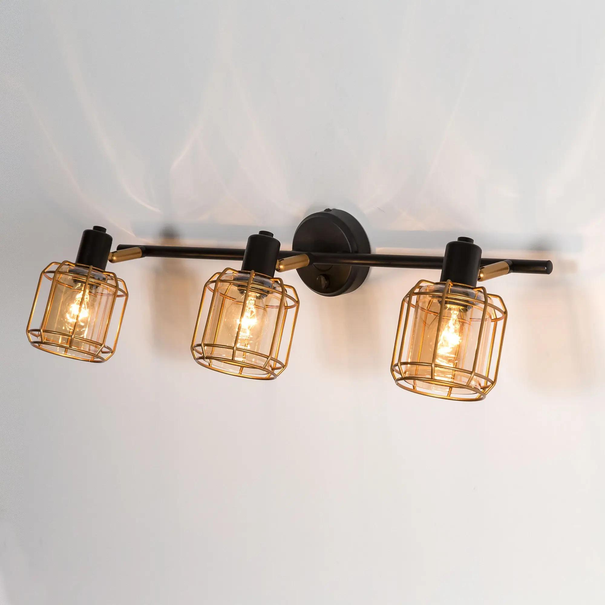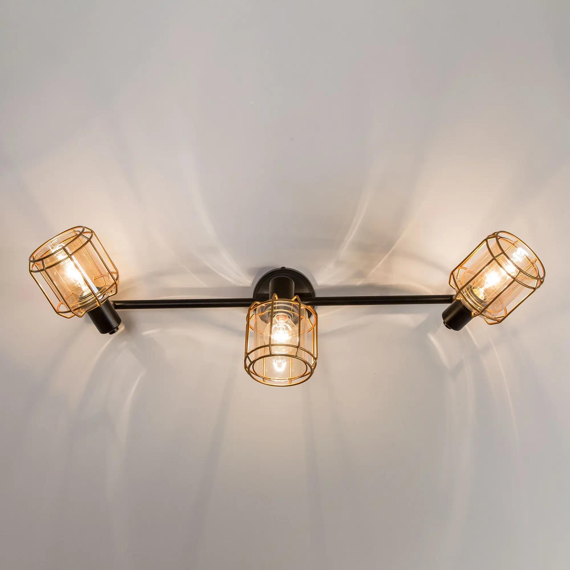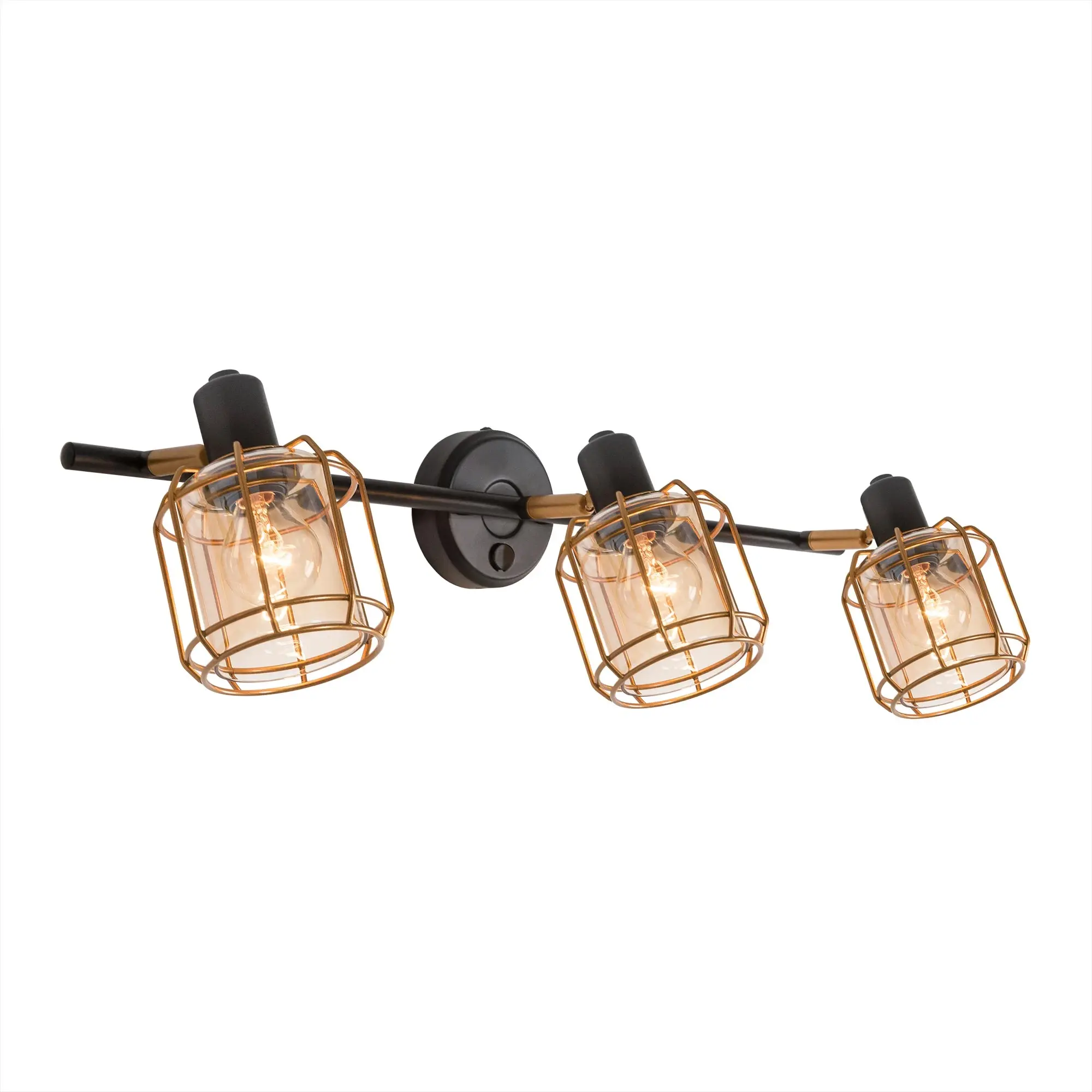 Настенный светильник Citilux Таверна CL542632 с тремя поворотными плафонами выполнен в популярном стиле лофт. Корпус металлический, чёрный с декоративными элементами бронзового цвета. Плафоны из прозрачного стекла светло-янтарного оттенка.