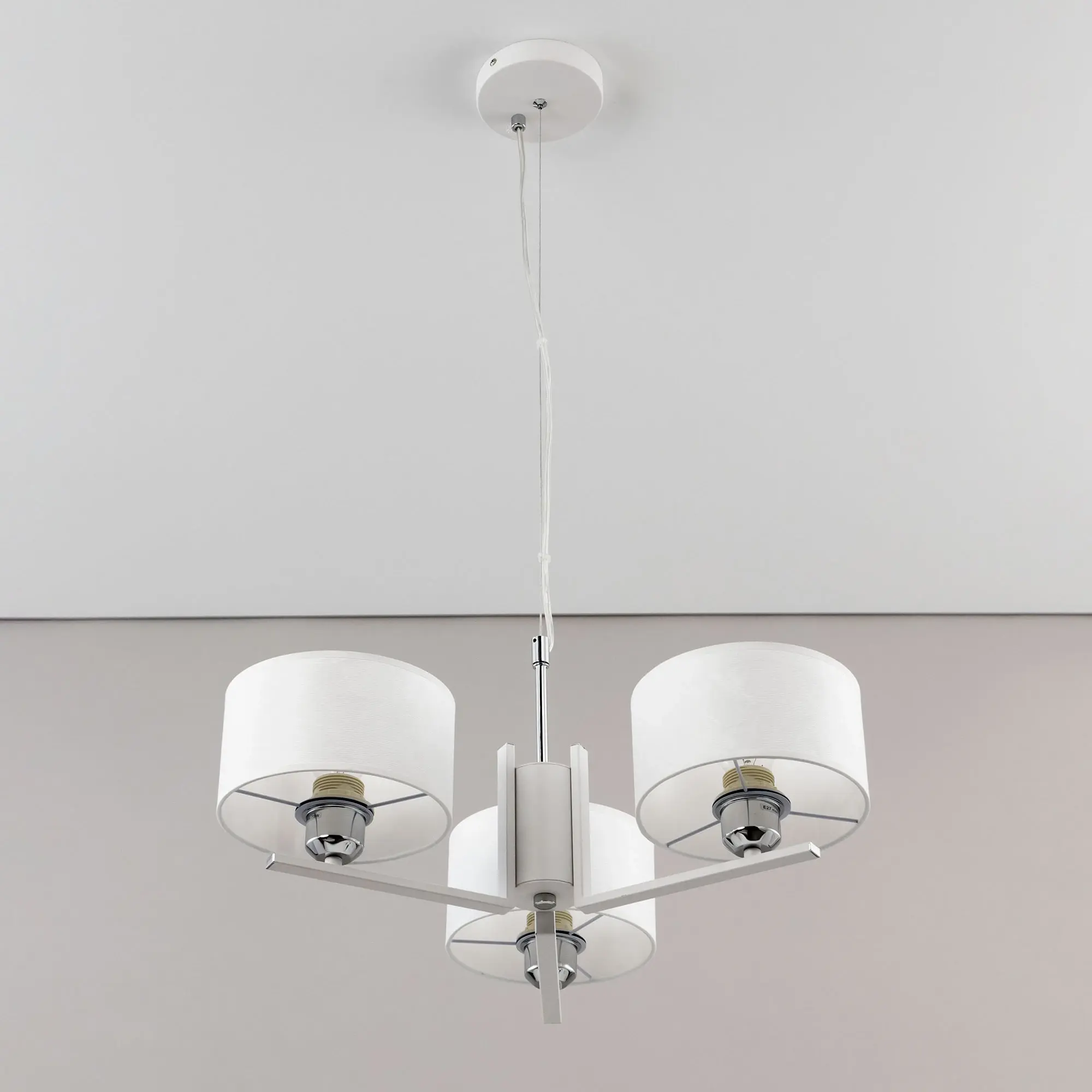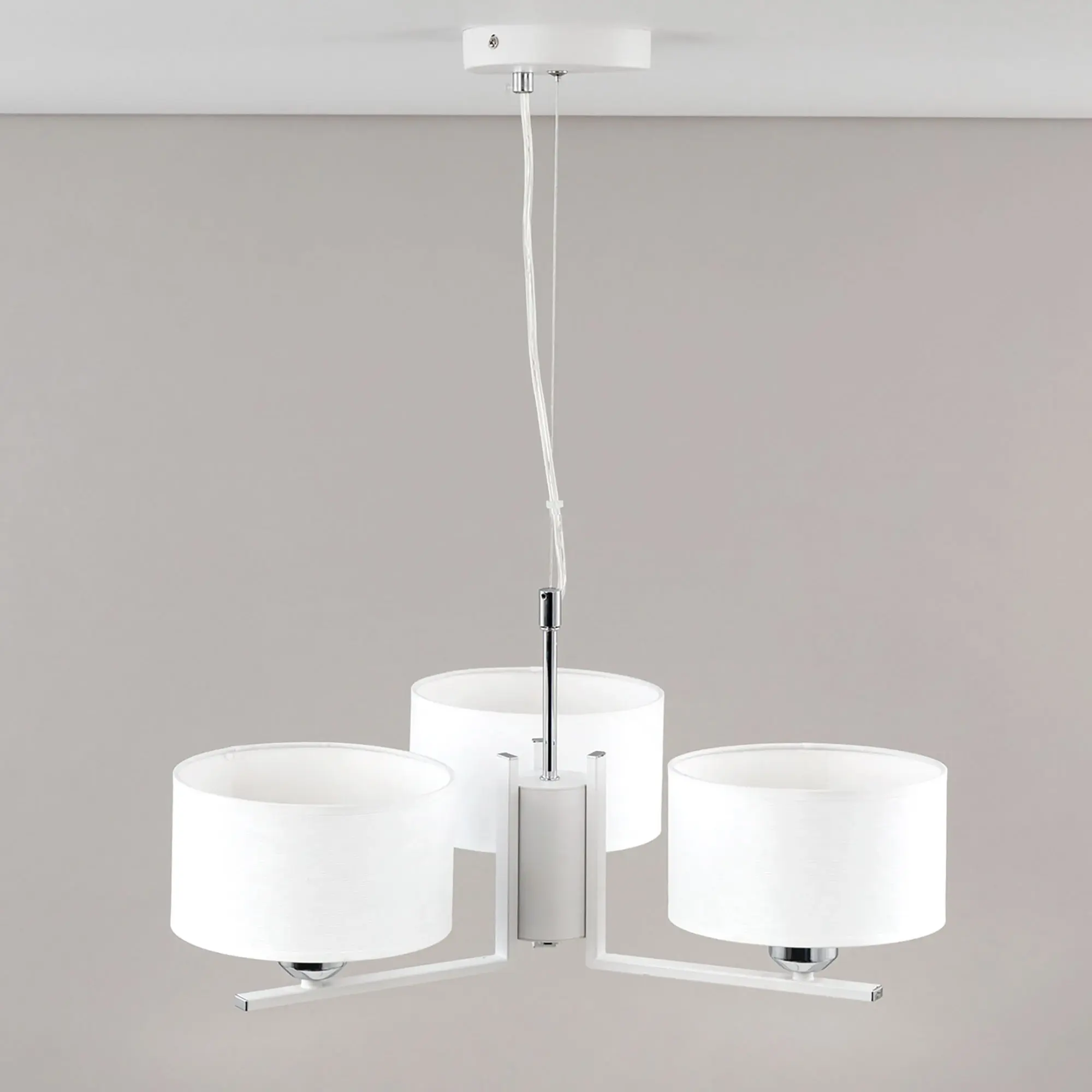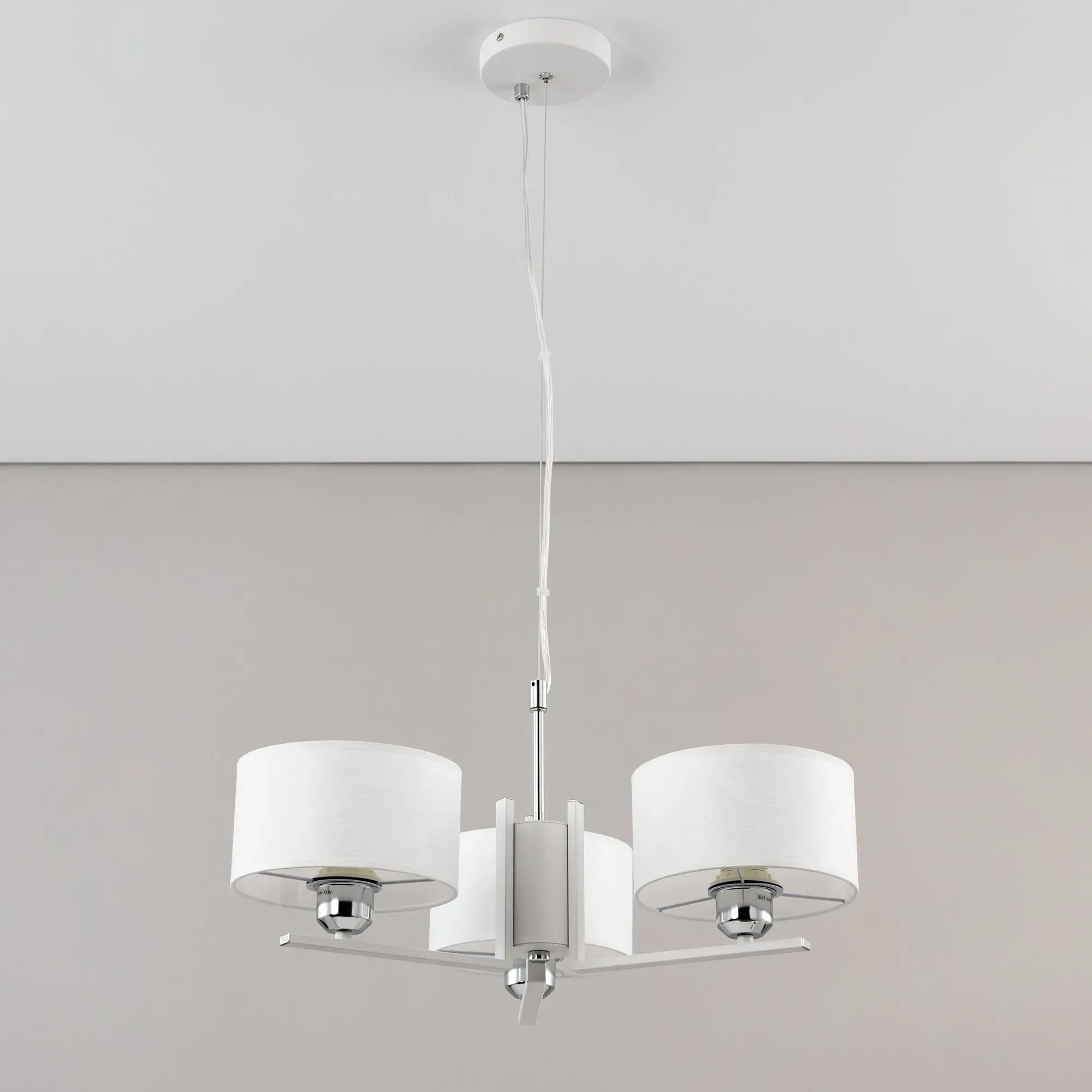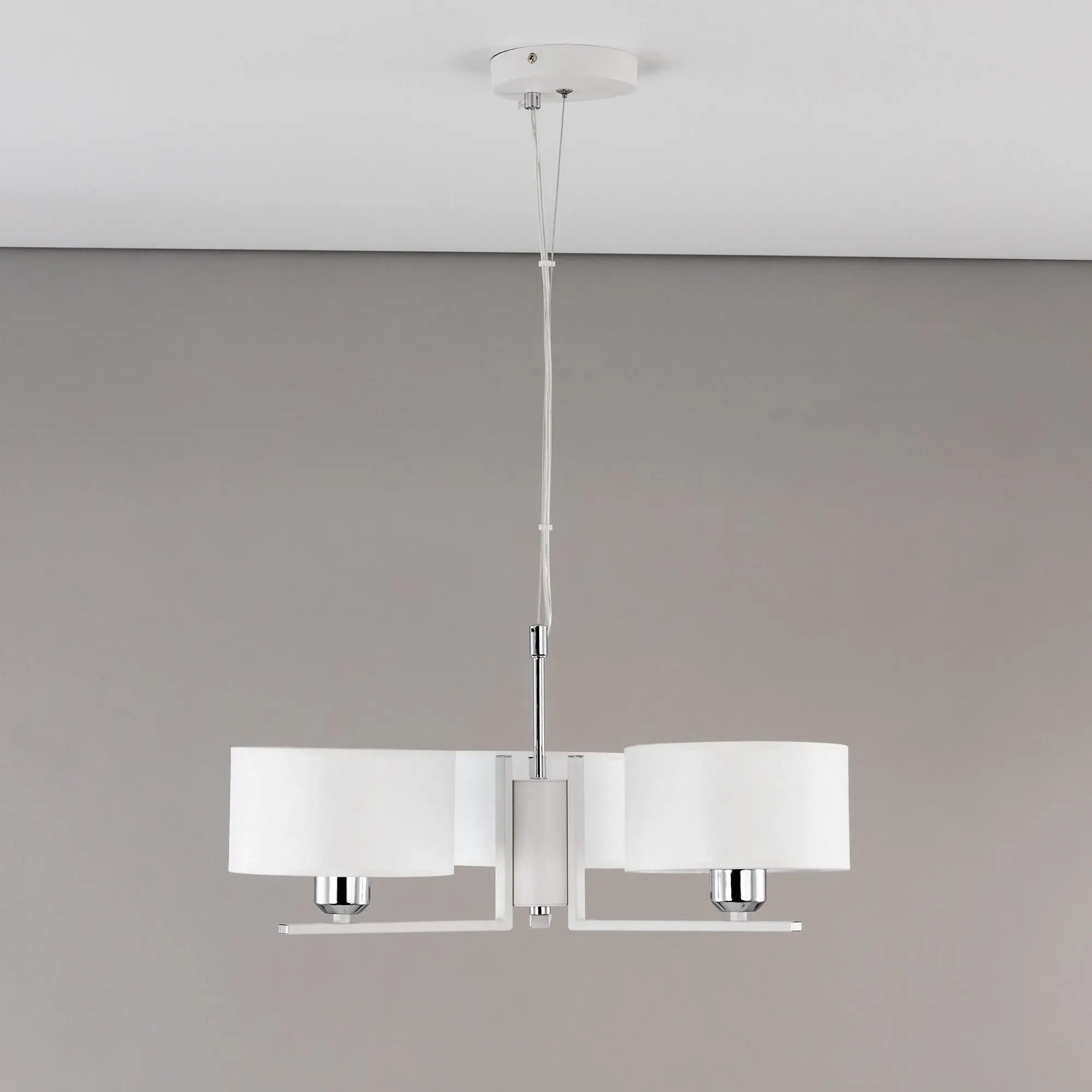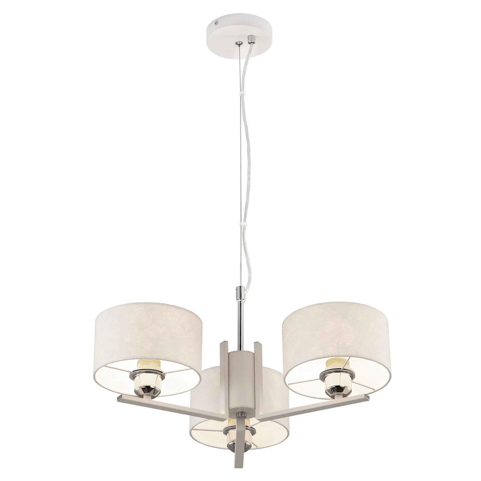 Современная подвесная люстра Citilux Тильда CL469130 для стильных интерьеров, оформленных в светлых тонах. Корпус светильника металлический, цвет белый матовый с декоративными хромированными элементами. Абажуры цилиндрической формы, изготовлены из текстурной ткани на подложке из оптического полимера. В изделии используются лампы с цоколем Е27, максимальной мощностью для ламп накаливания 75Вт. Светодиодные лампы можно применять более яркие. Подходит для всех типов потолков, в том числе натяжных. Тип крепления – планка. Диаметр 55см, высота регулируется в диапазоне 30-120см, осветит около 10м²