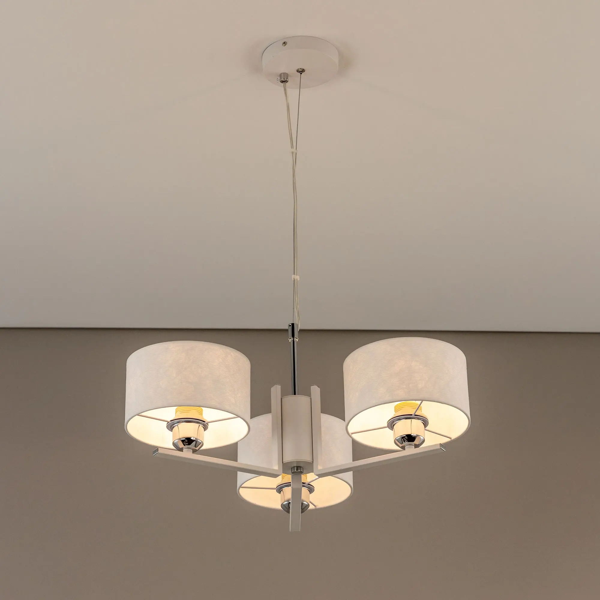 Современная подвесная люстра Citilux Тильда CL469130 для стильных интерьеров, оформленных в светлых тонах. Корпус светильника металлический, цвет белый матовый с декоративными хромированными элементами. Абажуры цилиндрической формы, изготовлены из текстурной ткани на подложке из оптического полимера. В изделии используются лампы с цоколем Е27, максимальной мощностью для ламп накаливания 75Вт. Светодиодные лампы можно применять более яркие. Подходит для всех типов потолков, в том числе натяжных. Тип крепления – планка. Диаметр 55см, высота регулируется в диапазоне 30-120см, осветит около 10м².,