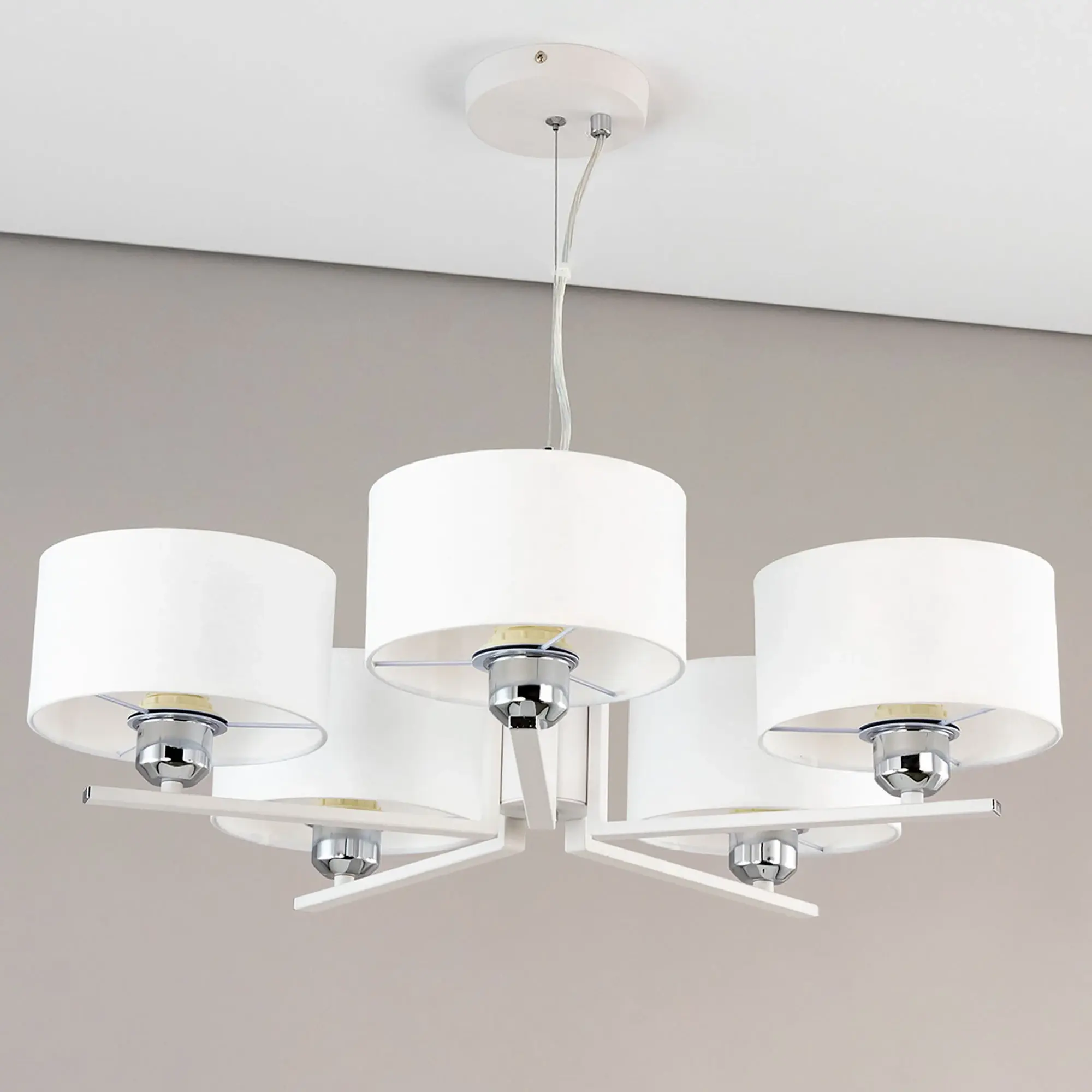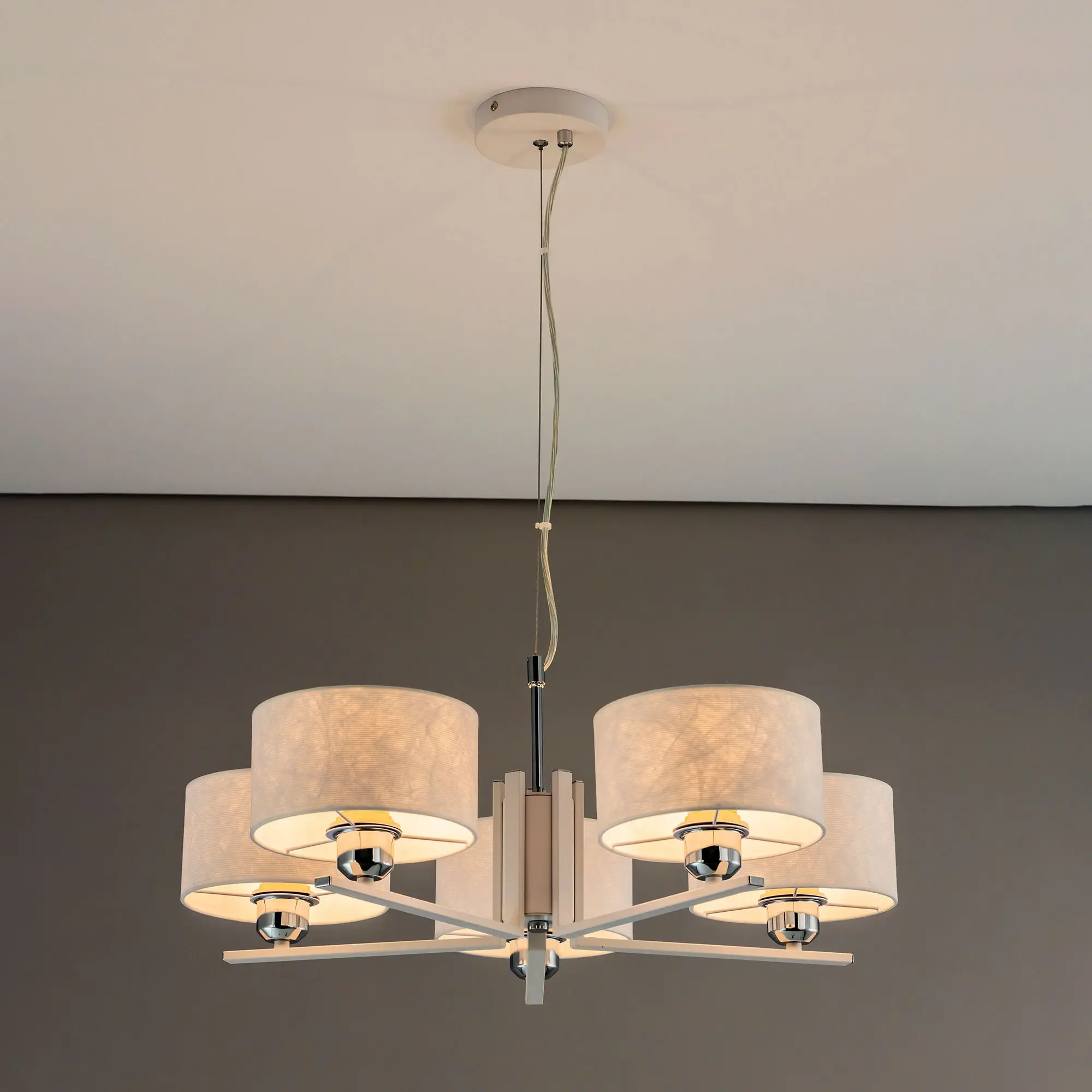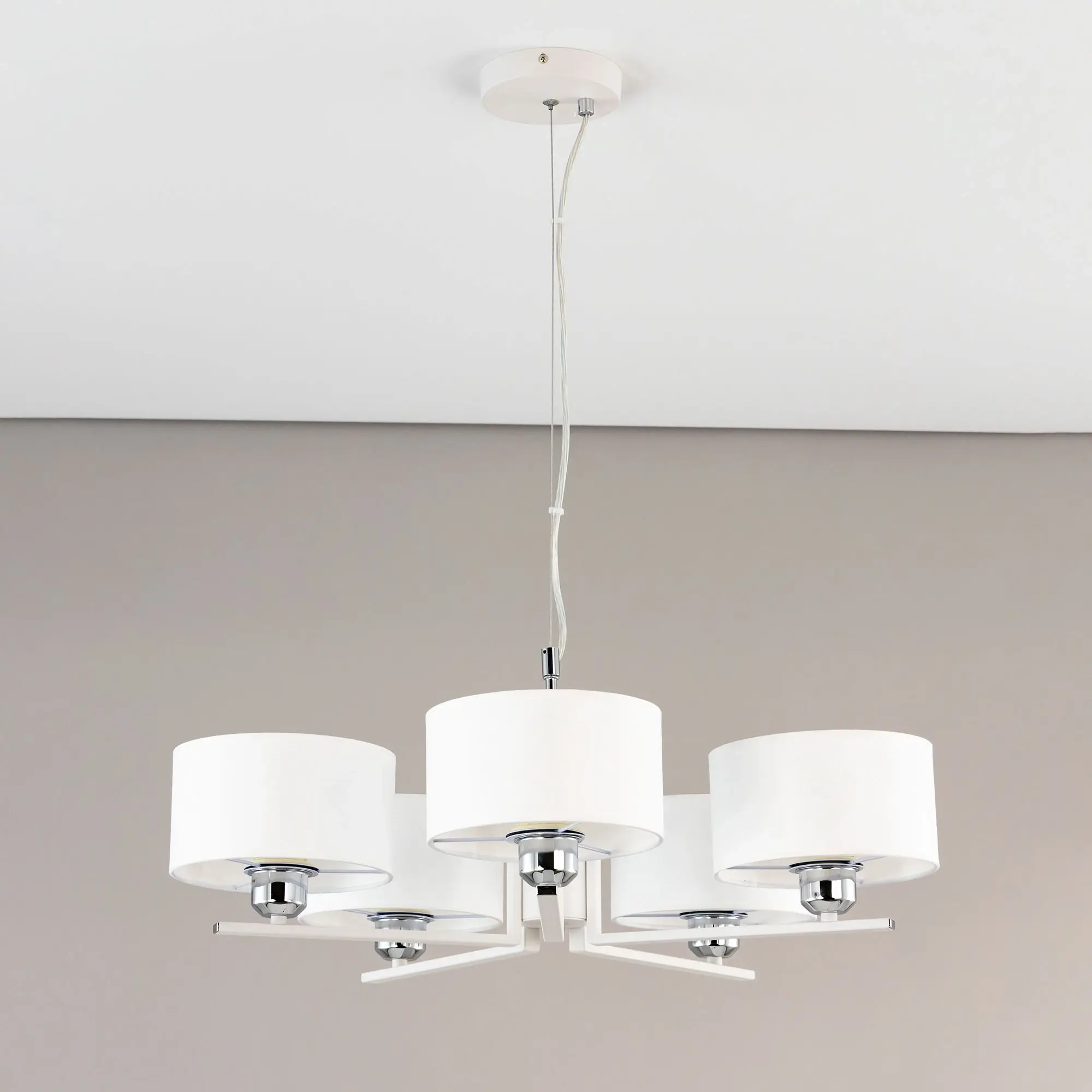 Современная подвесная люстра Citilux Тильда CL469150 для стильных интерьеров, оформленных в светлых тонах. Корпус светильника металлический, цвет белый матовый с декоративными хромированными элементами. Абажуры цилиндрической формы, изготовлены из текстурной ткани на подложке из оптического полимера. В изделии используются лампы с цоколем Е27, максимальной мощностью для ламп накаливания 75Вт. Светодиодные лампы можно применять более яркие. Подходит для всех типов потолков, в том числе натяжных. Тип крепления – планка. Диаметр 64см, высота регулируется в диапазоне 30-120см, осветит около 17м².,