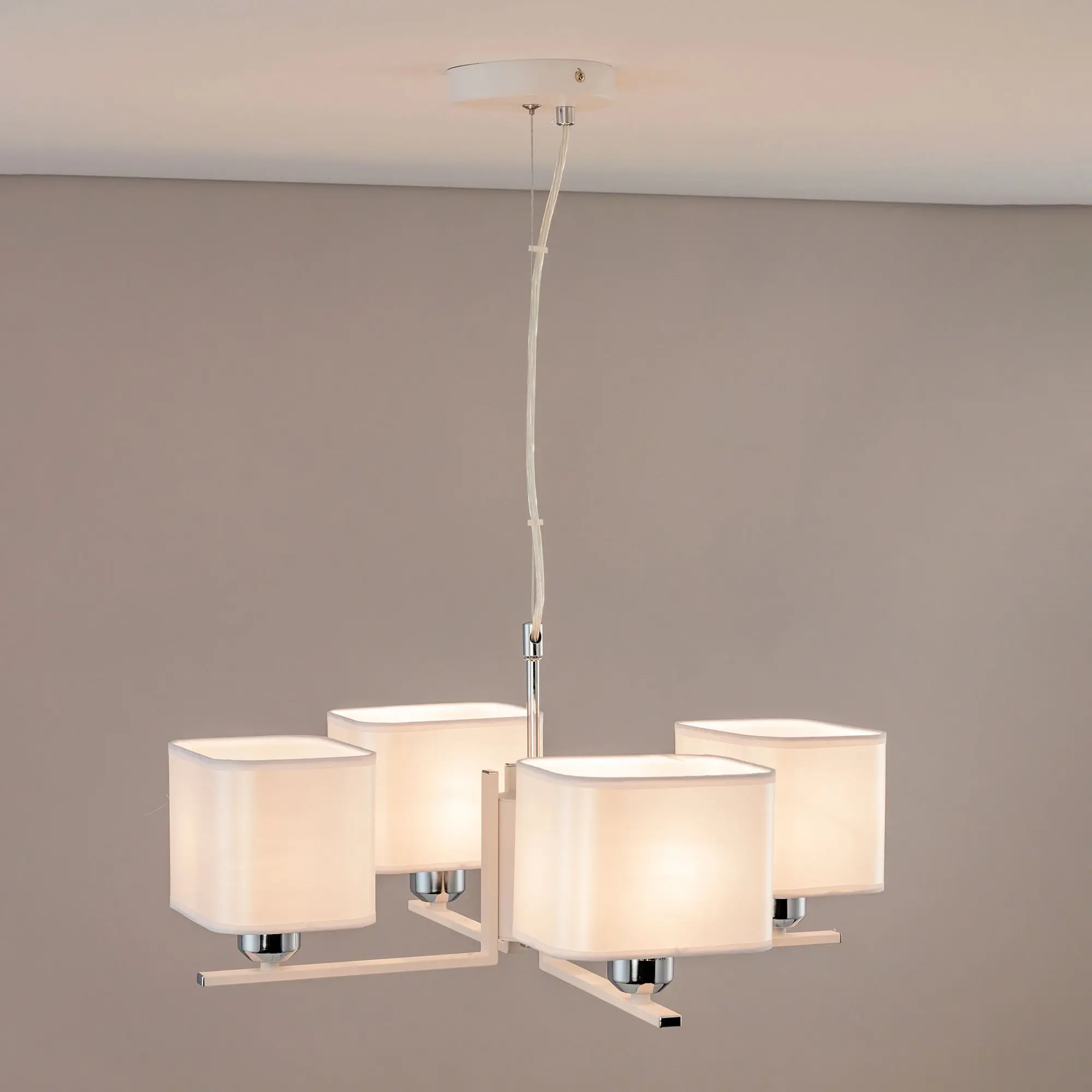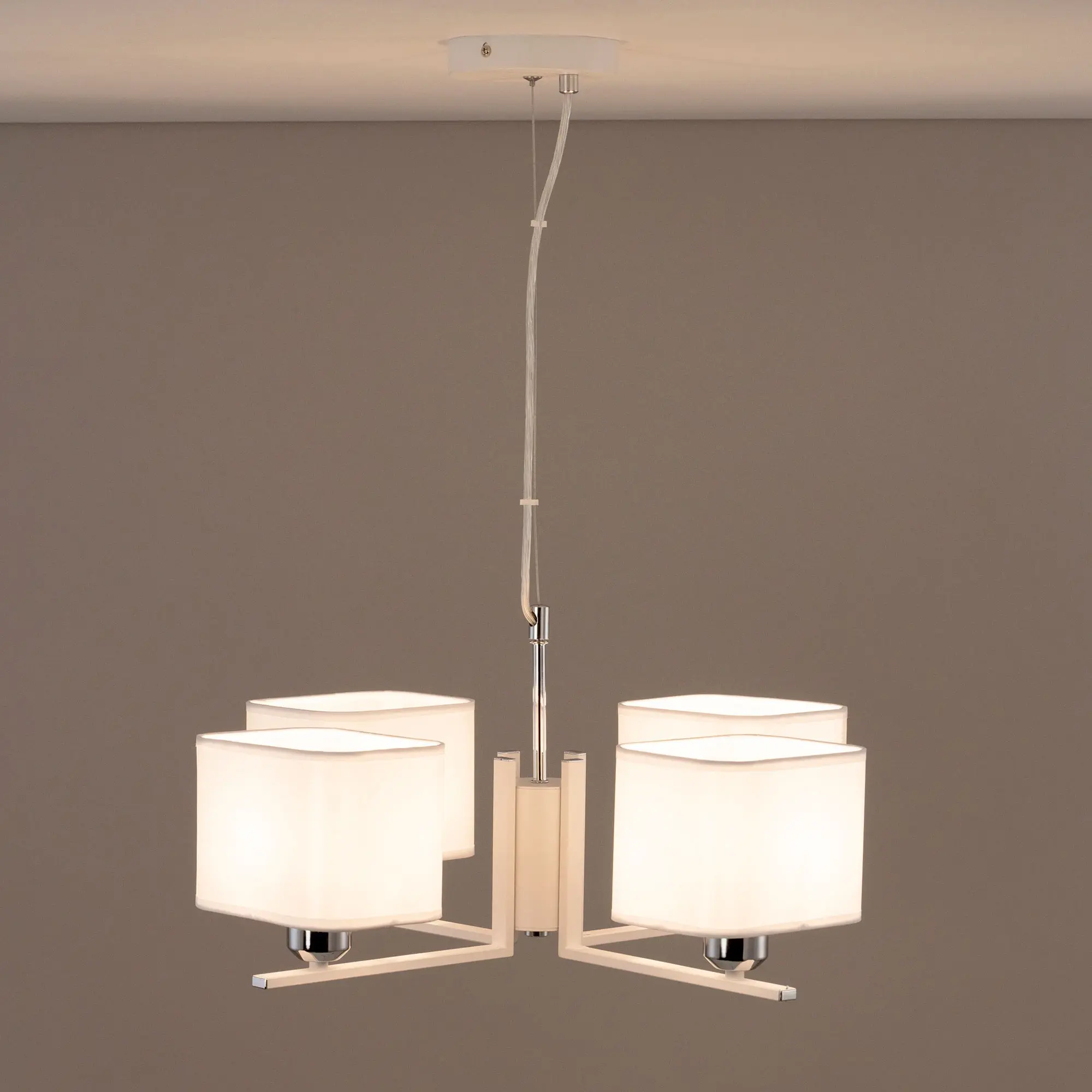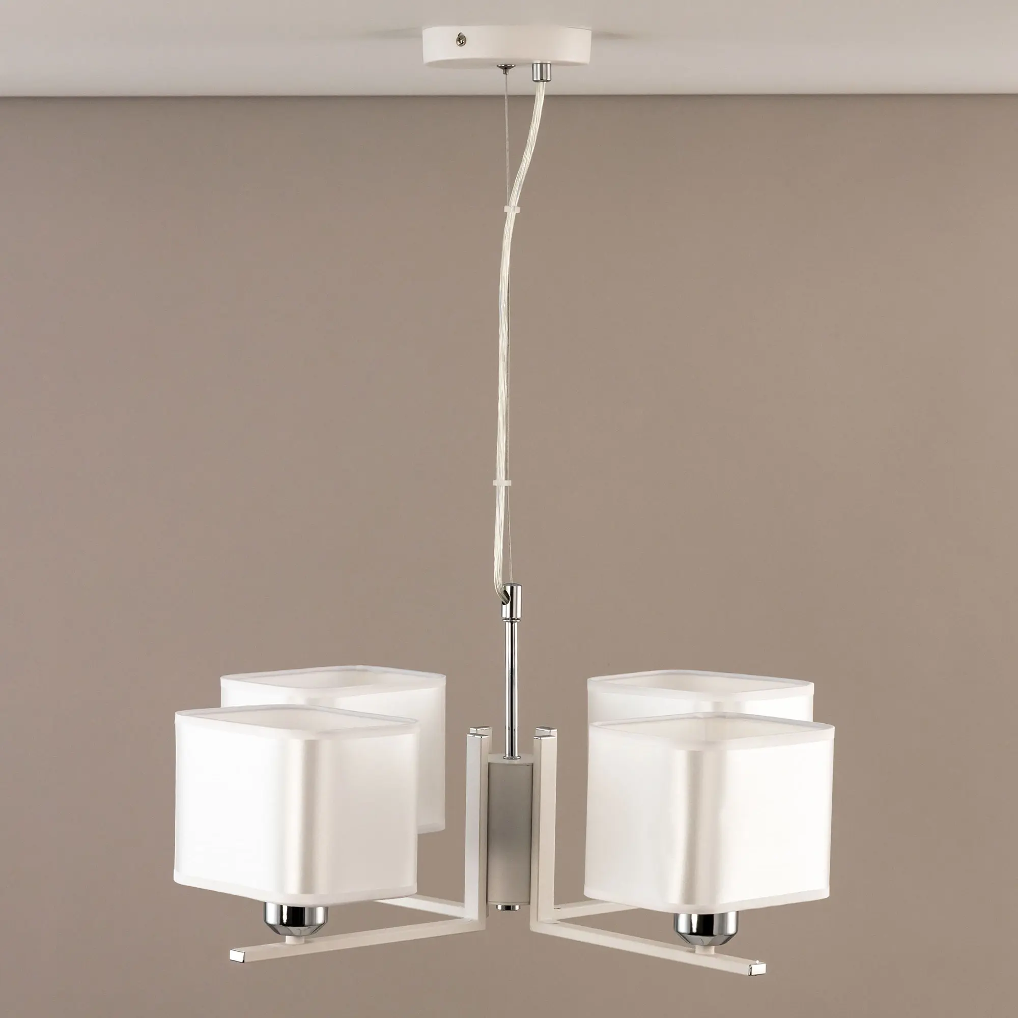 Современная подвесная люстра Citilux Тильда CL469245 для стильных интерьеров, оформленных в светлых тонах. Корпус светильника металлический, цвет белый матовый с декоративными хромированными элементами. Абажуры квадратной формы, изготовлены из белой атласной ткани на подложке из оптического полимера. В изделии используются лампы с цоколем Е27, максимальной мощностью для ламп накаливания 75Вт. Светодиодные лампы можно применять более яркие. Подходит для всех типов потолков, в том числе натяжных. Тип крепления – планка. Размеры светильника: длина 52,5см, ширина 52,5см, высота регулируется в диапазоне 30-120см, осветит около 13м².,