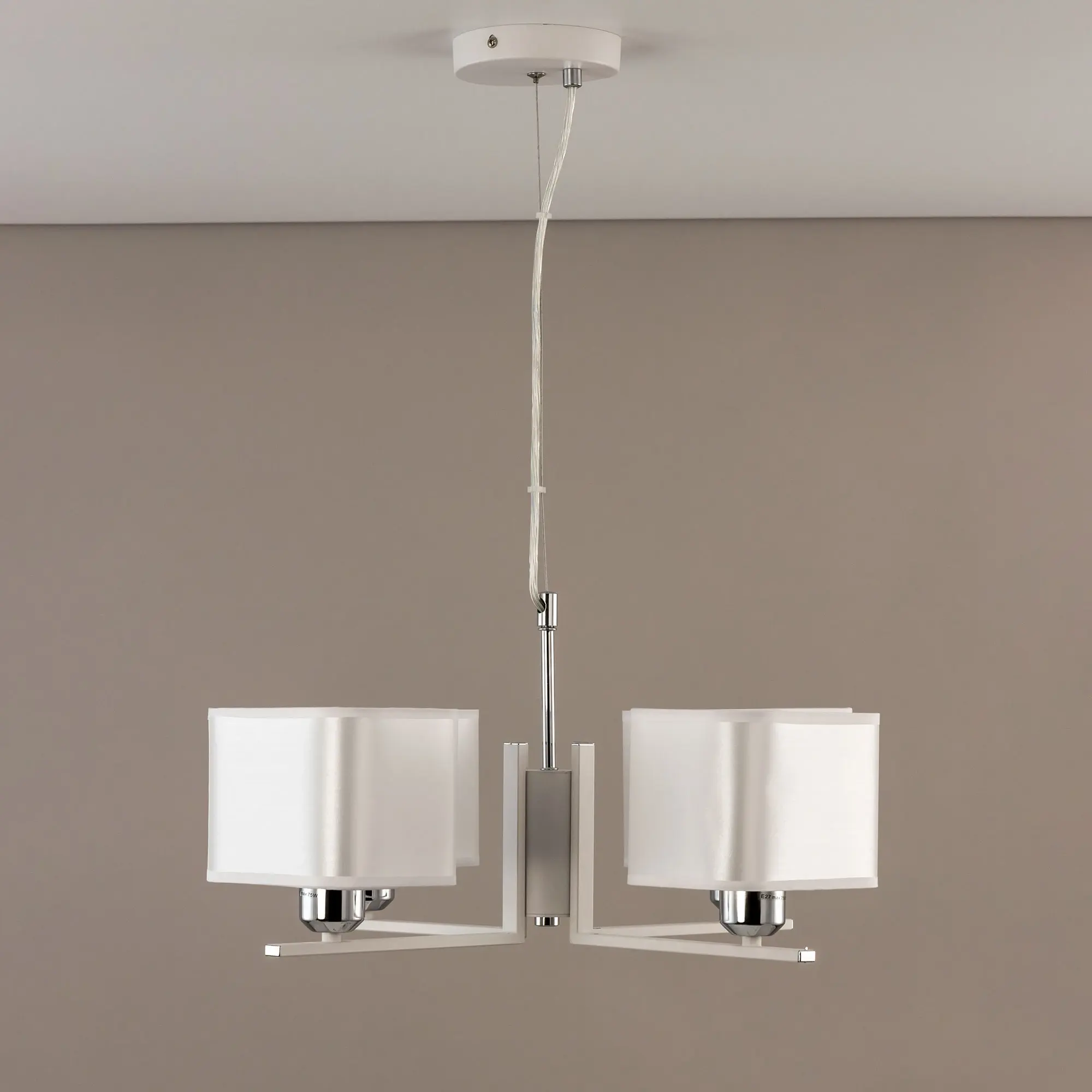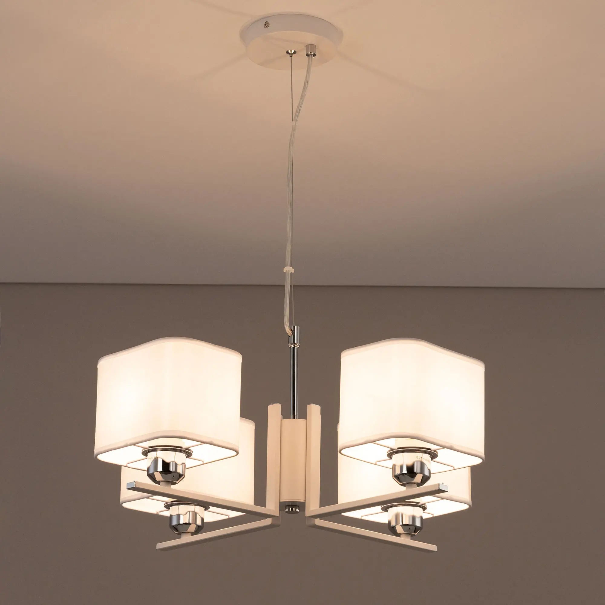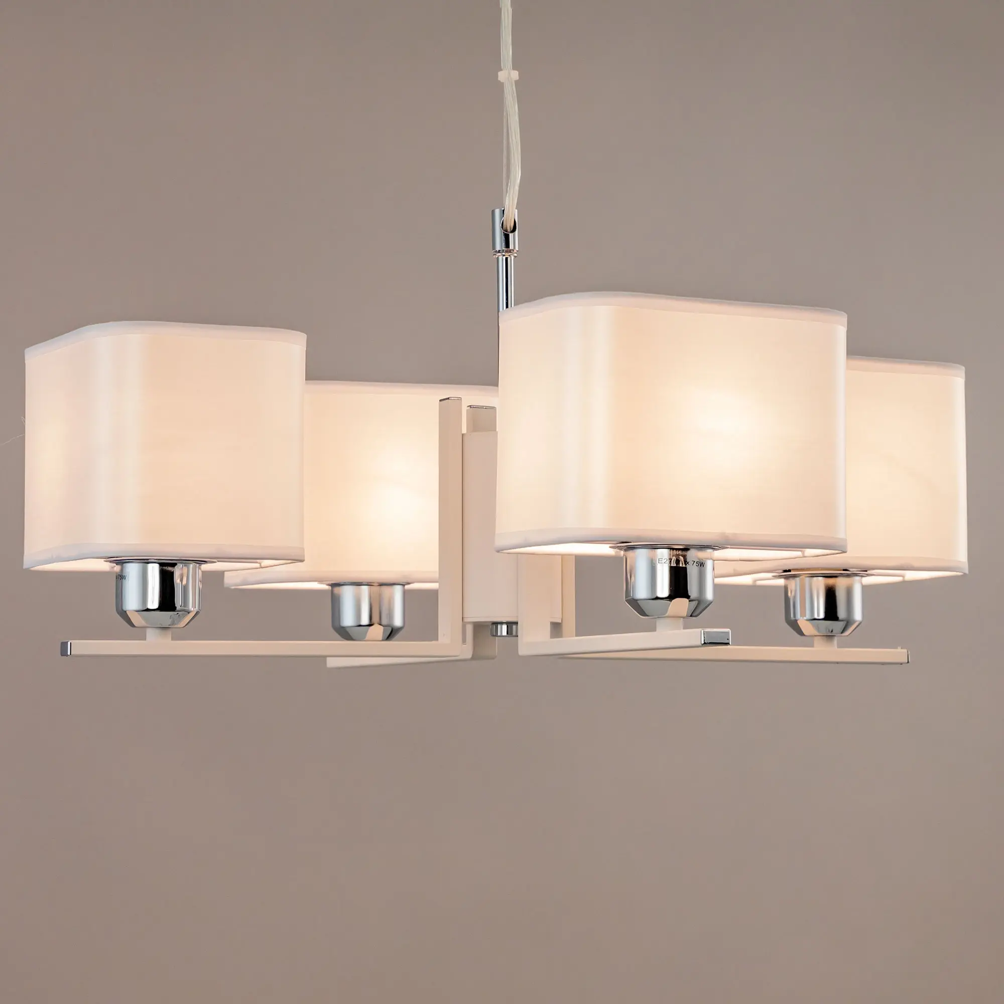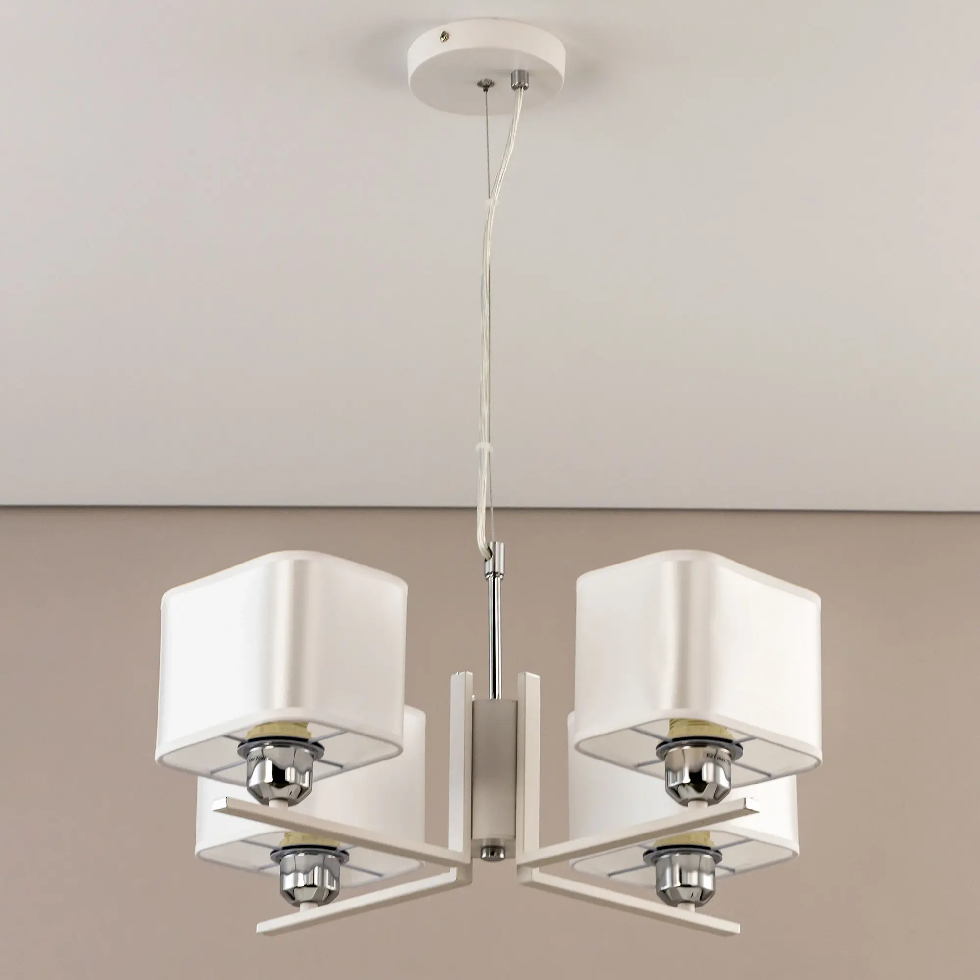 Современная подвесная люстра Citilux Тильда CL469245 для стильных интерьеров, оформленных в светлых тонах. Корпус светильника металлический, цвет белый матовый с декоративными хромированными элементами. Абажуры квадратной формы, изготовлены из белой атласной ткани на подложке из оптического полимера. В изделии используются лампы с цоколем Е27, максимальной мощностью для ламп накаливания 75Вт. Светодиодные лампы можно применять более яркие. Подходит для всех типов потолков, в том числе натяжных. Тип крепления – планка. Размеры светильника: длина 52,5см, ширина 52,5см, высота регулируется в диапазоне 30-120см, осветит около 13м².,