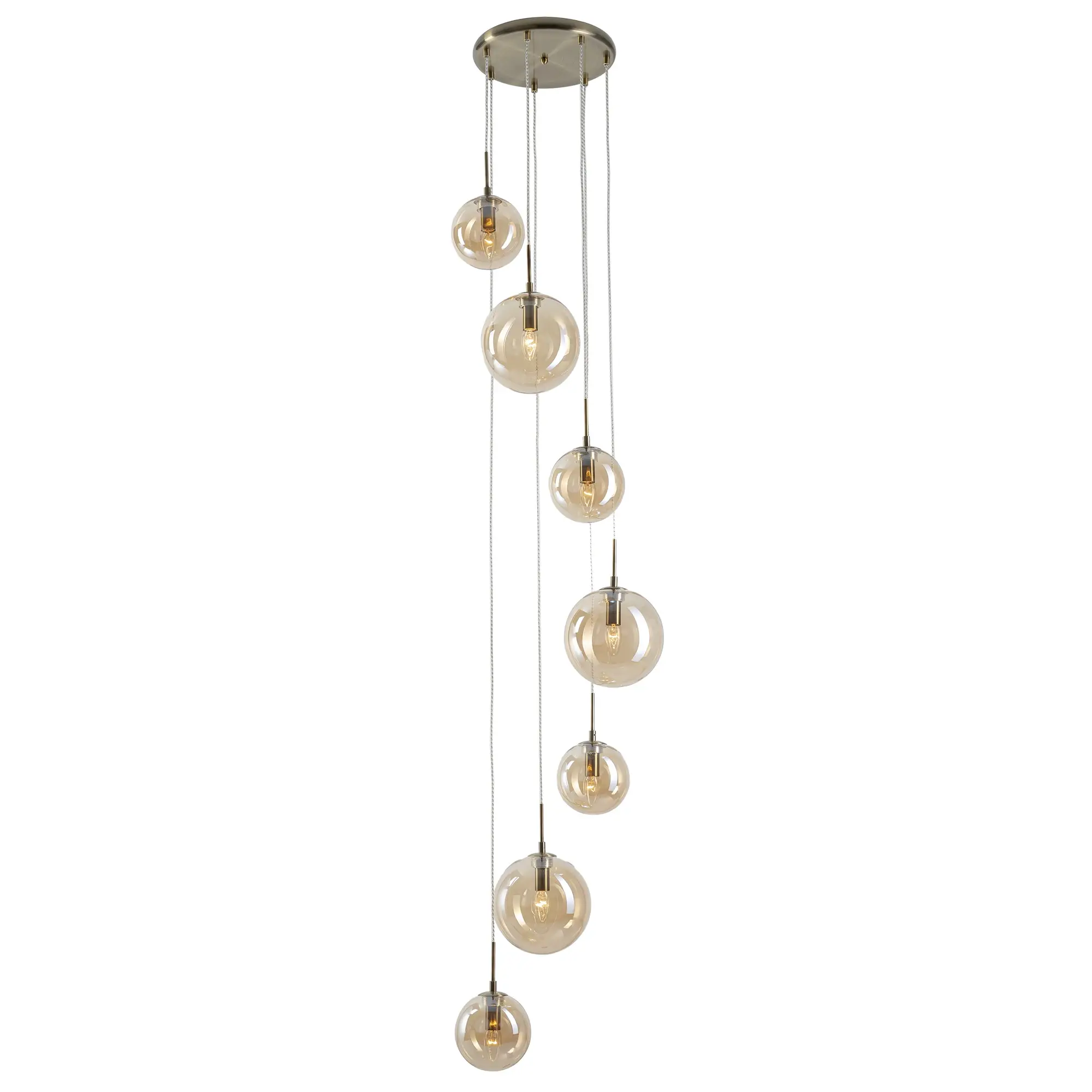 Люстра Citilux Томми CL102073 с семью подвесными плафонами, выполнена в современном стиле. Основание светильника металлическое, круглой формы, диаметр 30см, цвет бронза. Подвесная спираль каскада сформирована плафонами двух размеров, диаметром 15см и 20см. Плафоны в форме шара, из прозрачного стекла, светло-янтарного оттенка. Диаметр люстры 42см, высота легко регулируется при установке, в диапазоне от 1,4м до 2,15м. В изделии используются лампы с цоколем Е14, форма колбы свеча, максимальной мощностью для ламп накаливания 40Вт (лампы в комплект не входят, приобретаются отдельно). Каскадная люстра Citilux Томми CL102073 отличный вариант освещения модных пространств со вторым светом, лестниц в уютных загородных домах и современных квартир с высокими потолками.,