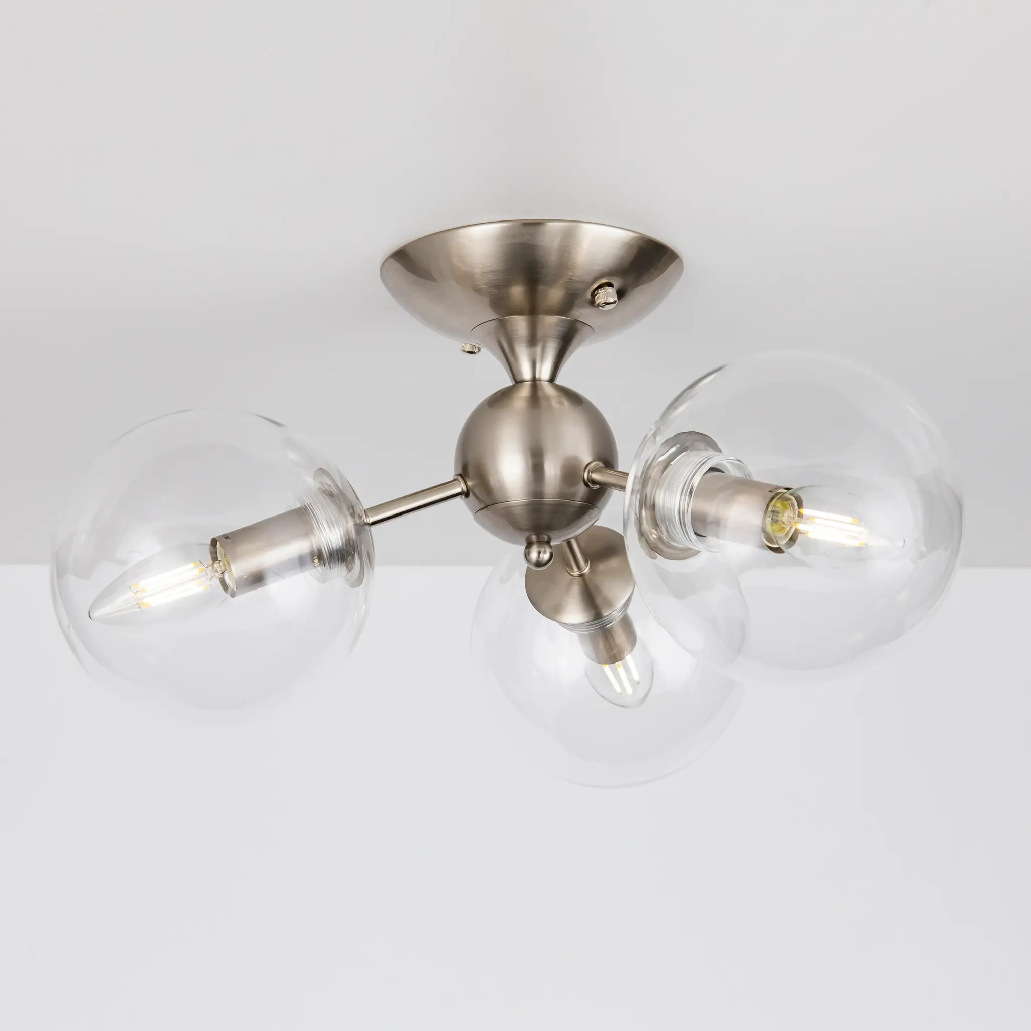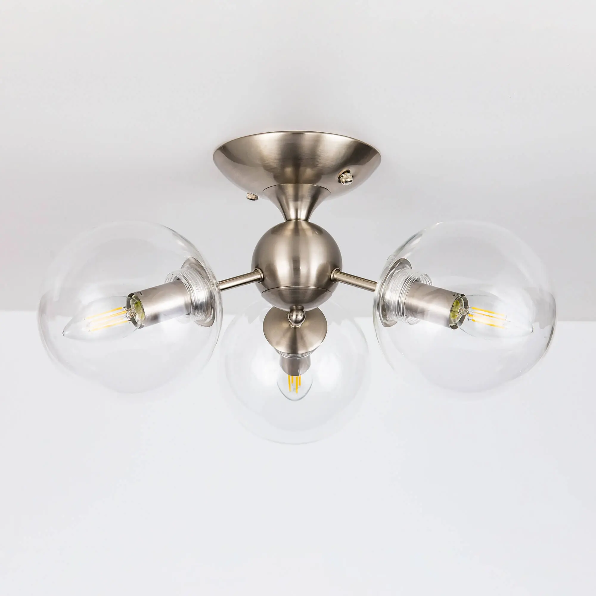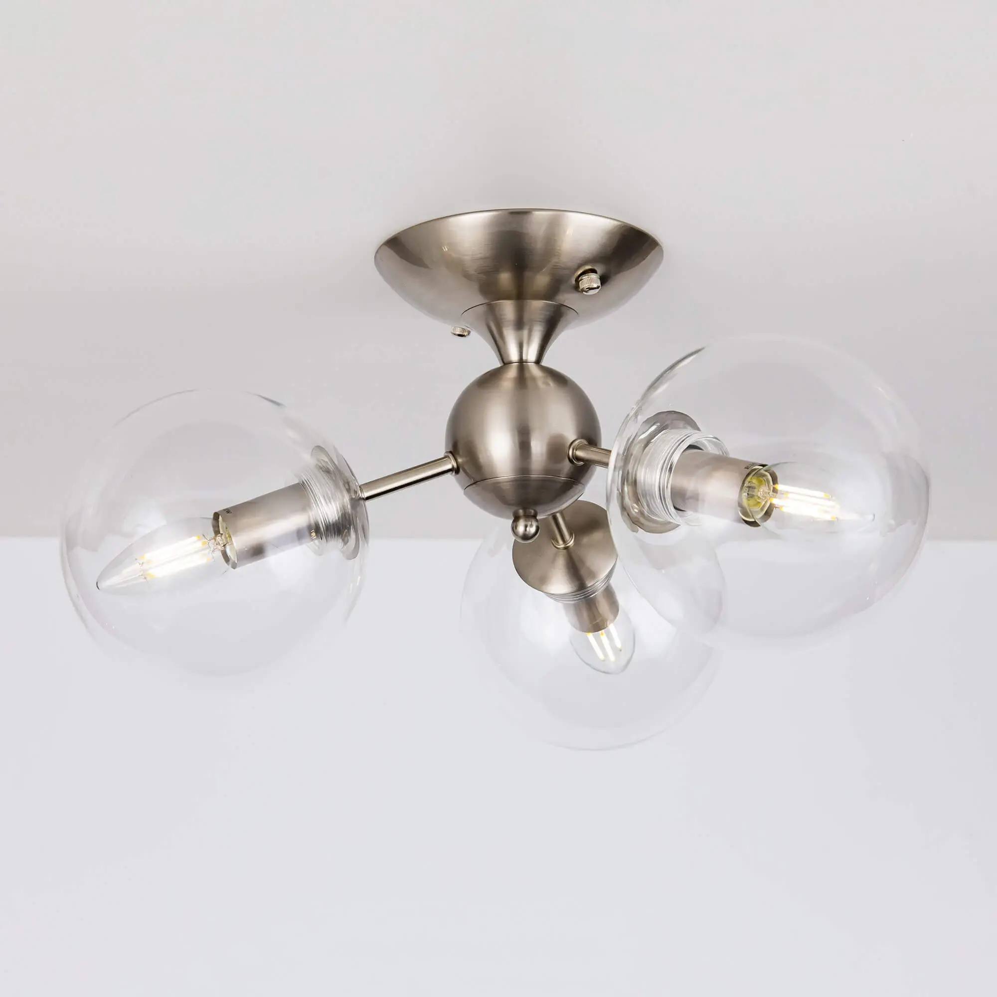 Потолочная люстра CL102131 с тремя плафонами. Корпус люстры изготовлен из металла, цвет матовый хром. Плафоны стеклянные в форме шара, прозрачные. В люстре используются 3 лампы с цоколем Е14 мощностью 40 Вт. Суммарная мощность люстры 120 Вт при использовании ламп накаливания. Площадь освещения около 7 кв. метров. Люстра крепиться к потолку на планку, крепеж в комплекте.,