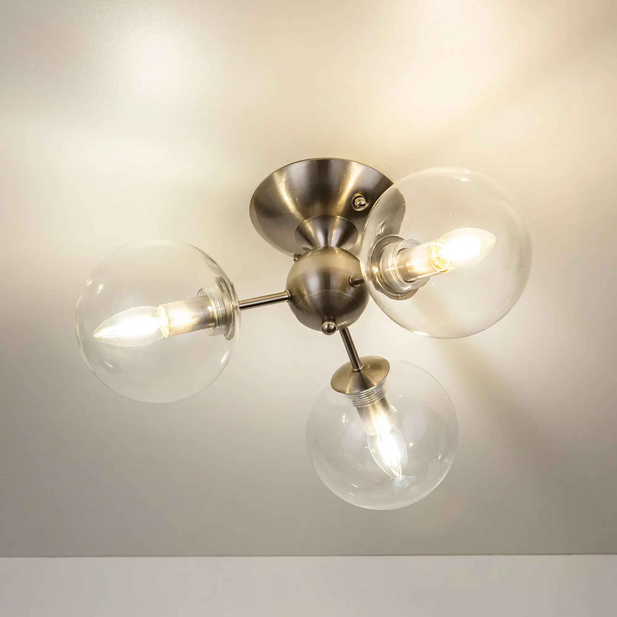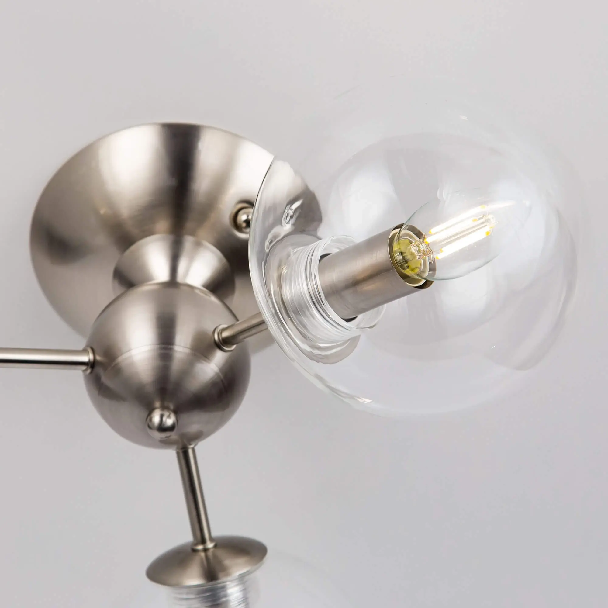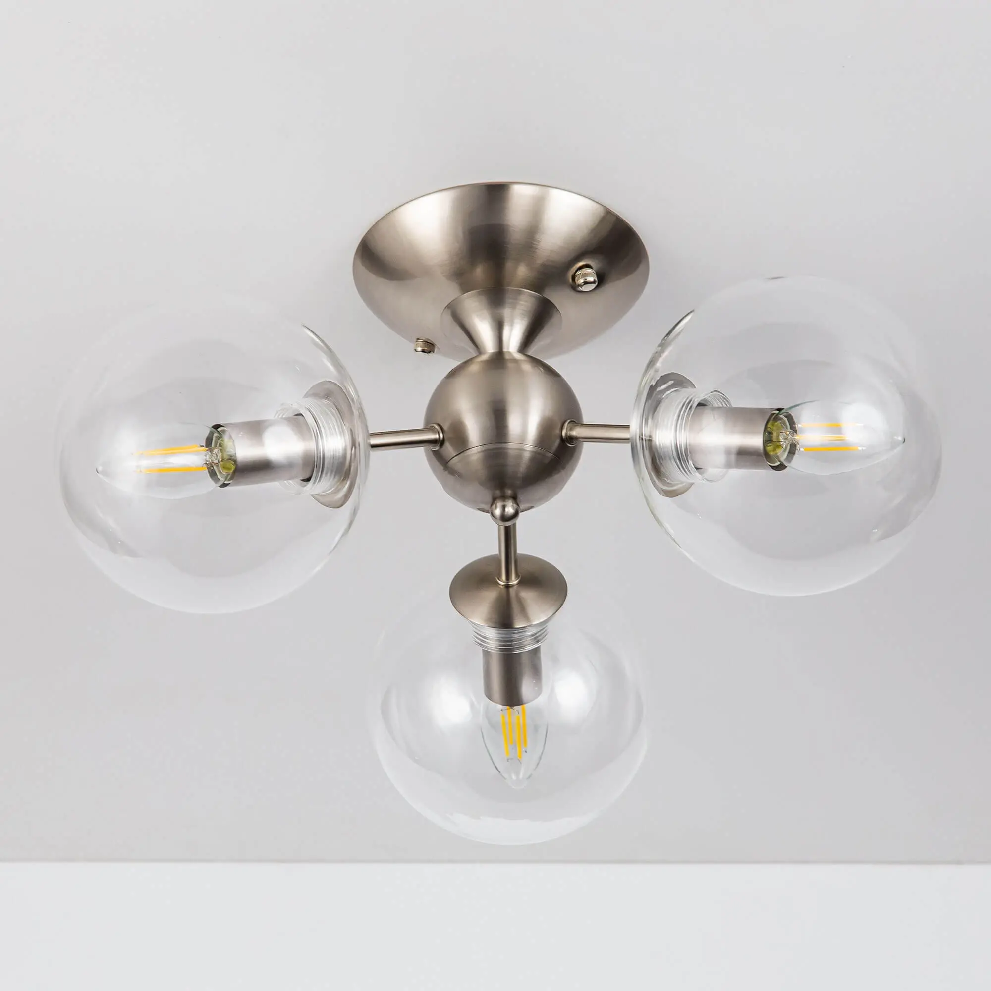 Потолочная люстра CL102131 с тремя плафонами. Корпус люстры изготовлен из металла, цвет матовый хром. Плафоны стеклянные в форме шара, прозрачные. В люстре используются 3 лампы с цоколем Е14 мощностью 40 Вт. Суммарная мощность люстры 120 Вт при использовании ламп накаливания. Площадь освещения около 7 кв. метров. Люстра крепиться к потолку на планку, крепеж в комплекте.,