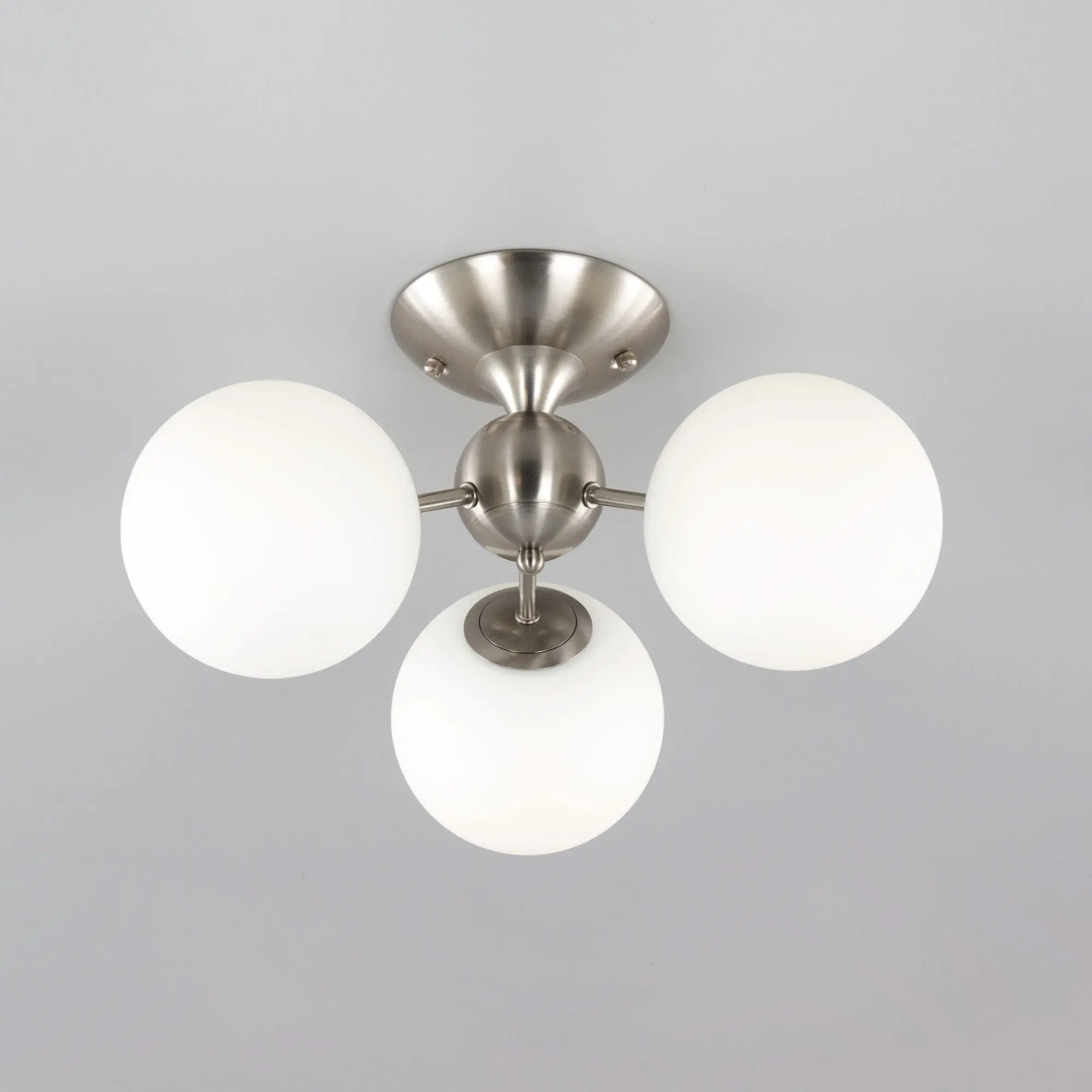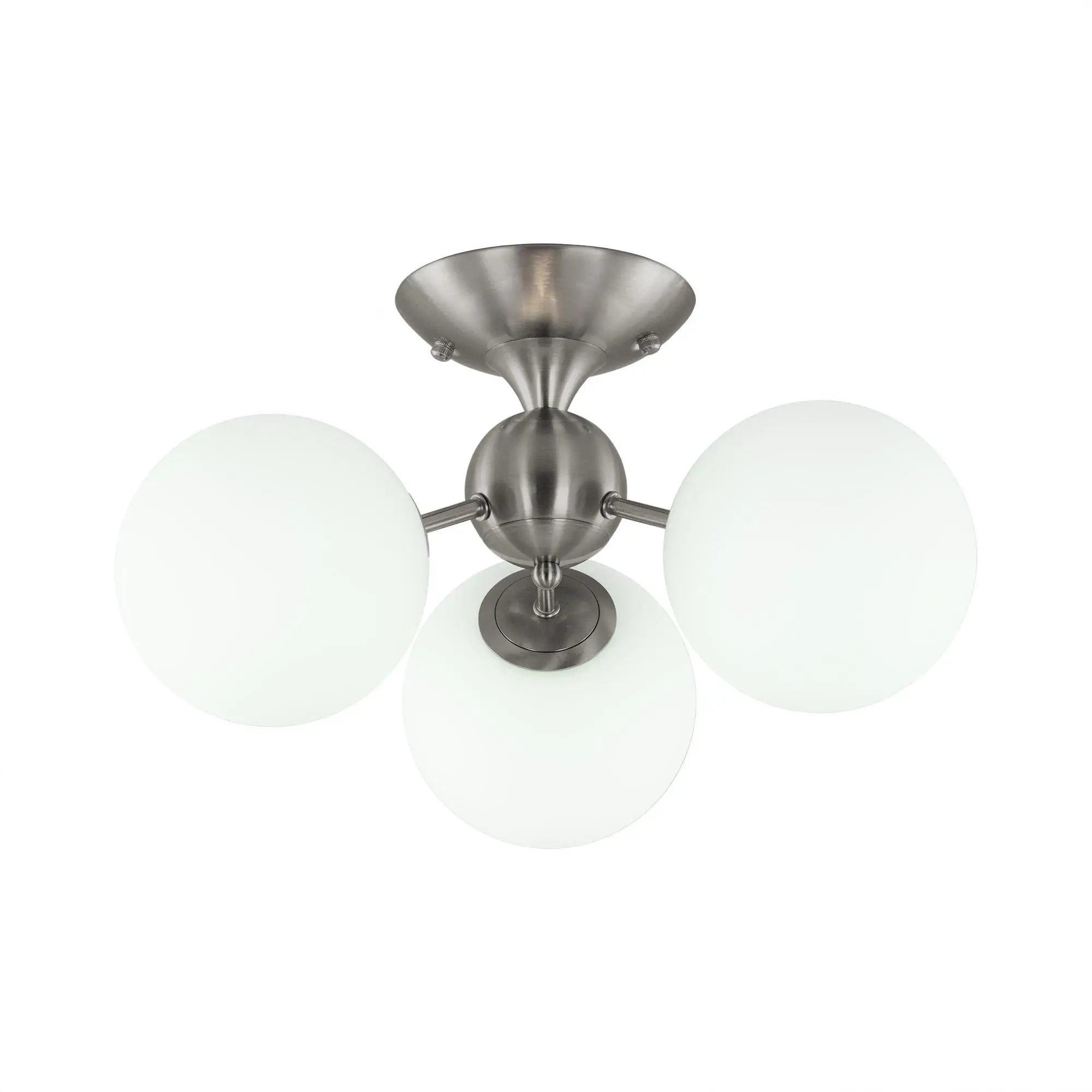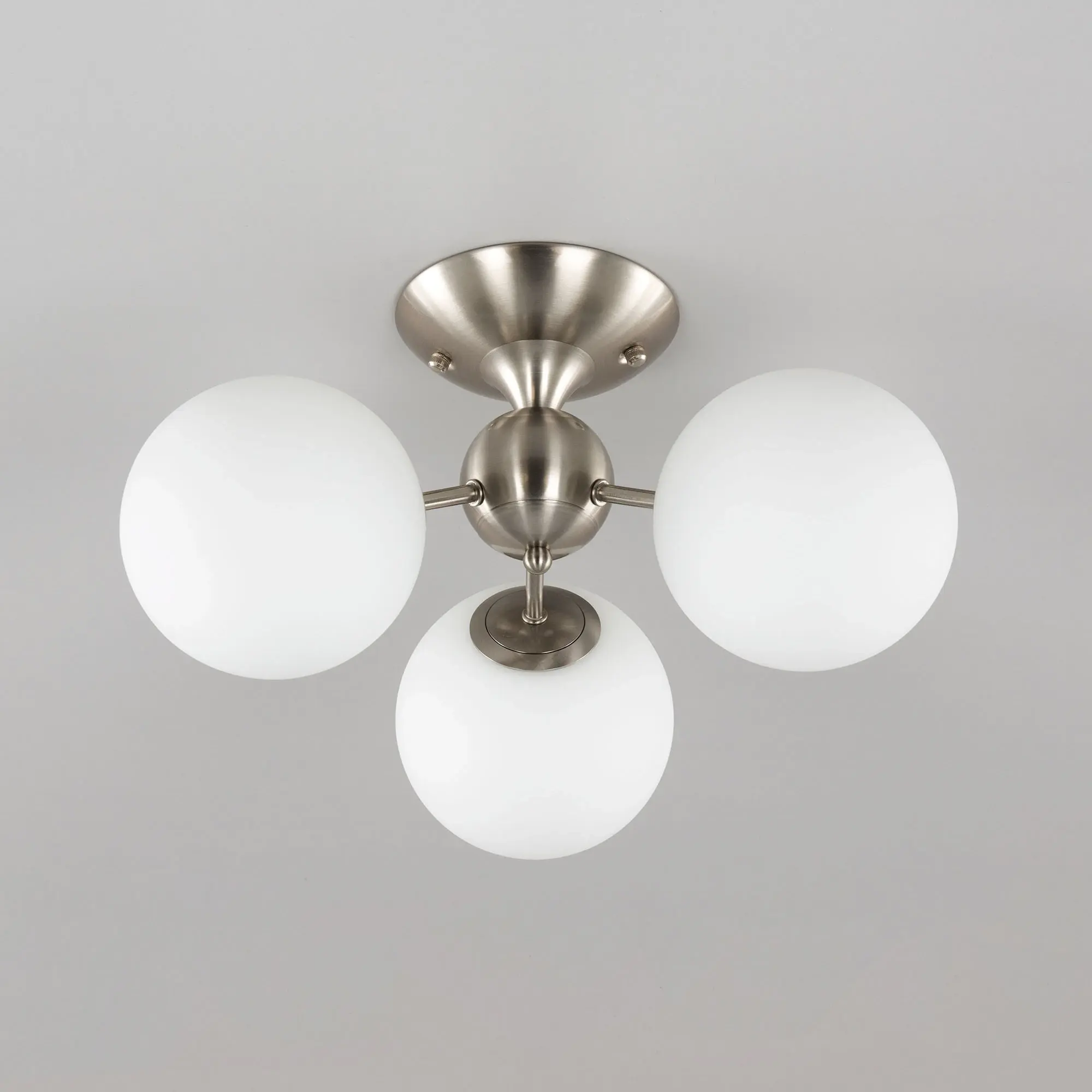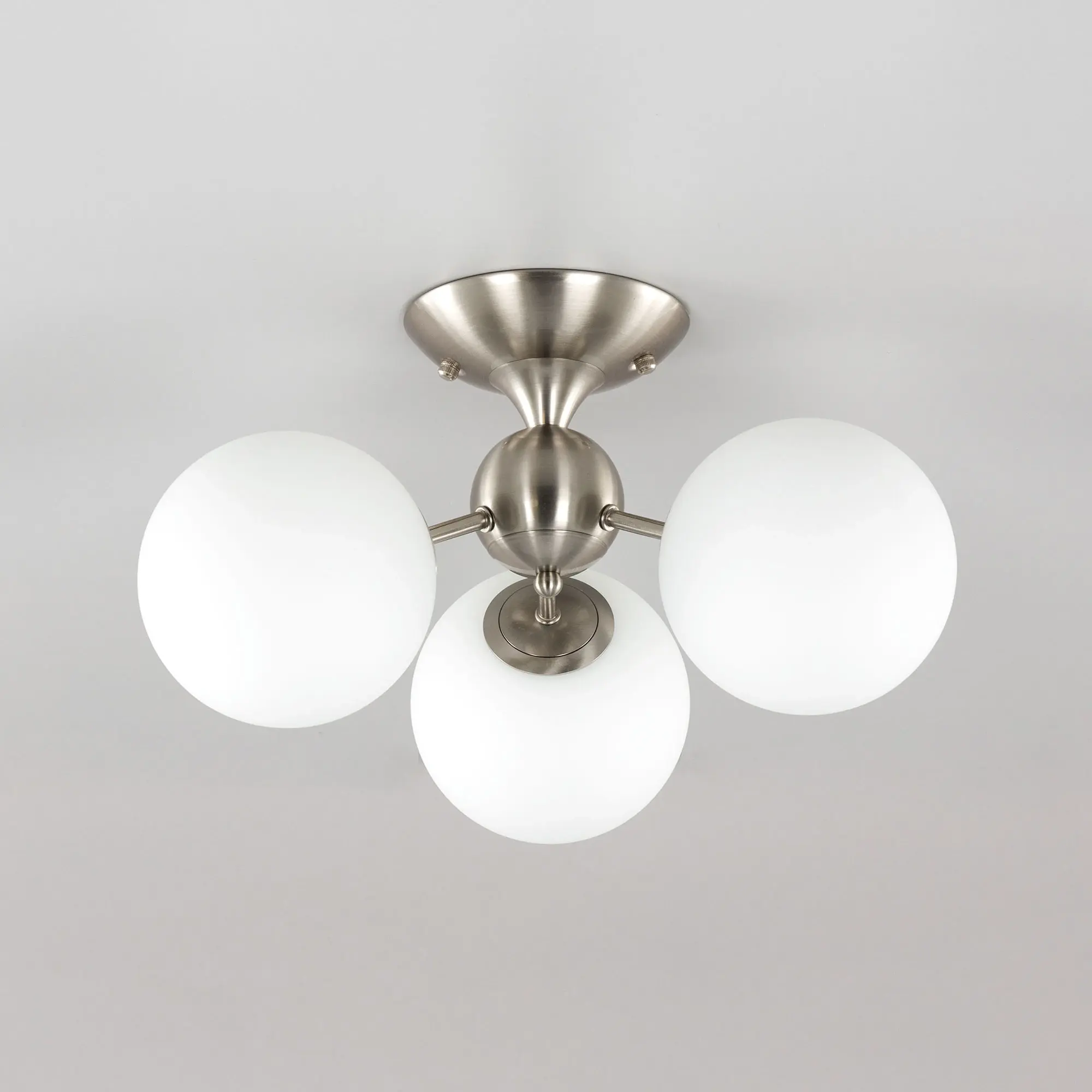 Потолочная люстра Citilux Томми CL102134 для интерьеров, оформленных в современном стиле. Корпус металлический, цвет матовый хром. Плафоны стеклянные, в форме шара, цвет белый матовый. В изделии 3 лампы с цоколем Е14, максимальной мощностью для ламп накаливания 40Вт. Светодиодные лампы можно использовать более яркие. Площадь освещения около 7м². Модель подходит для всех типов потолков, в том числе натяжных. Тип крепления-планка.