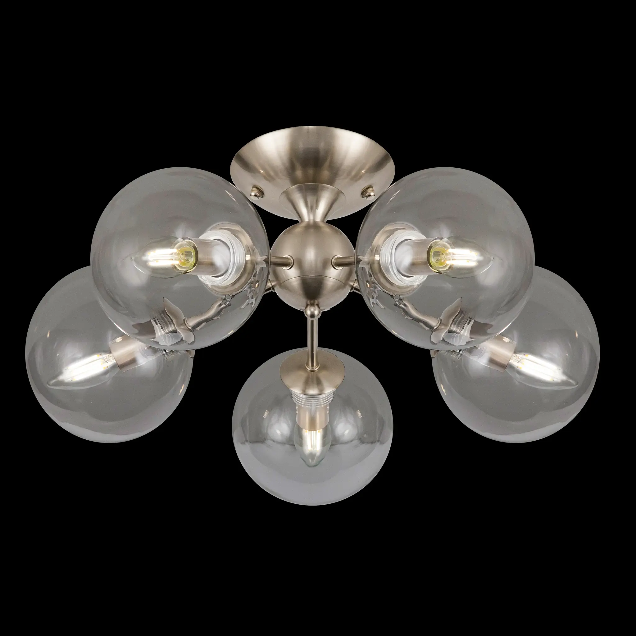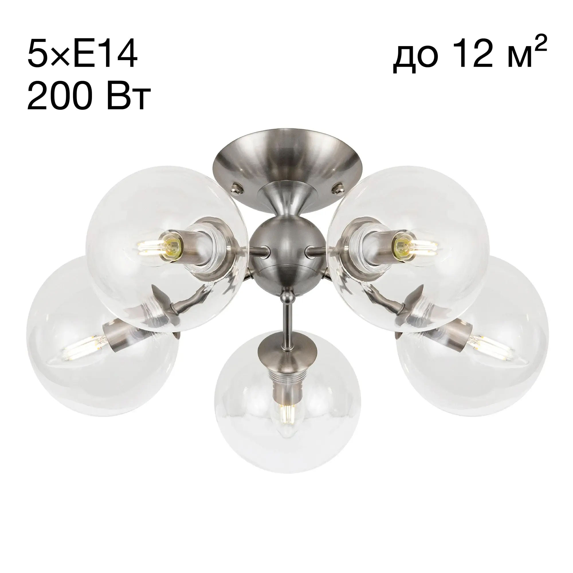 Потолочная люстра CL102151 с пятью плафонами. Корпус люстры изготовлен из металла, цвет матовый хром. Плафоны стеклянные в форме шара, прозрачные. В люстре используются 5 ламп с цоколем Е14 мощностью 40 Вт. Суммарная мощность люстры 200 Вт при использовании ламп накаливания. Площадь освещения около 12 кв. метров. Люстра крепиться к потолку на планку, крепеж в комплекте.,