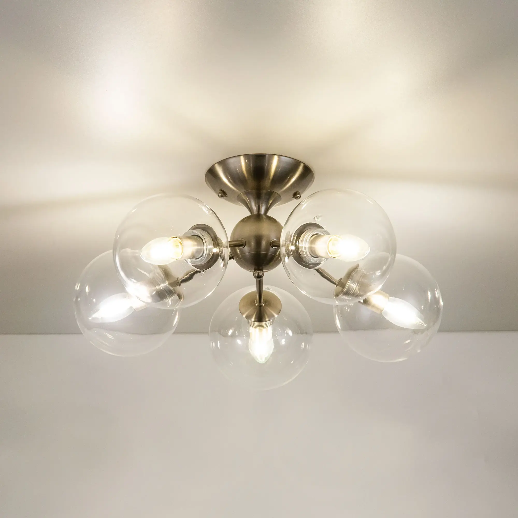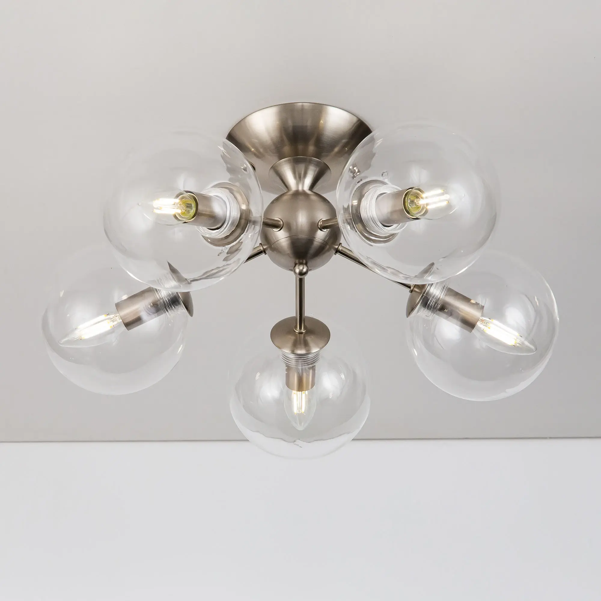 Потолочная люстра CL102151 с пятью плафонами. Корпус люстры изготовлен из металла, цвет матовый хром. Плафоны стеклянные в форме шара, прозрачные. В люстре используются 5 ламп с цоколем Е14 мощностью 40 Вт. Суммарная мощность люстры 200 Вт при использовании ламп накаливания. Площадь освещения около 12 кв. метров. Люстра крепиться к потолку на планку, крепеж в комплекте,