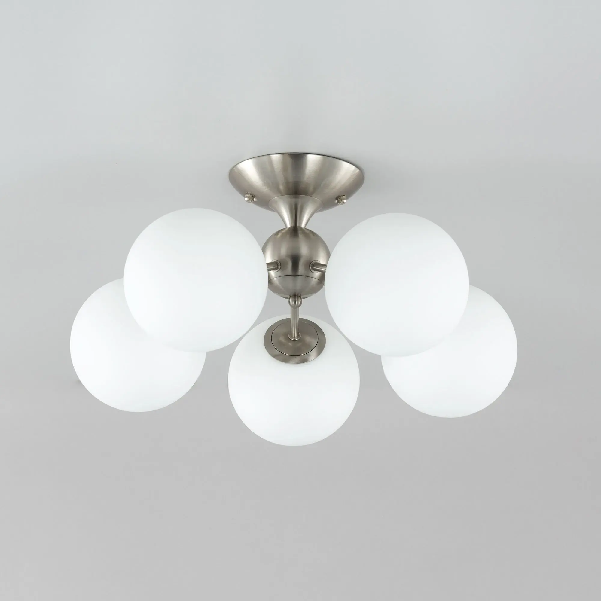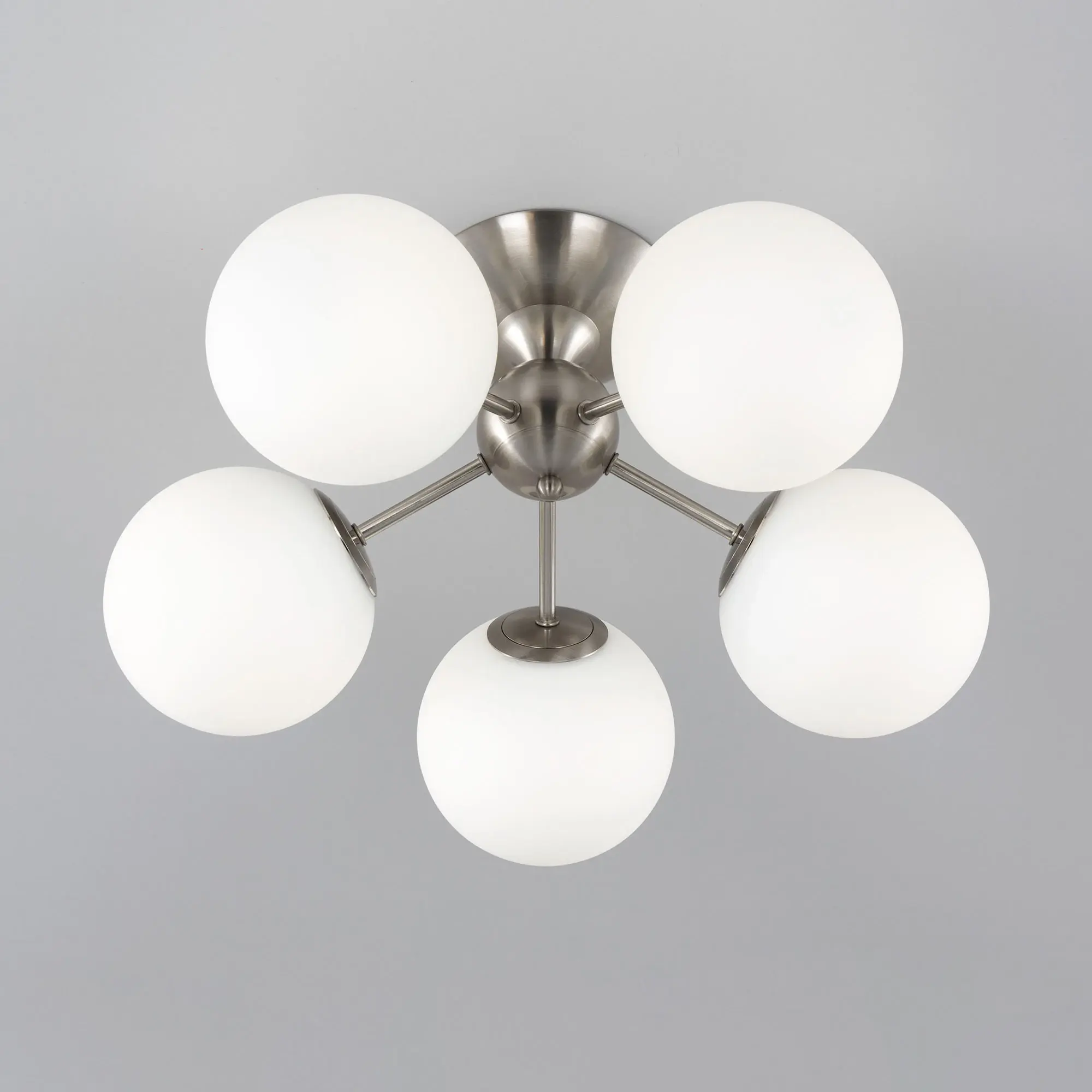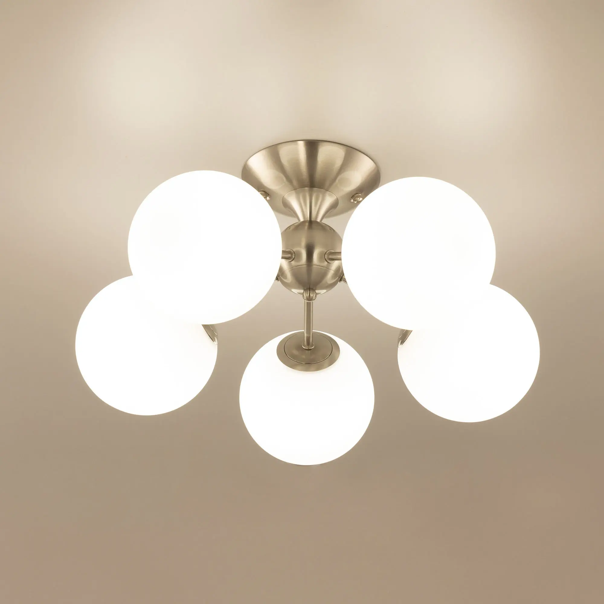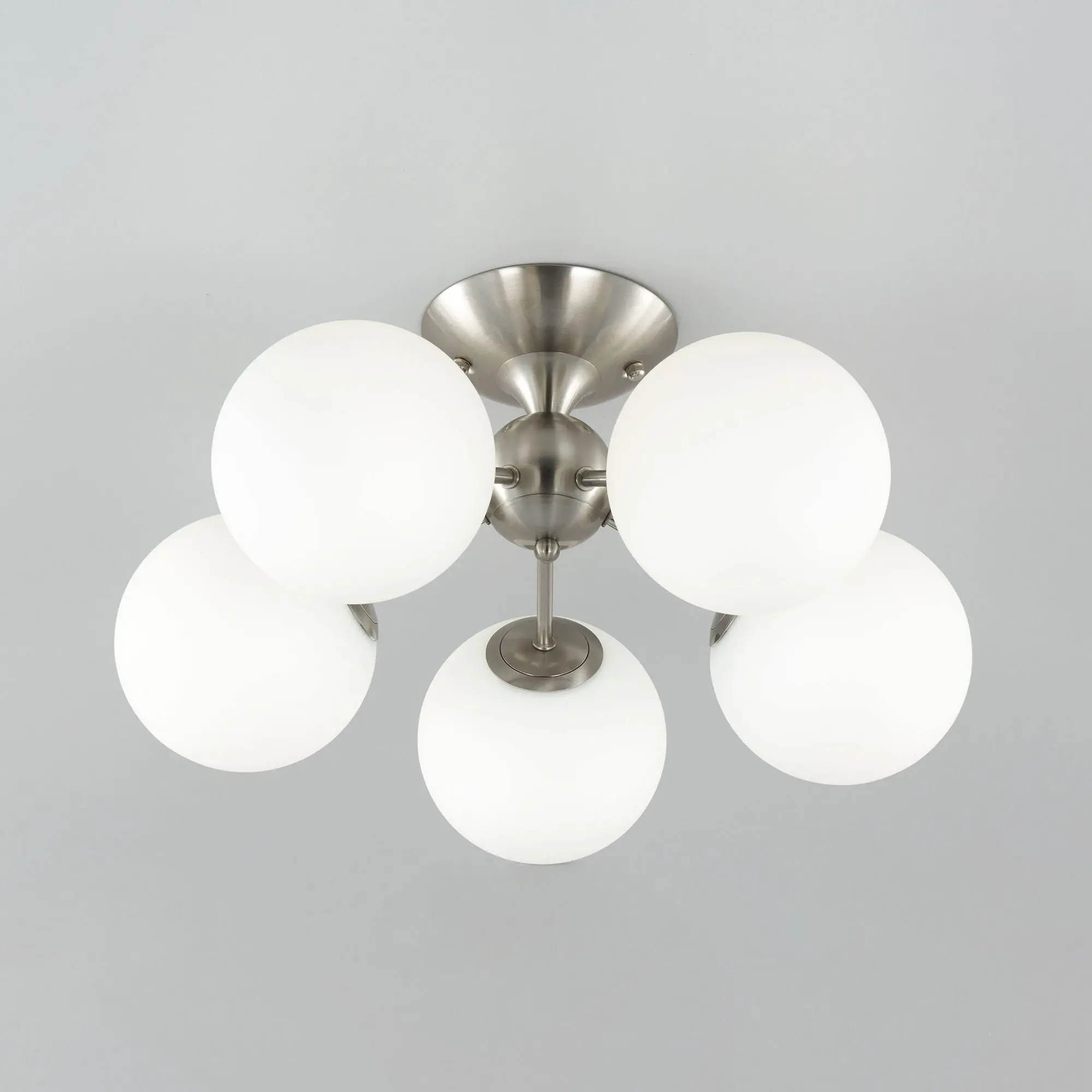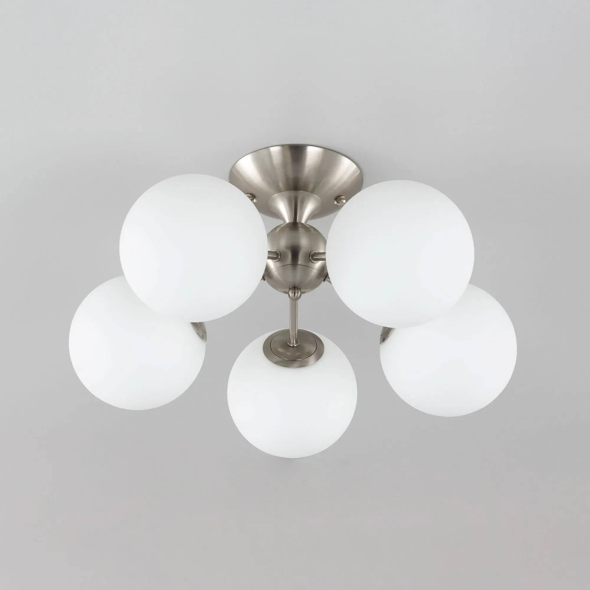 Потолочная люстра Citilux Томми CL102154 для интерьеров, оформленных в современном стиле. Корпус металлический, цвет матовый хром. Плафоны стеклянные, в форме шара, цвет белый матовый. В изделии 5 ламп с цоколем Е14, максимальной мощностью для ламп накаливания 40Вт. Светодиодные лампы можно использовать более яркие. Площадь освещения около 12м². Модель подходит для всех типов потолков, в том числе натяжных. Тип крепления-планка.